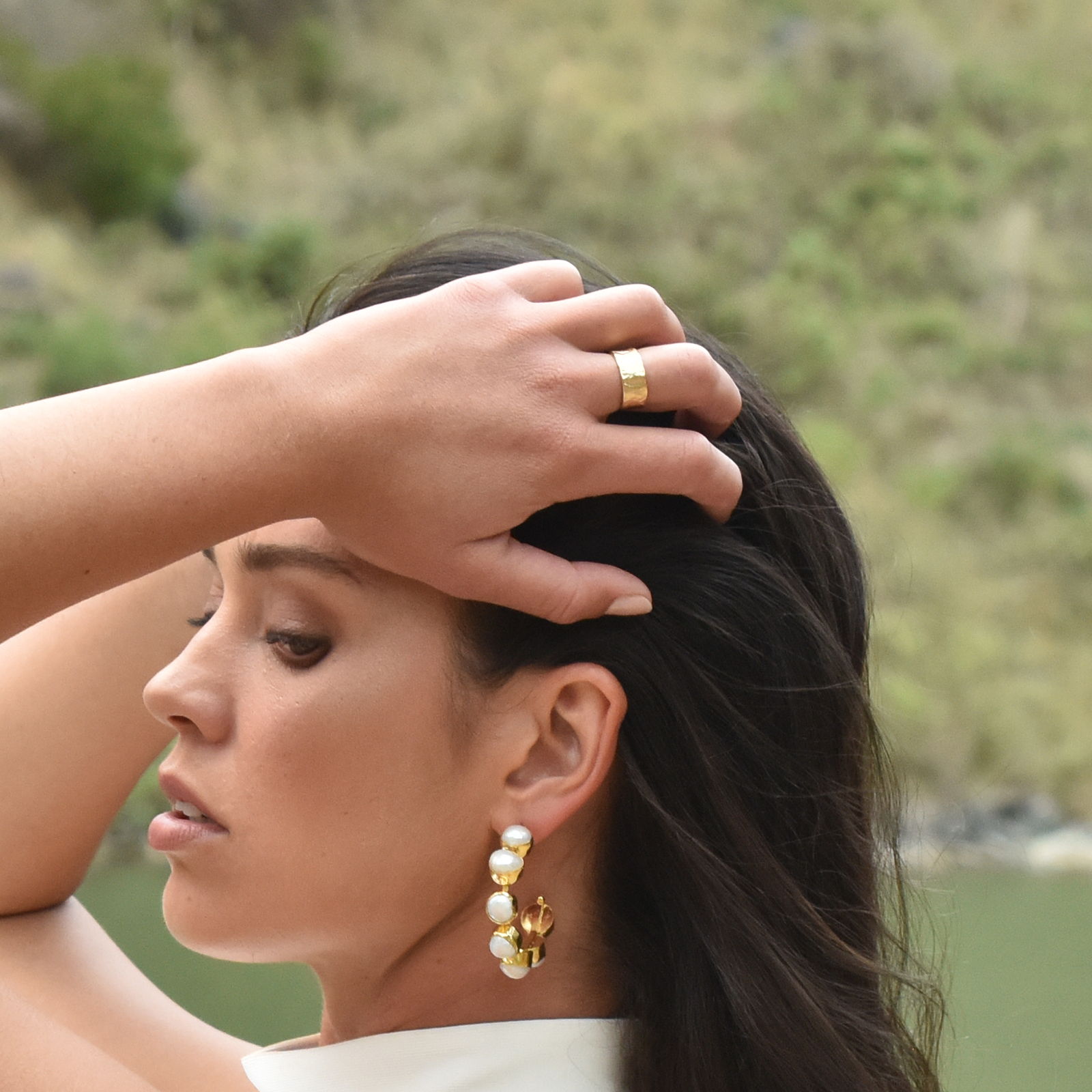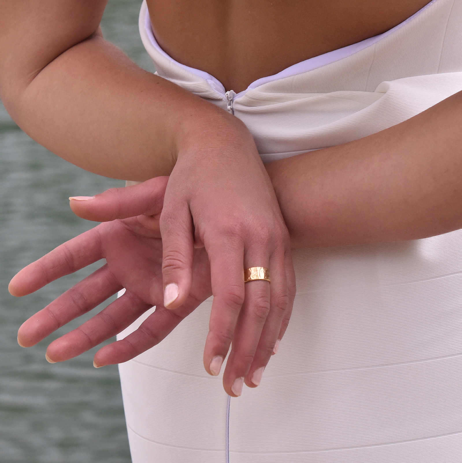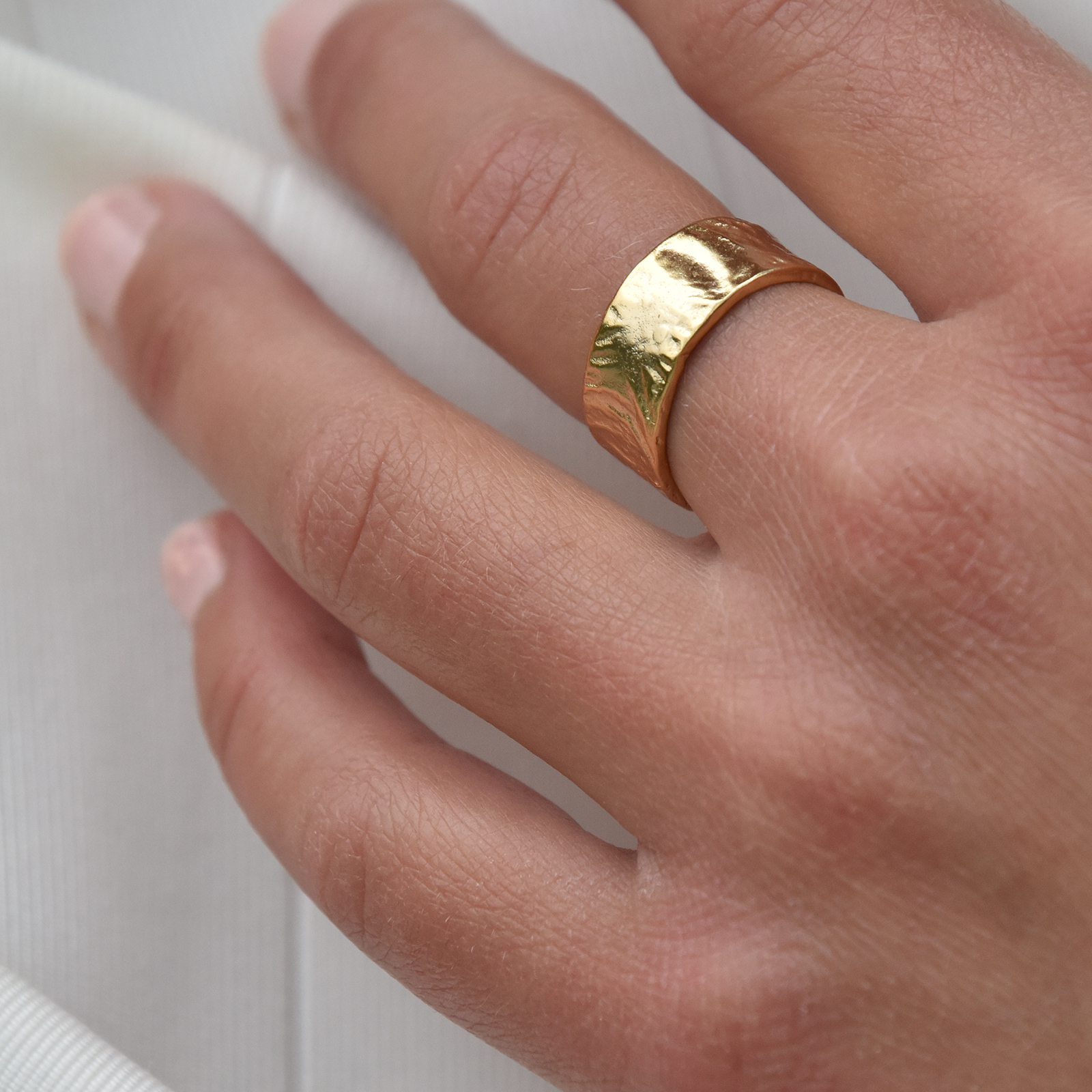 Subtle raw textures exhibiting modern jewellery craftsmanship. Introducing Dionne Artisan Gold Vermeil Open Ring - a contemporary artisan finger beauty for modern muses who appreciate art and uniqueness. This ring is inspired by textured art and crafted in solid sterling silver with 2.5 microns of 18K gold plating (to Gold Vermeil Jewellery standards). It features a raw textured surface on both outer surface and inner surface of the ring band. This ring comes with a default inner diameter of 18mm. It can be easily adjusted manually for the best fit. Perfect for modern, artsy, contemporary, casual, everyday day wear and more. Hypoallergenic, nickel, cadmium and lead free. Allergy free.