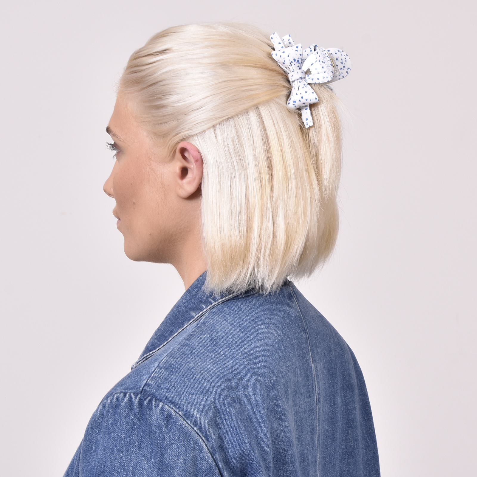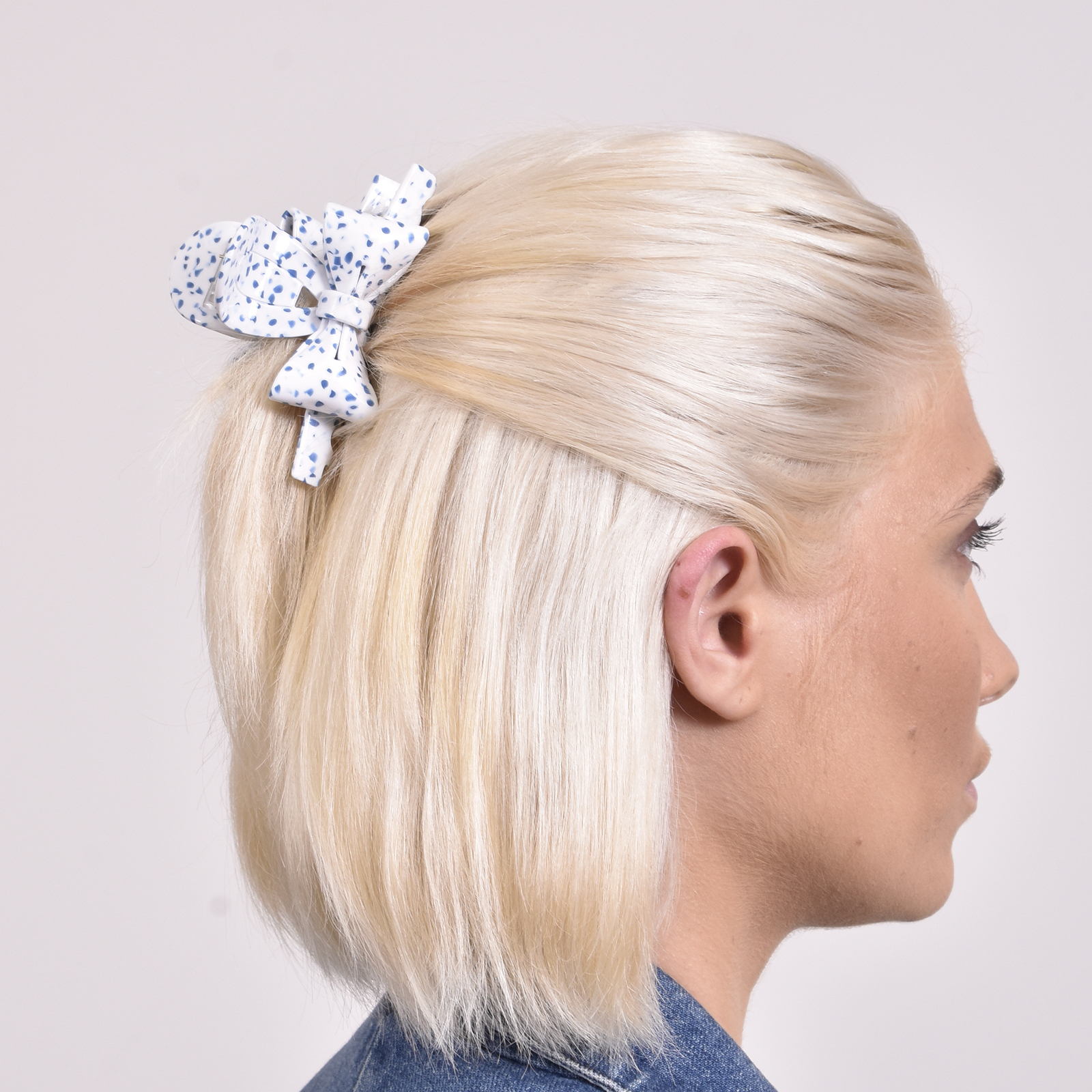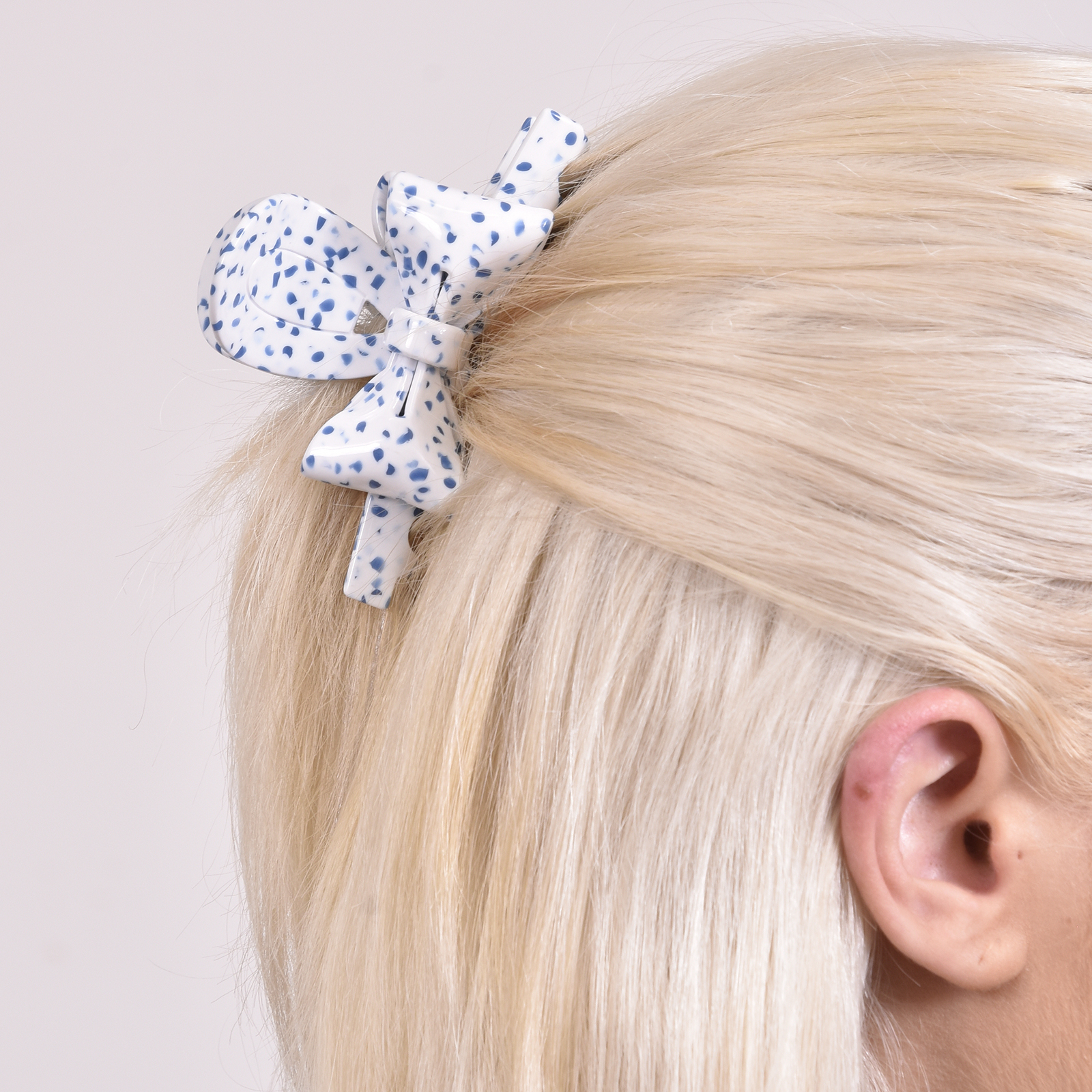 Embrace your inner girl. Introducing Doli Bow Hair Claw - a chic and playful hair cutie for bow lovers. This hair claw is made of thickened acrylic in an off-white base colour decorated with blue splotches. This claw is approximately 95mm in length and features one bow on each side of the claw. It offers a solid grasp of hair. Suitable for modern, retro, chic, feminine, girly, smart casual, casual, and everyday wear.