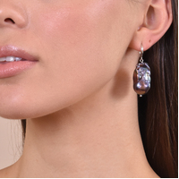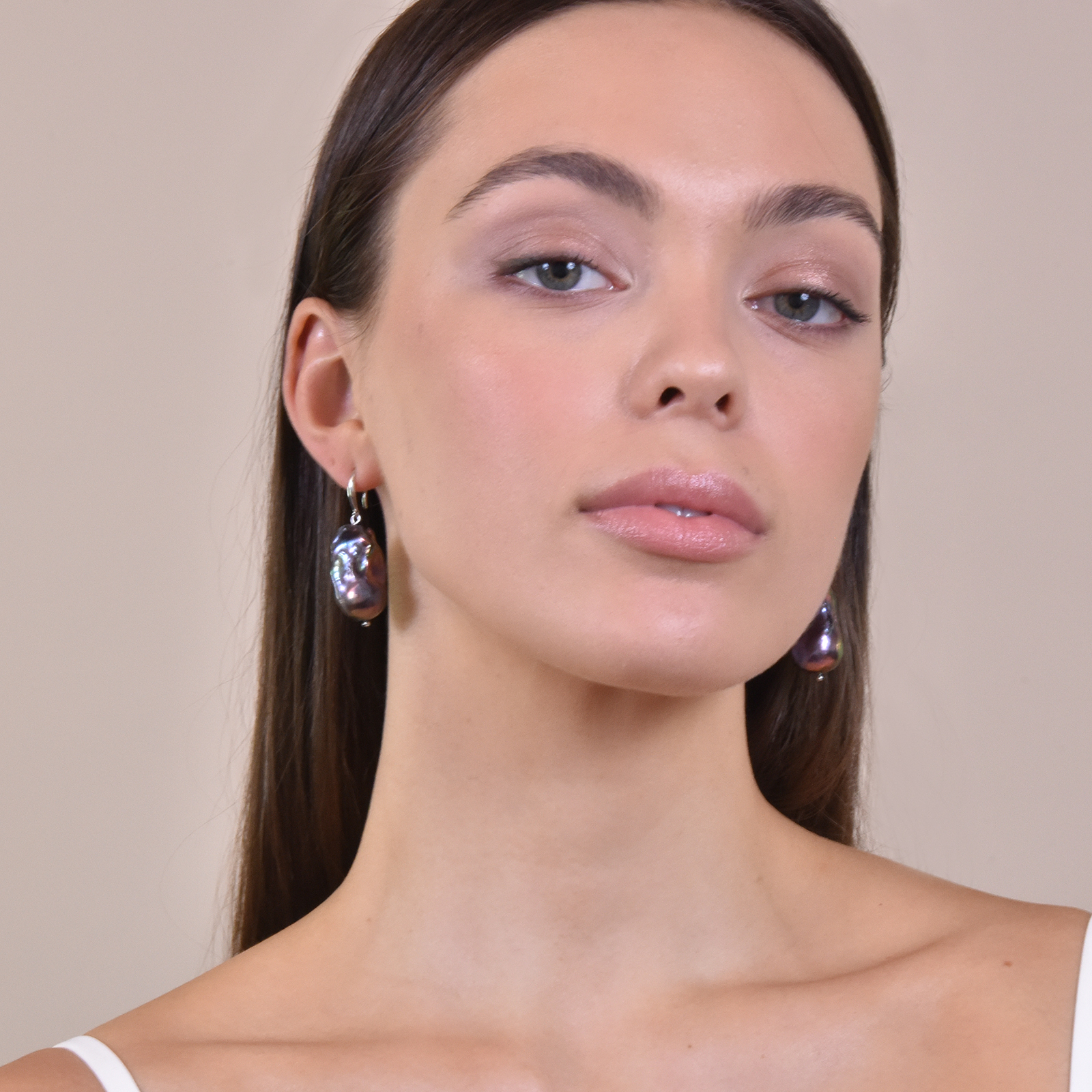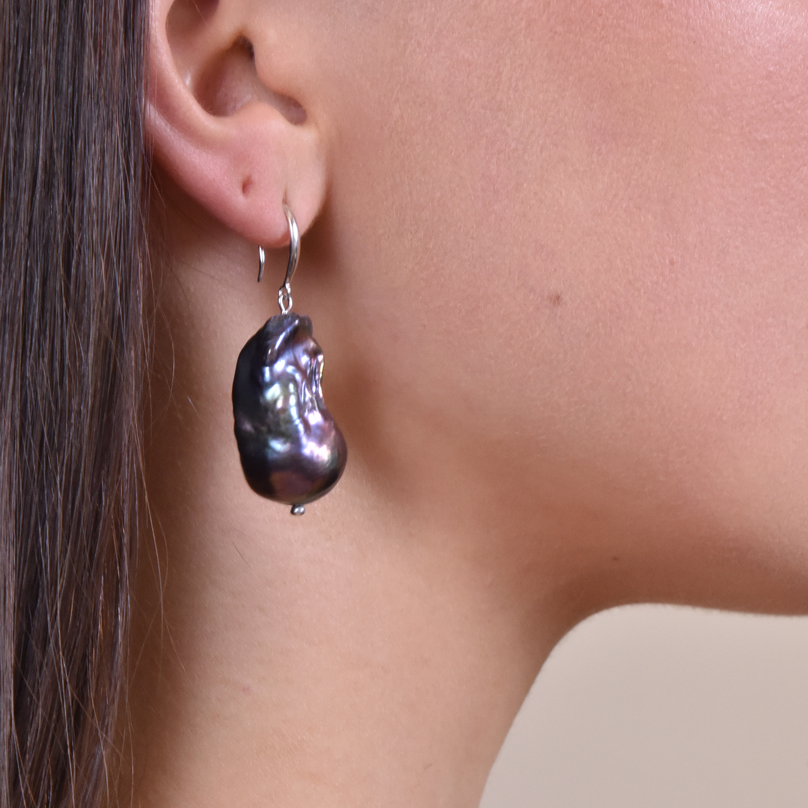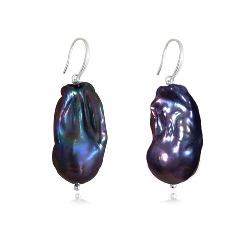 Authentic natural dark pearl beauty for your timeless styling. Introducing Ebony Mediterranean Dark Baroque Pearl Earrings — an extravagantly elegant pearl drop design for pearl lovers who fancy something different. This design features natural mediterranean dark baroque pearls (each pearl is around 3cm in length and 1.5cm in width), which are known for high shine and unique colour-changing lustre. The pearls are of a deep purple tone which can change shades under sunlight. The earring hooks are made of smoothly polished solid sterling silver. A classy and noble pearl beauty that stays in trend. Perfect for modern, vintage, coastal, formal, semi-formal, dressy, beach, smart casual styles and more. Hypoallergenic, nickel, cadmium and lead free.