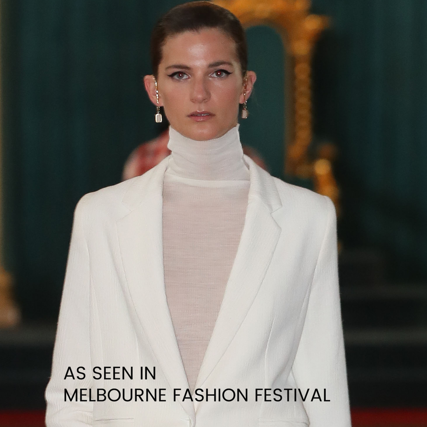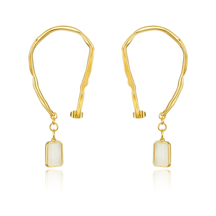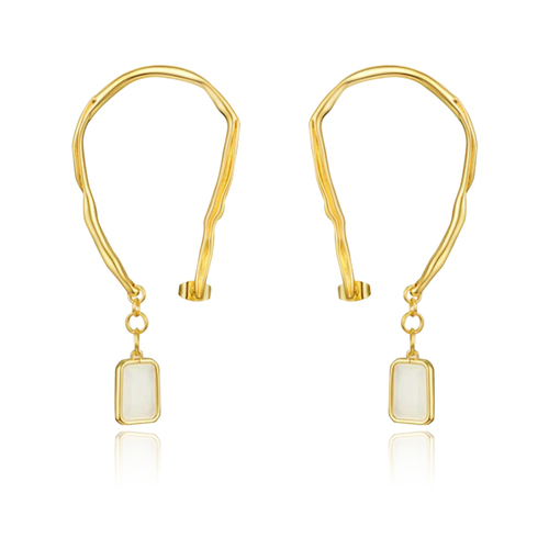 Head-turning statement with a modern edge. Introducing Echo Artsy Ear Frame Earrings - a contemporary line art inspired statement for lovers of uniqueness and quirkiness. This design features an ear-shaped frame which sits behind your ear whilst the post is inserted through the front of your normal earlobe piercing. On the end that sits behind your ear dangles a semi-precious stone set in a gold frame. The earrings are made of quality titanium steel with rich 18K gold plating, giving the earrings a luxurious gold shine that endures. Perfect for modern, artsy, high fashion, creative styling, runway, smart casual styles and more. Hypoallergenic, nickel, cadmium and lead free.