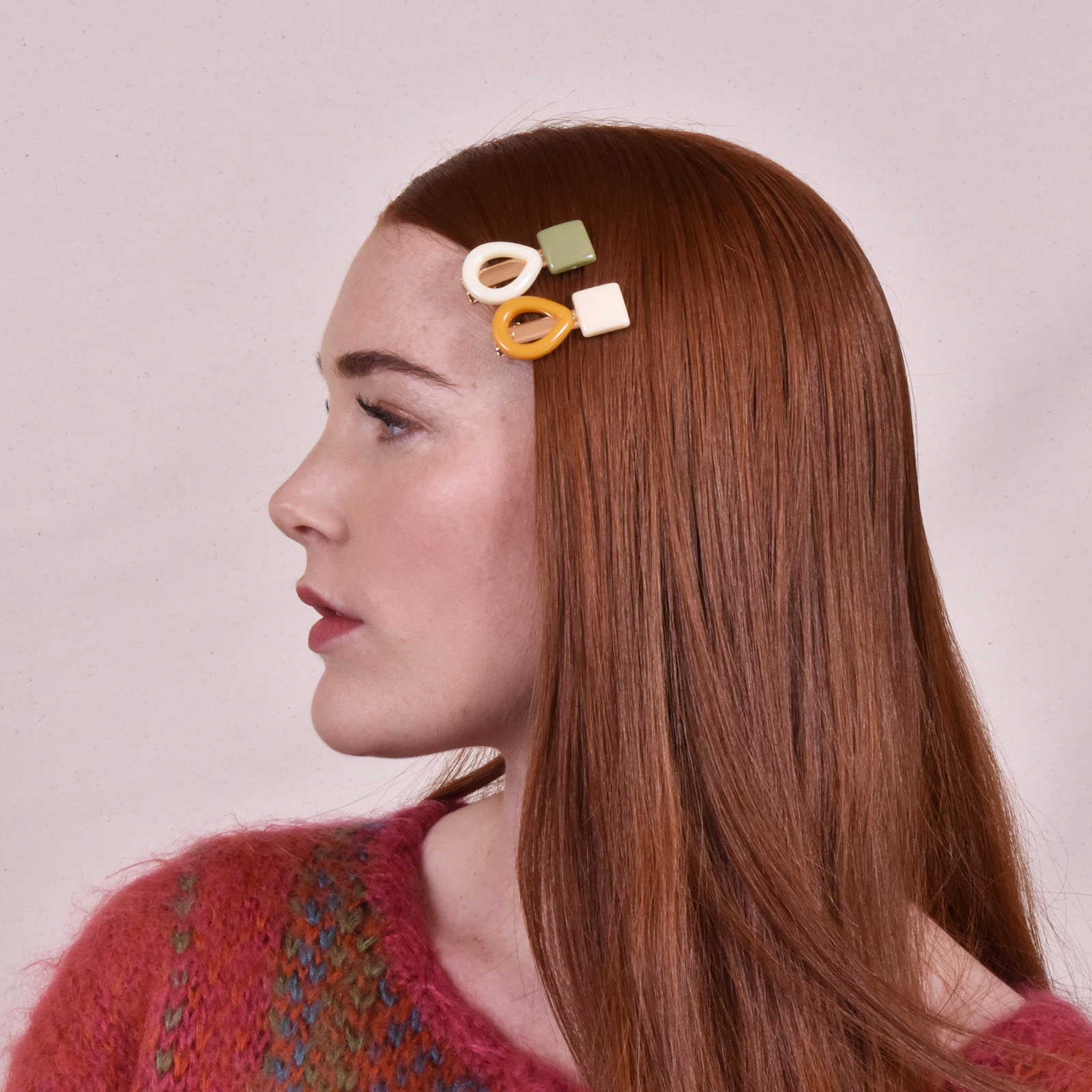 Bright, vintage, and girly. Introducing Effie Retro Pastel Barrette Set – an adorable hair accessory for pastel lovers. The barrette set features a pair of gold-tone metal clip, decorated with an oval and square shape in mint and tangerine colours - adding a subtle vibrance to your styling. Perfect for modern, vintage, chic, girly, casual styles and more. Suitable for kids and teens.