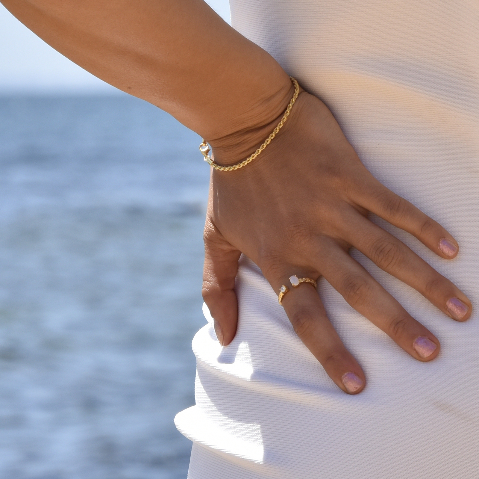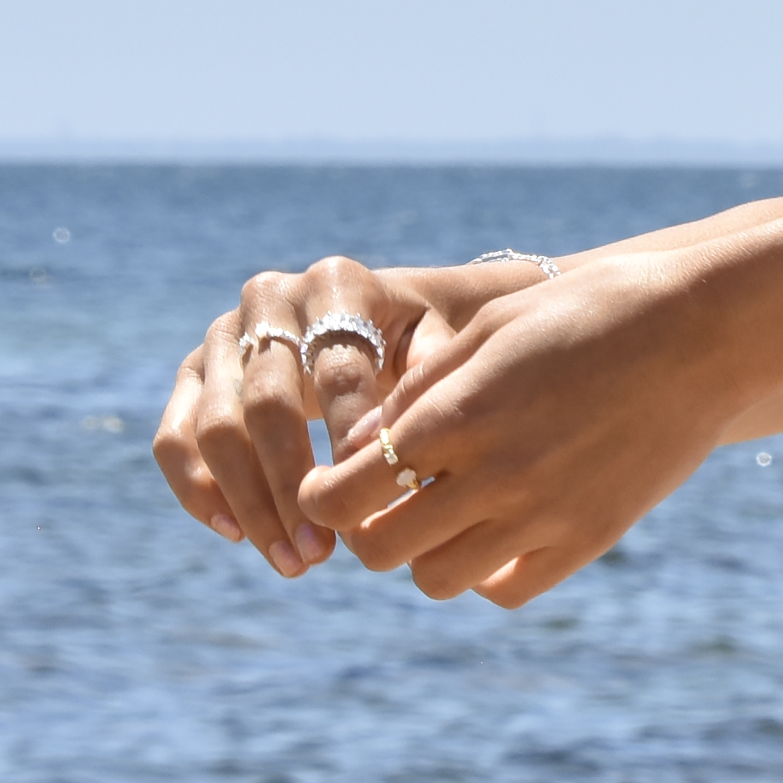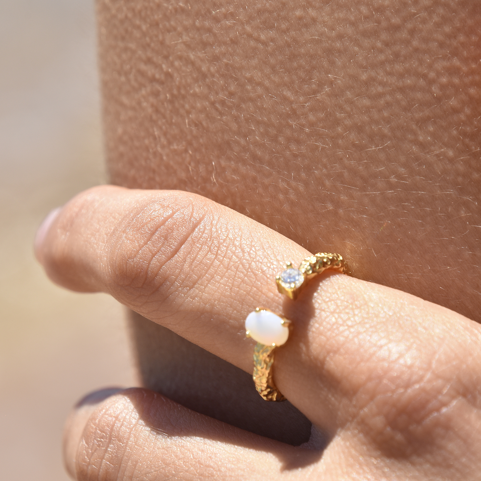 Artsy, texture-rich and unique. Introducing Eislyn Twin Zircon Open Ring (Gold Vermeil) - an artisan crafted finger beauty adorned with a cloudy zircon and a clear Austrian zircon. This design features a textured solid open ring band with two types of zircons embedded at the open ends - blending soft feminine energy with a subtle strength. The ring is crafted in solid sterling silver with 2.5 microns of 18K gold plating (to Gold Vermeil Jewellery Standard) for hypoallergenic and enduring wear. Due to the softness of sterling silver, this ring can be easily adjusted manually for the best fit. An elegant and creative finger art perfect for those who appreciate uniqueness and high quality. Hypoallergenic, nickel, cadmium and lead free.
