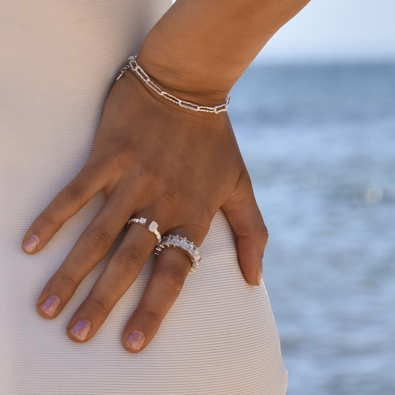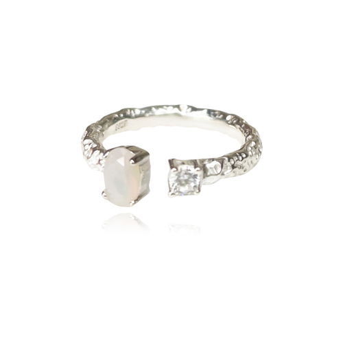 Artsy, texture-rich and unique. Introducing Eislyn Opal Zircon Open Ring (Silver) - an artisan crafted finger beauty adorned with a cloudy zircon and a clear Austrian zircon. This design features a textured solid open ring band with two types of zircons embedded at the open ends - blending soft feminine energy with a subtle strength. The ring is crafted in solid sterling silver with precious white rhodium plating for enduring wear and an extra anti-tarnish protection. Due to the softness of sterling silver, this ring can be easily adjusted manually for the best fit. An elegant and creative finger art perfect for those who appreciate uniqueness and high quality. Hypoallergenic, nickel, cadmium and lead free.