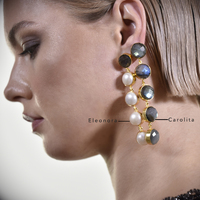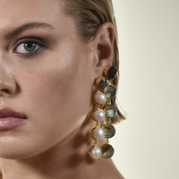 Crystal luxe paired with pearl elegance. Introducing Eleonora Labradorite Crystal Pearl Drop Earrings - an artisan handcrafted crystal and pearl light luxury statement for your elevated formal styling. This design features 2 natural labradorite crystals custom cut in a round shape as the top stones with 4 premium quality natural freshwater pearls (with a 14-15mm diameter) attached to each earring. The crystals and pearls are embed in gold pockets made in environmentally friendly brass with 22K gold plating. The earring posts are made in solid sterling silver with 22K gold plating for hypoallergenic wear. Watch the brilliant green and blue hues of the labradorite crystal flash on different angles with the light, making it magic and enchanting for the eyes. The change of the hues are more noticeable under natural sunlight. An outspoken yet classy piece to cherish and shine for a life time. Perfect for modern, retro, feminine, formal, semi-formal, wedding, bridal, dressy, fashion events, creative styling, smart casual styles and more. Hypoallergenic, nickel, lead, and cadmium free.