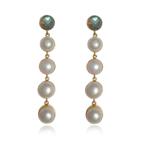 | Made from: | Sterling Silver Earrings Posts (22K Gold Plated)22K Gold PlatingEnvironmentally Friendly BrassPremium Natural Freshwater PearlsNatural Labradorite Crystal |