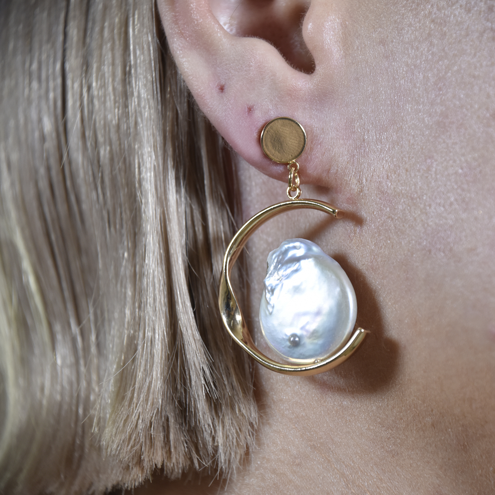Pearl elegance with an open curve. Introducing Eleua Baroque Pearl Drop Earrings - a contemporary style pearl drop love for a chic and effortless glam-up. This design features open C hoop drops with baroque pearls perched at the bottom of the curve. The pearls used in this design are flared and flat shaped natural baroque pearls. The earrings are crafted in environmentally friendly brass with 18K gold plating. A classy yet creative pearl love perfect for modern, feminine, chic, coastal, bohemian, bridal, bridesmaids, formal, semi-formal, smart casual styles and more.