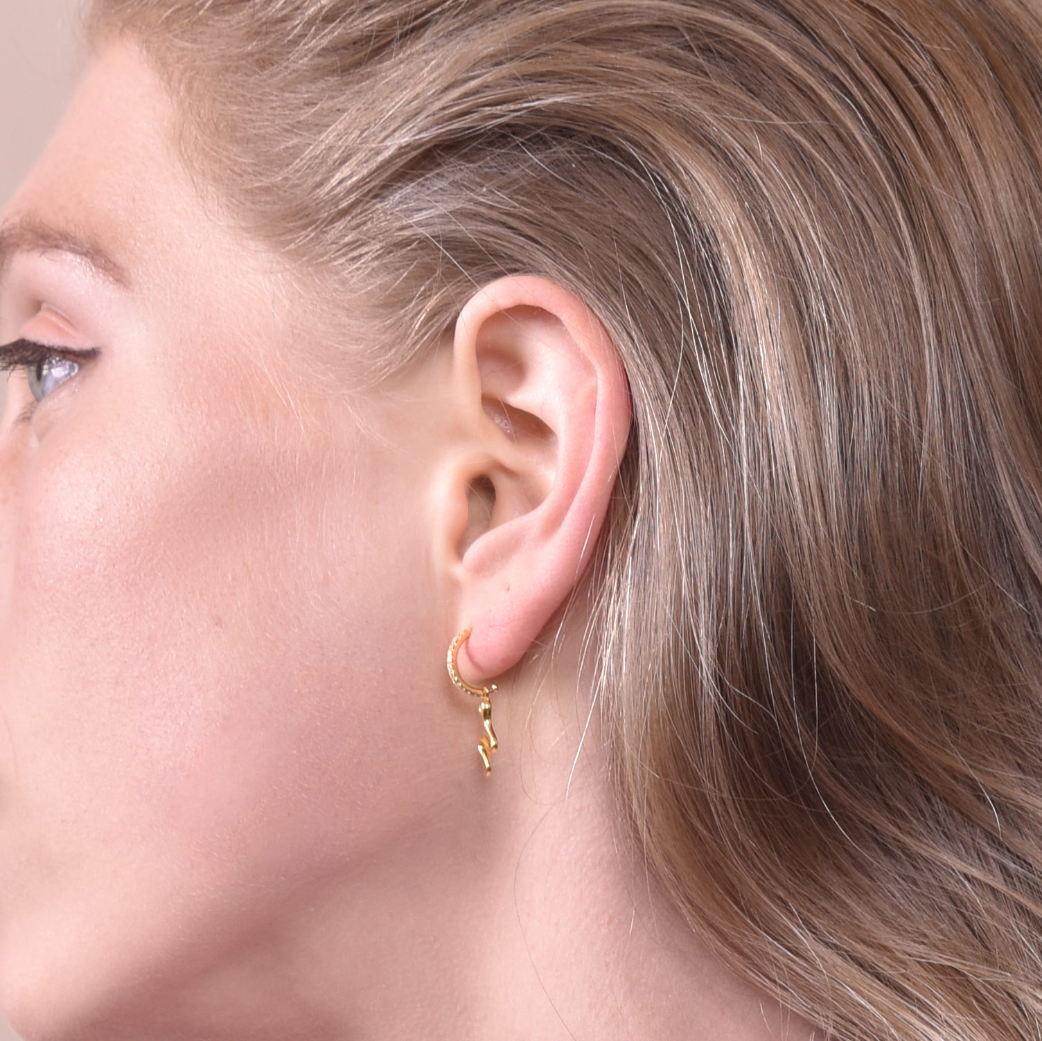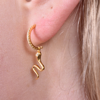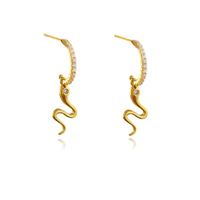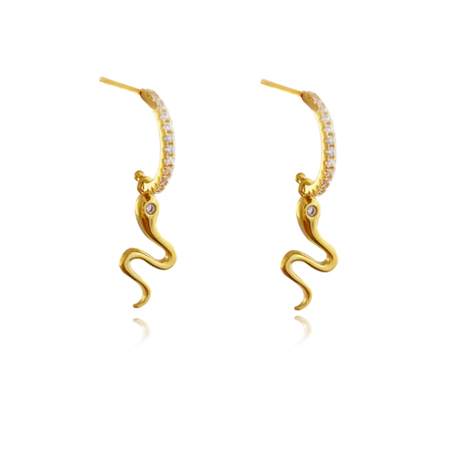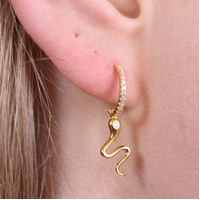 Dainty style with a zestful attitude. Introducing Elga Gold Filled Snake Drop Earrings - a delicate and slightly edgy ear love for lovers of fine styles. This design features smoothly polished snake drops attached to gold C hoops embellished with inlaid Austrian cubic zirconias. The earrings are made of solid sterling silver with 18k filled gold, forming a much thicker gold bond to the metal. Suitable for women and girls of all ages. Perfect for modern, chic, punk, minimalist, earring multi-layering, earring mismatching, smart casual, casual, everyday styles and more. Hypoallergenic, nickel, cadmium and lead free.