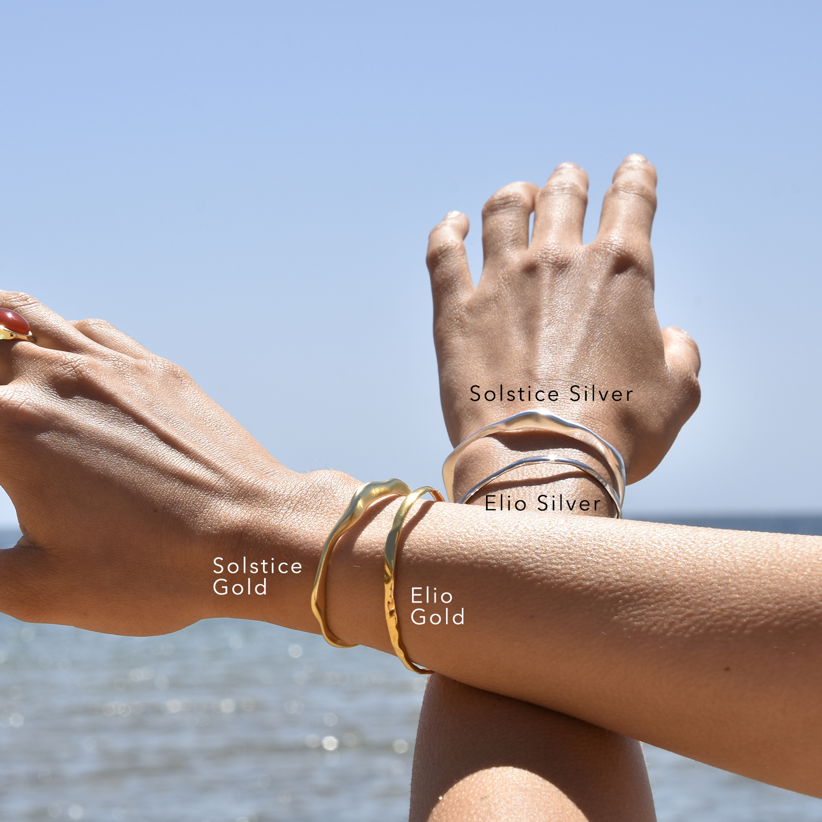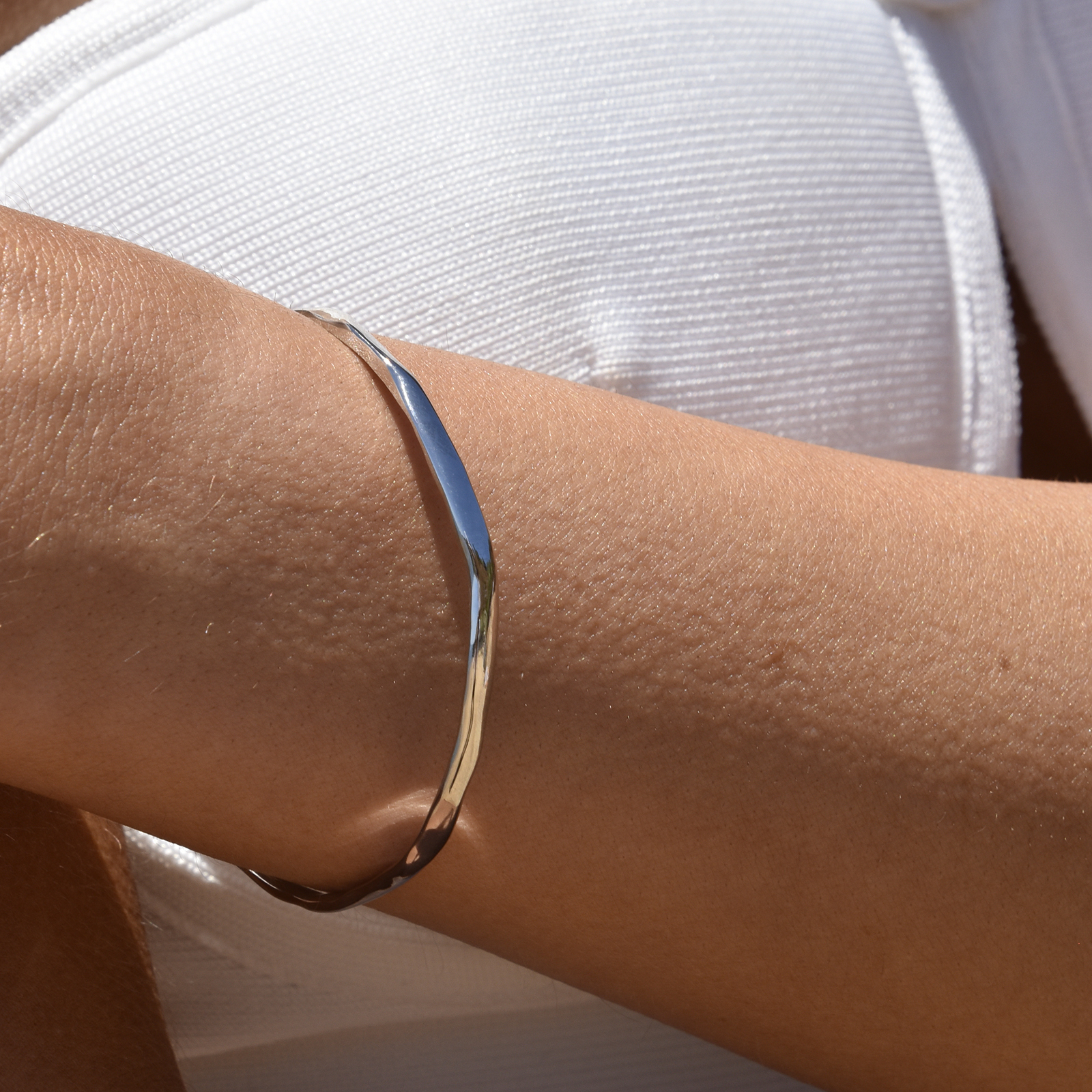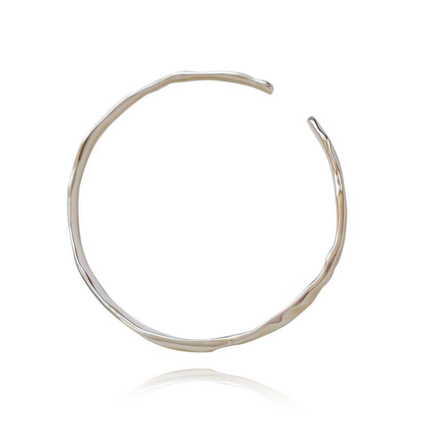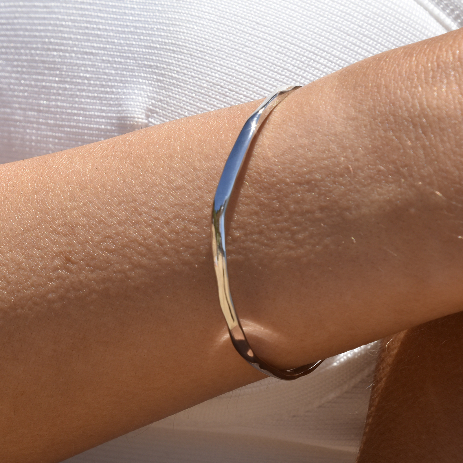 Quality and style reflected in subtle details. Introducing Elio Artisan Solid Bangle (Silver) - a contemporary style wrist love for your classy and timeless styling. This design features a solid open bangle with a wavy finish smoothly polished, which creates a subtle flow and movement especially in the sunlight. This bangle is crafted in solid sterling silver with rhodium plating for an extra anti-tarnishing protection and durable wear. The bangle is smoothly polished with a luxurious gold shine that endures. Perfect for modern, artsy, minimalist, high fashion, smart causal, casual styles and more. Due to the softness of solid sterling silver, this bangle can be easily adjusted manually for the best fit. Great for a unique gift to those who appreciate high quality and styles. Hypoallergenic, nickel, cadmium and lead free.