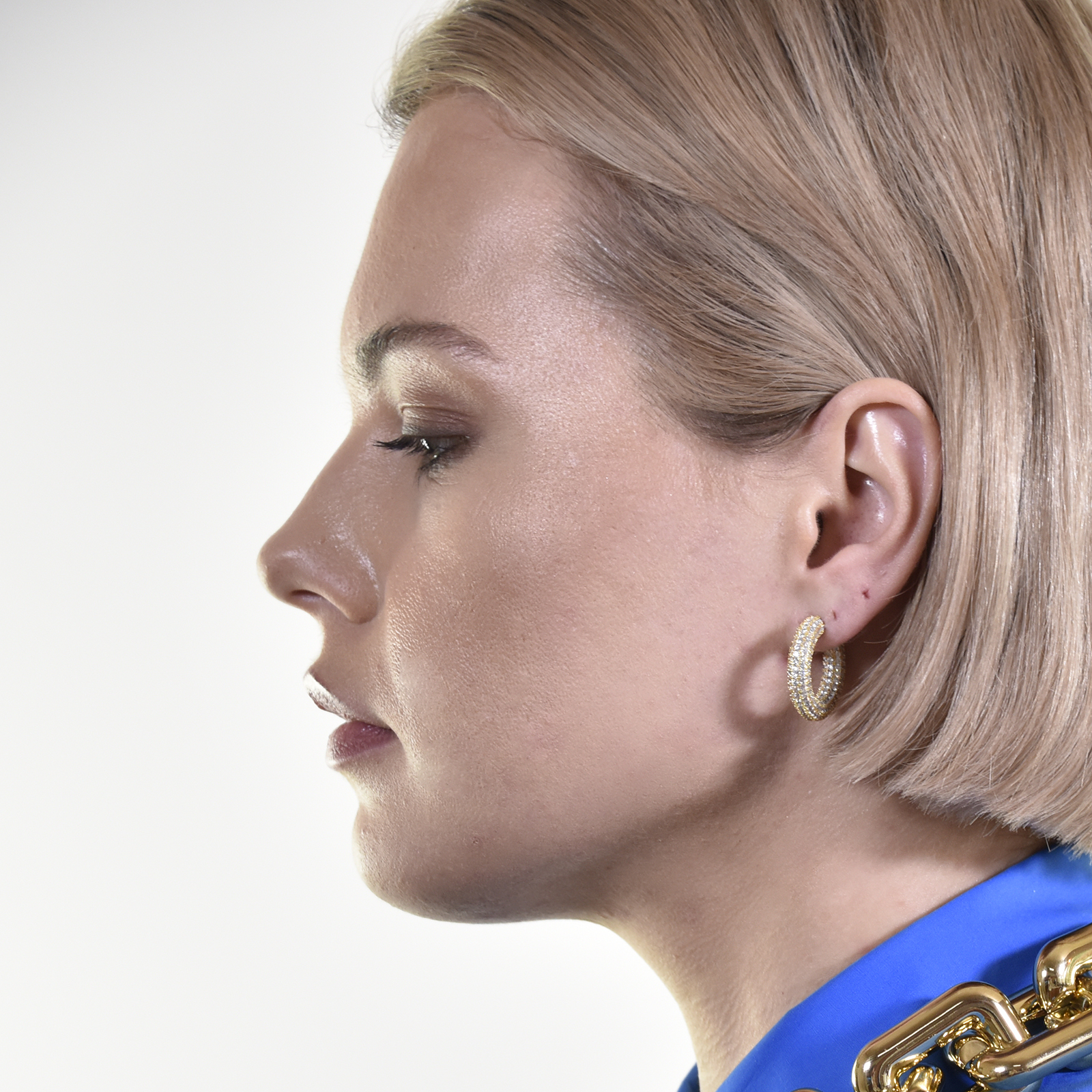 Chic glamour with full sparkles. Introducing Elior Diamnate-embellished Hoop Earrings (Gold) - when timelessness meets shimmering luxe. This design features a classic hoop earring style adorned with inlaid Austrian cubic zirconias. The earrings are made in environmentally friendly brass with 18k gold plating with a subtle gold hue hugging through the zirconia stones. The earrings are made solid (not hollow) with a quality weight. A versatile earring style for dress-ups and dress-downs. Perfect for modern, retro, chic, glamorous, feminine, earring layering, minimalist, smart casual, casual style and more. Hypoallergenic, nickel, lead, and cadmium free.