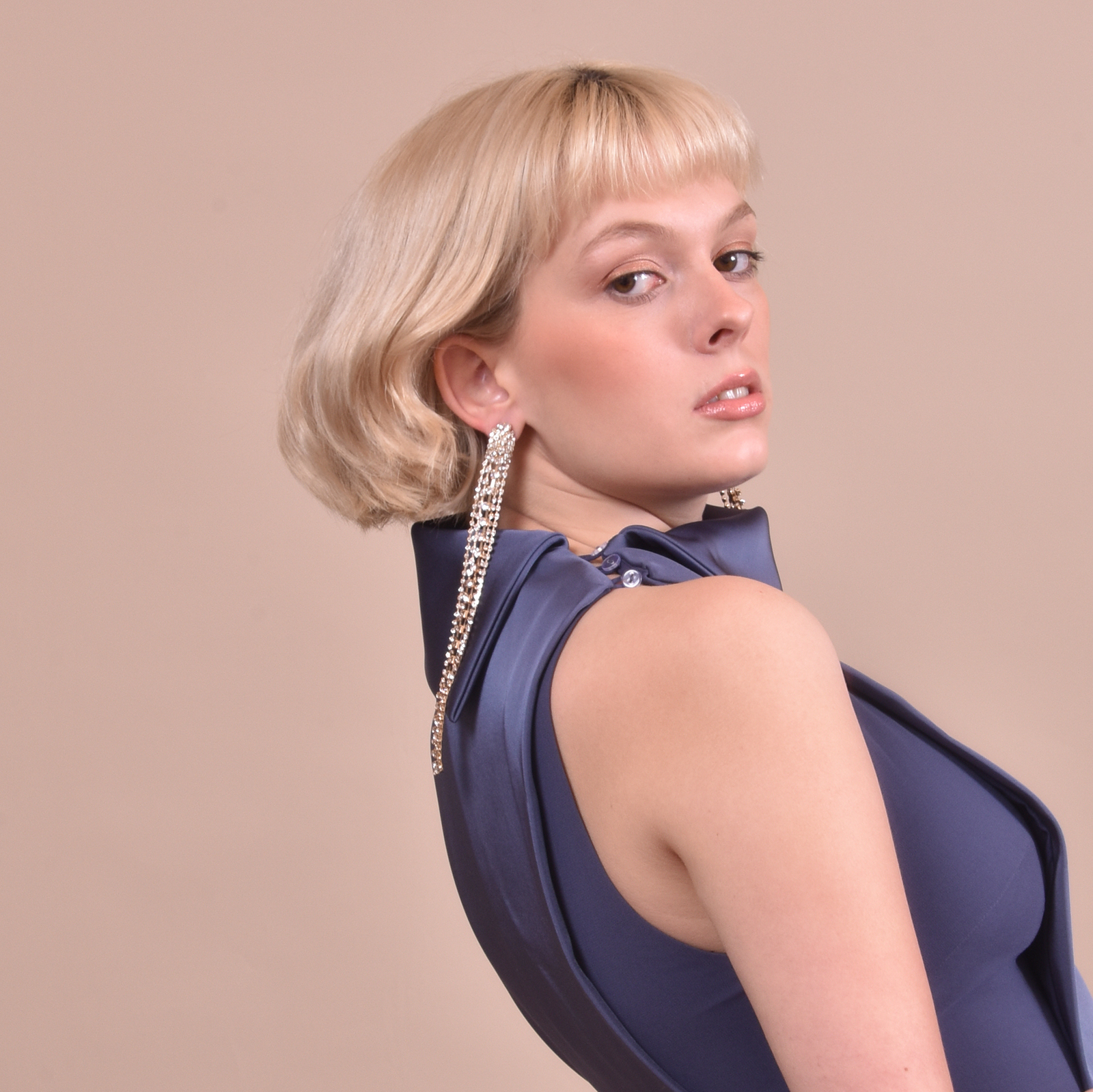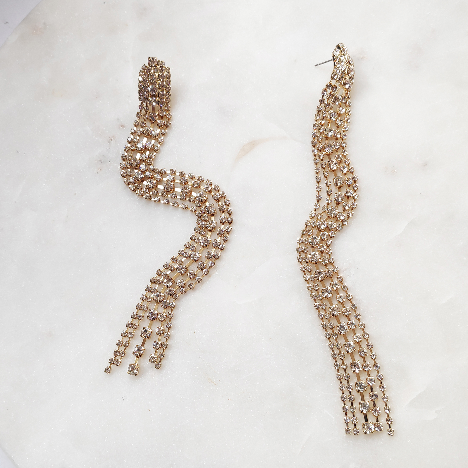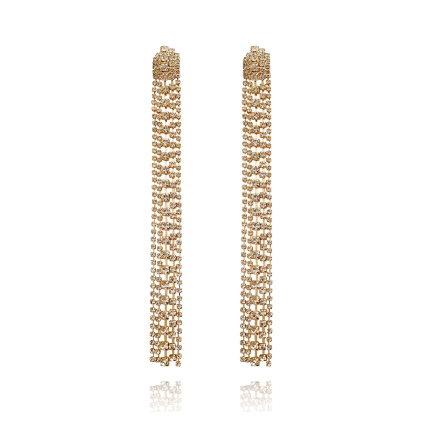 Elegance splashed with shimmering gold. Introducing Elizabeth Diamante Gold Tassel Earrings — a stunning and glamorous statement for a high fashion touch. This eye-catching design is crafted in environmentally friendly stainless steel (nickel free) with 18k gold plating, embellished with 5 strings of clear crystal diamantes. The tassels form an illuminating drop from your ears and shimmer along as you move. Perfect for dressy, formal, semi-formal, wedding, bridal, high fashion, racing, runway, chic, modern, vintage styles and more. Hypoallergenic, nickel, cadmium and lead free.