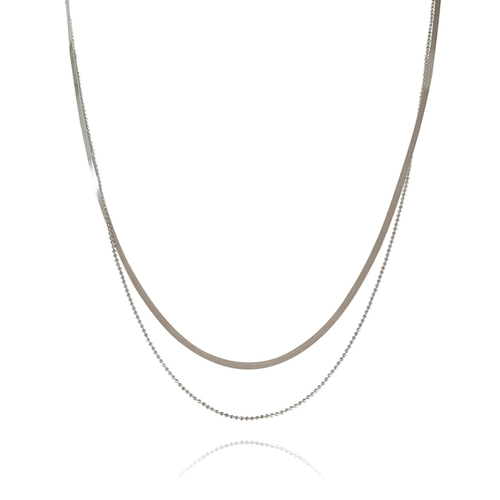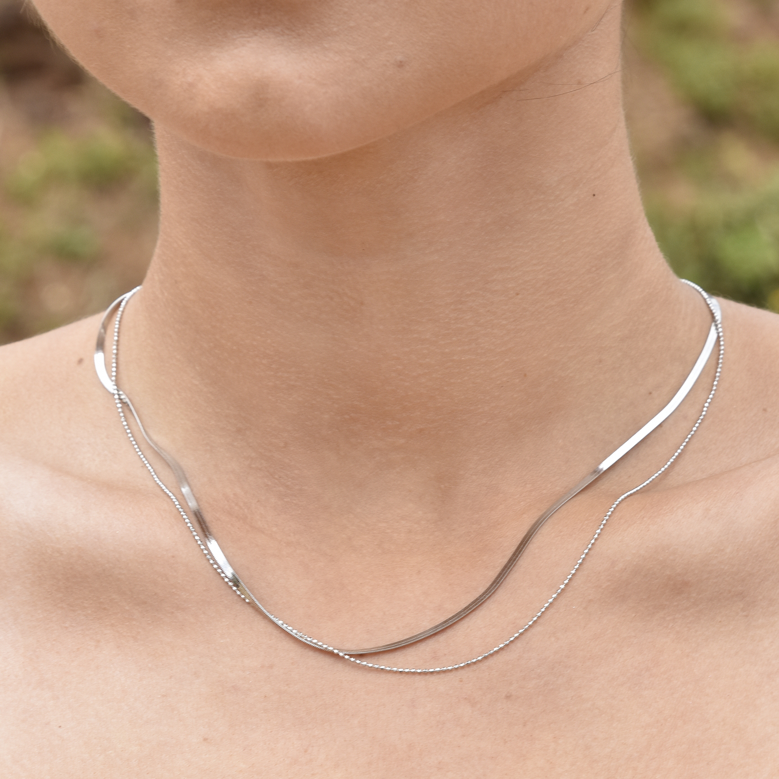 Modern and simple for a chic layering. Introducing Ellamae Fine Dual Chain Necklace (Silver) - a contemporary style fine neckpiece for your elevated everyday styling. This design features a dual layer neckpiece with one snake chain and one fine beaded chain. The necklace is made of solid sterling silver. It is 44.5cm long including a 3.5cm adjustable link, allowing for a more flexible fit. Perfect for modern, chic, minimalist, necklace layering, smart casual, casual, everyday styles and more. Hypoallergenic, nickel, cadmium and lead free.