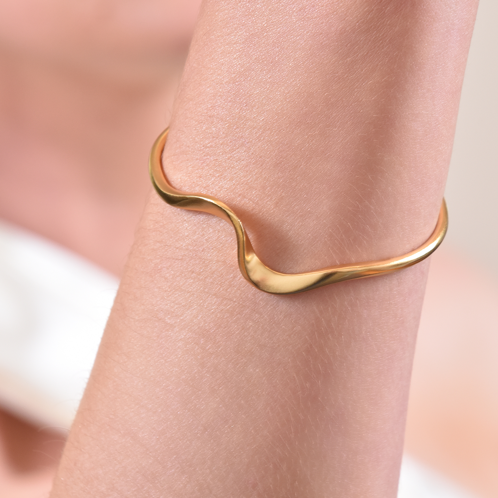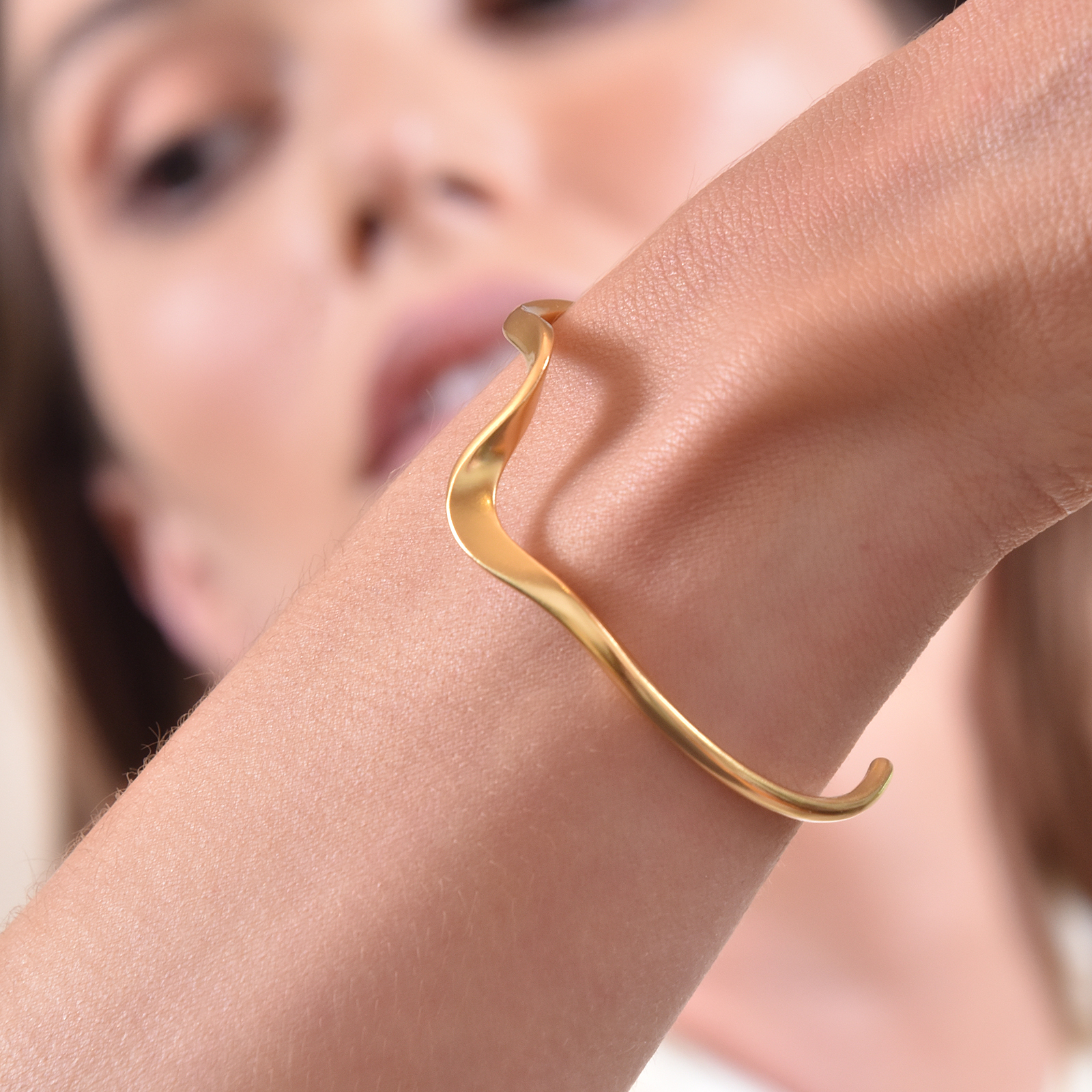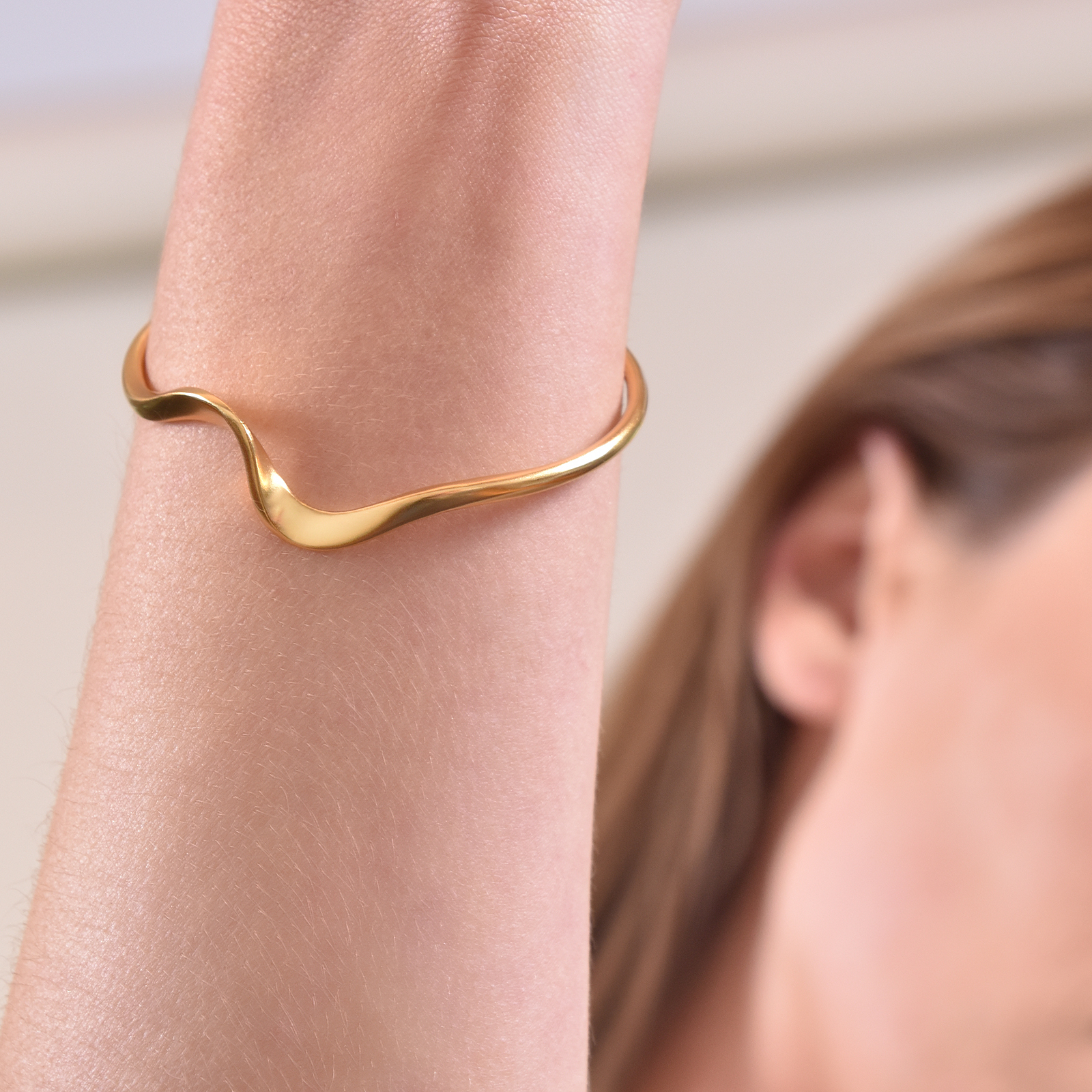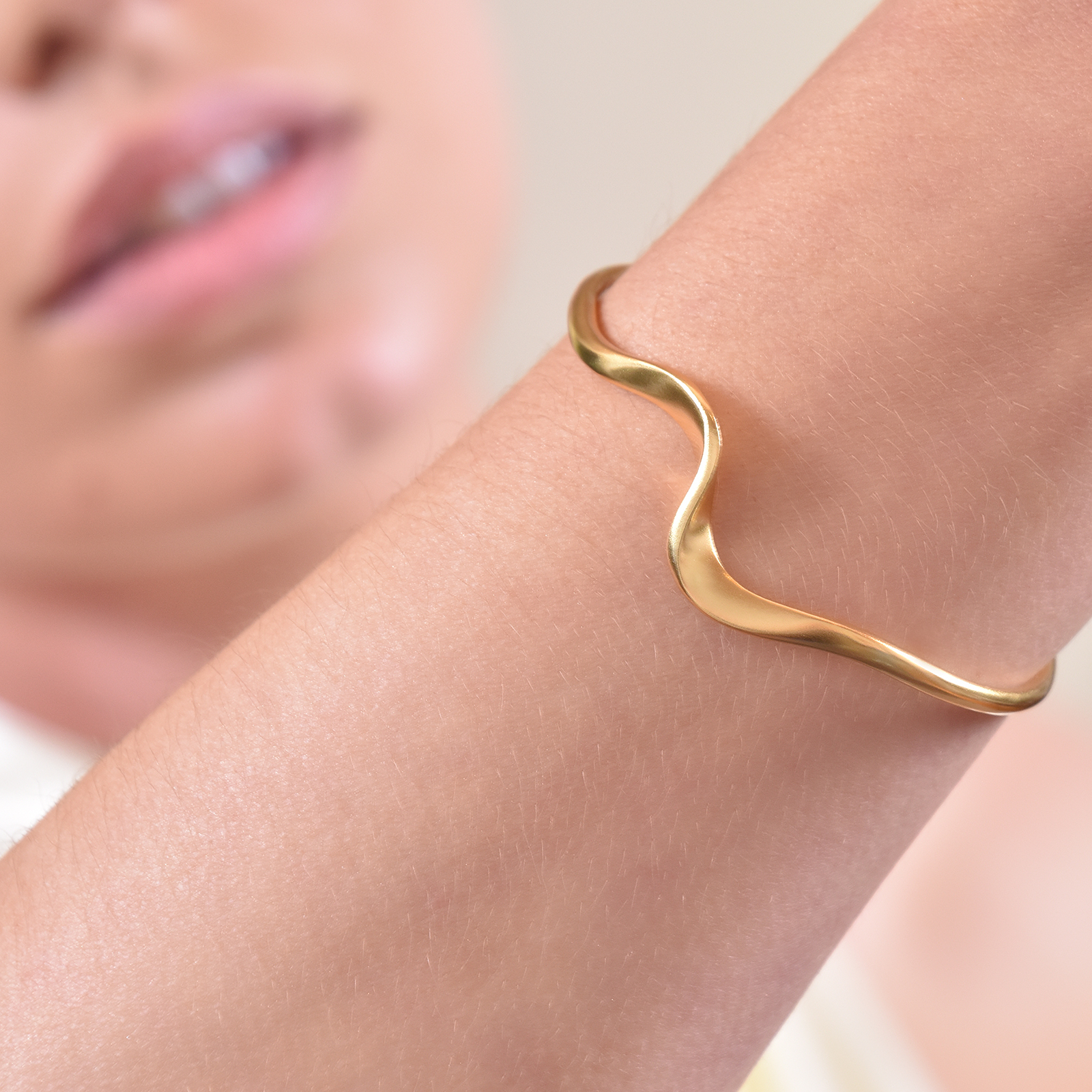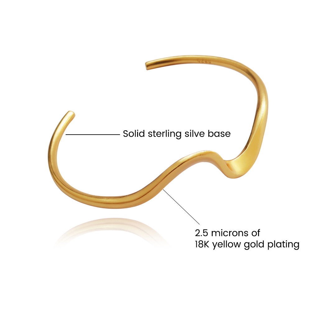 Sold OutInspired by the modern art of simplicity. Introducing Elora Artisan Gold Vermeil Solid Bangle — a classy, stylish and timeless bangle for modern muses. This succinct and creative design is crafted in solid sterling silver featuring a smooth and wavy flow, adding a subtle and elegant movement to your wrist. It is also plated with 2.5 microns of 18K yellow gold plating, giving the piece a gorgeous and luxurious gold shine that is also tarnish resistant. The uniqueness about this piece is that it is open and can be adjusted manually for the best fit. An ethical and enduring lifelong keep sake for women and girls of all styles. Hypoallergenic, nickel, cadmium and lead free.