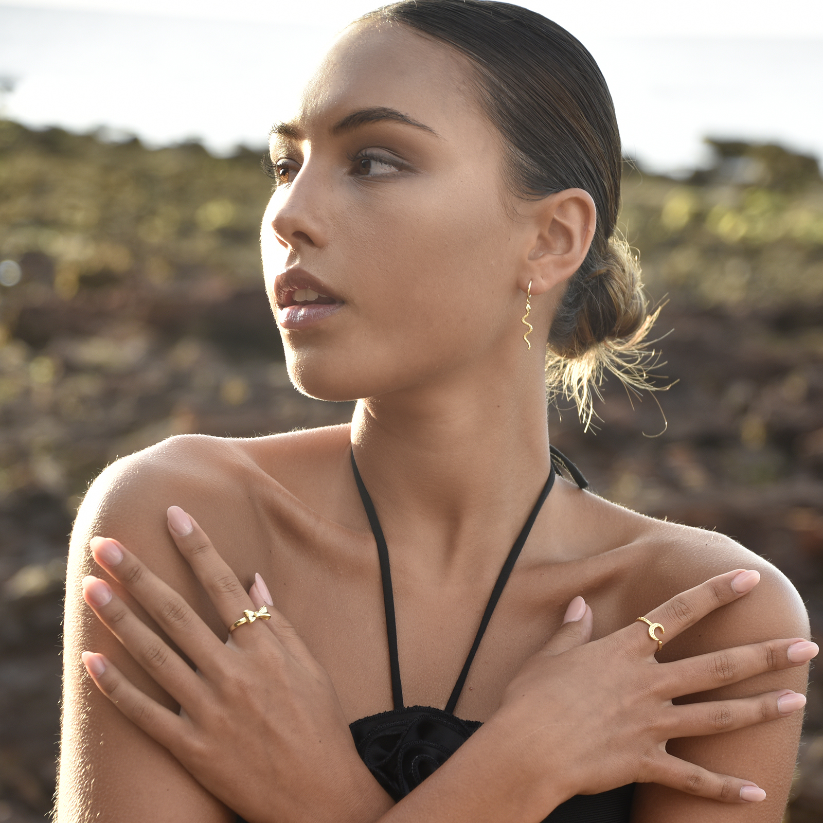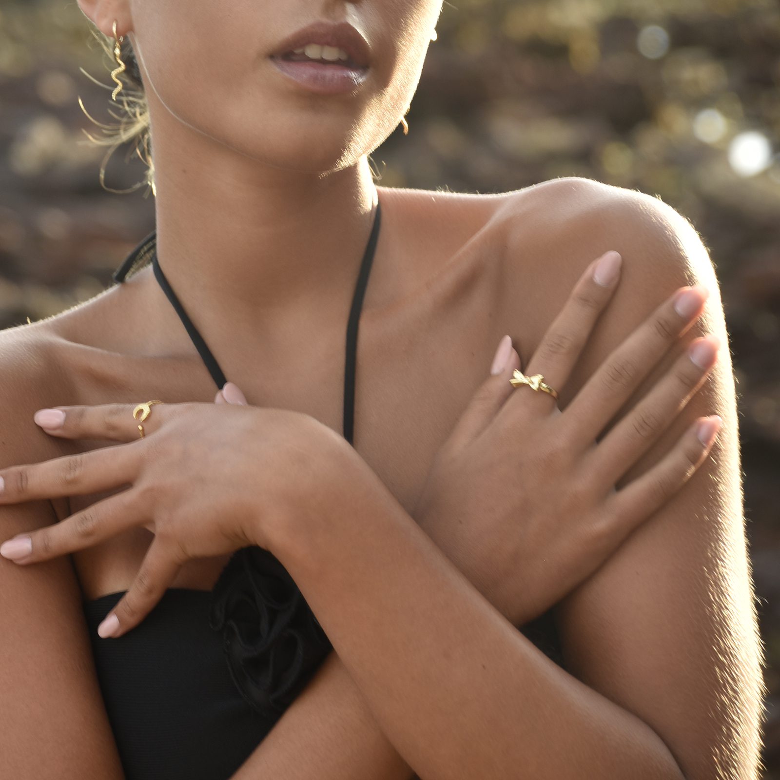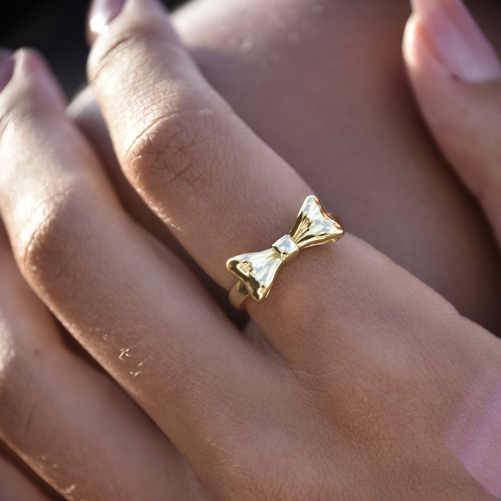 Introducing Elvie Artisan Bow Open Ring (Gold Vermeil) - an artsy and chic style finger cutie for the princess within. This design features an adorable bow tie attached to an open ring band. This ring is made of solid sterling silver (with a solid quality weight) with 18K gold plating for a noble and rich gold shine as well as for hypoallergenic wear. This ring can be easily adjusted manually for your ideal fit. Perfect for modern, retro, Parisian, feminine, chic, ring layering, smart casual, casual, everyday wear and more. Available in gold or silver. Hypoallergenic, nickel, lead, and cadmium free.