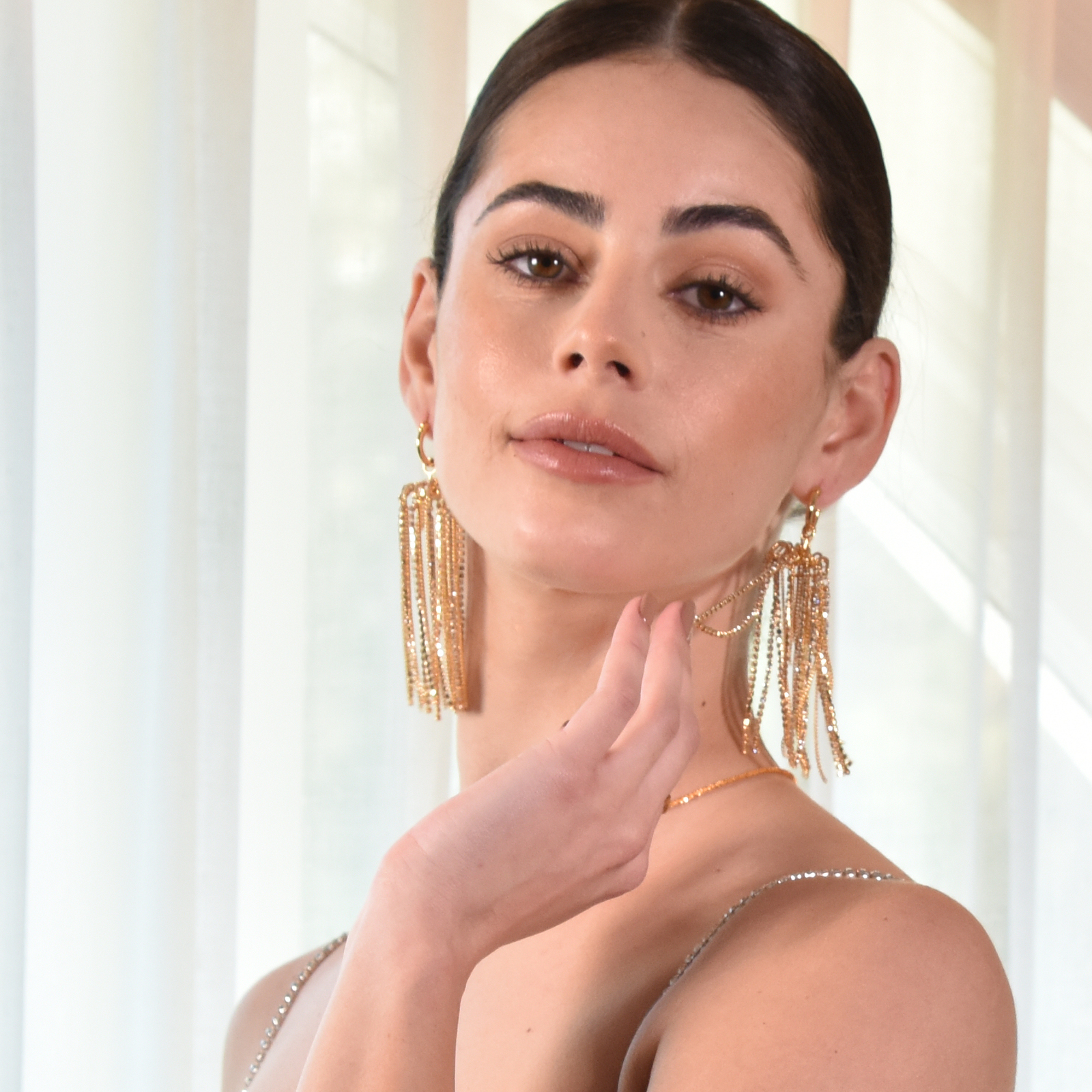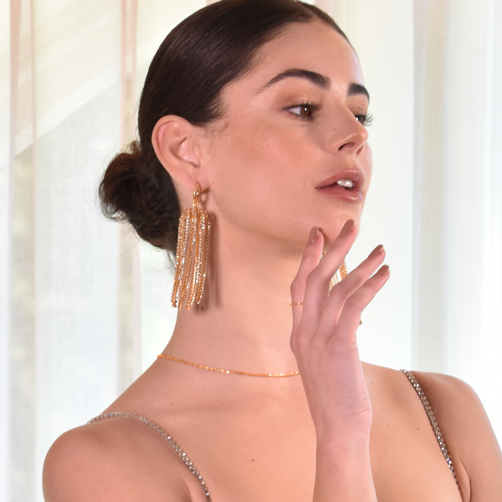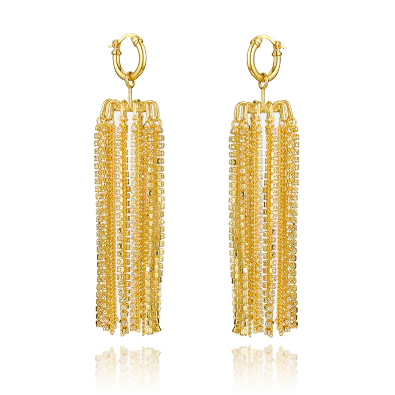 Flamboyant, glamourous, and elegant. Introducing Emiliana Luxury Chandelier Catwalk Earrings - a catwalk style statement piece that turns heads. This design is inspired by French flamboyant architecture style blended with luxurious elements from the French baroque style. It features chandelier style gold tassel strings embellished with high quality Austrian zirconias. The earrings are made of titanium steel with rich 18k gold plating, splashing adorable gold shimmer as you move. Perfect for high fashion, formal, semi-formal, wedding, bridal, runway, exquisite styles and more. Hypoallergenic, nickel, cadmium and lead free.