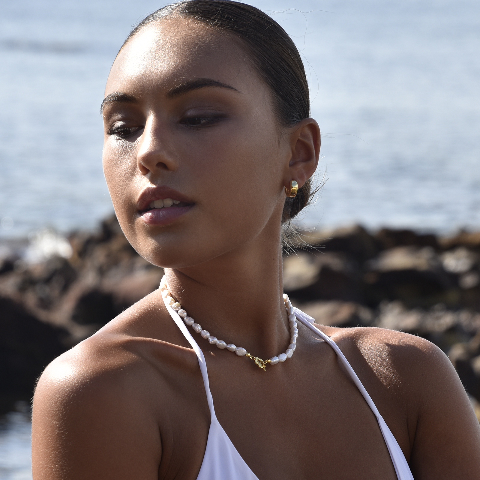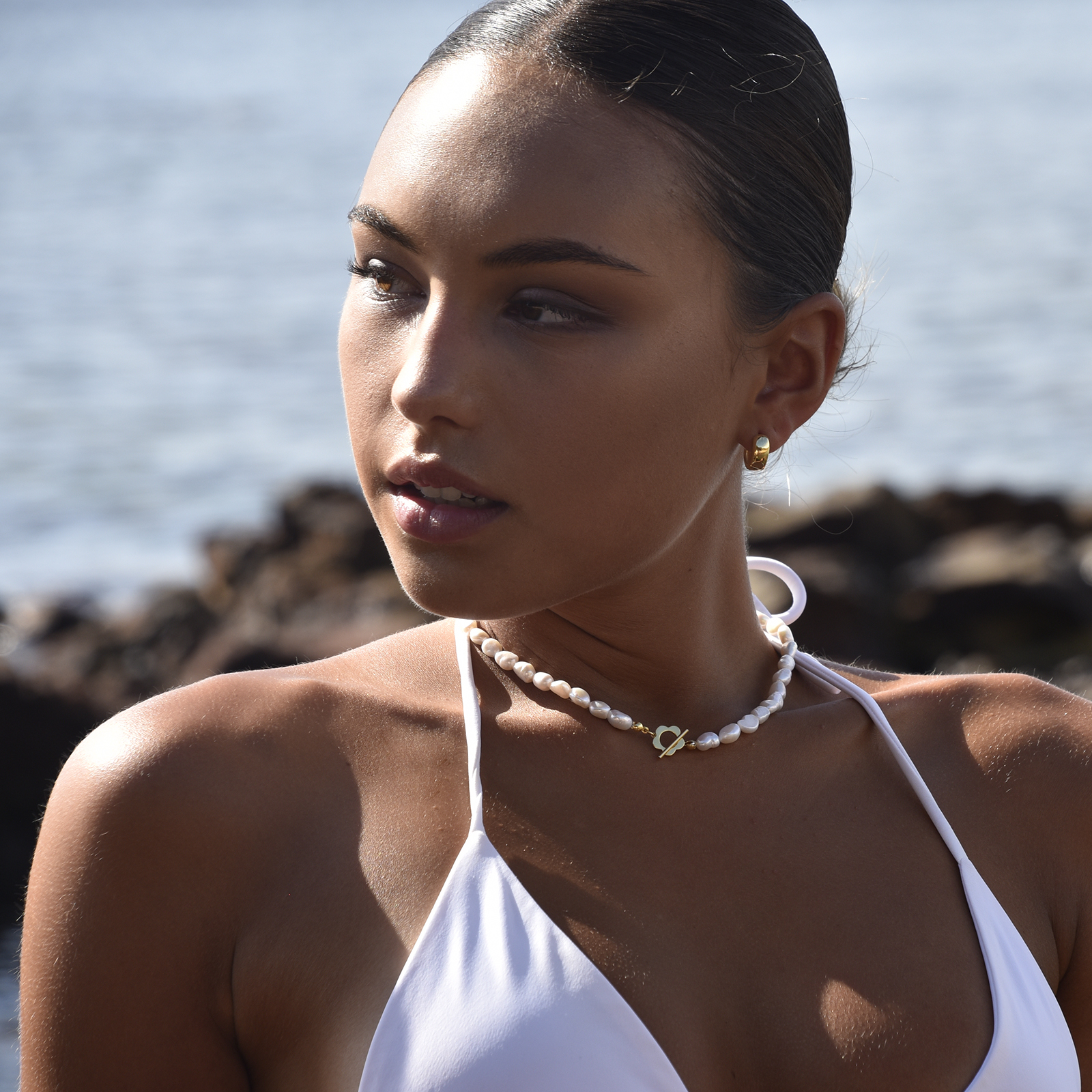 Ocean gems make a summer complete. Introducing Endless Summer Freshwater Pearl Necklace - a chic and elegant pearl neckpiece for an elevated coastal chicness. This design features natural freshwater pearls with a high natural lustre connected to an adorable flower-shaped toggle made in solid sterling silver with 18K gold plating. This neckpiece is 38cm in length and 19.7g in weight. Perfect for modern, retro, vintage, feminine, coastal, summer, beach, boho, necklace layering, smart casual, casual and everyday style. Hypoallergenic, nickel, lead, and cadmium free.