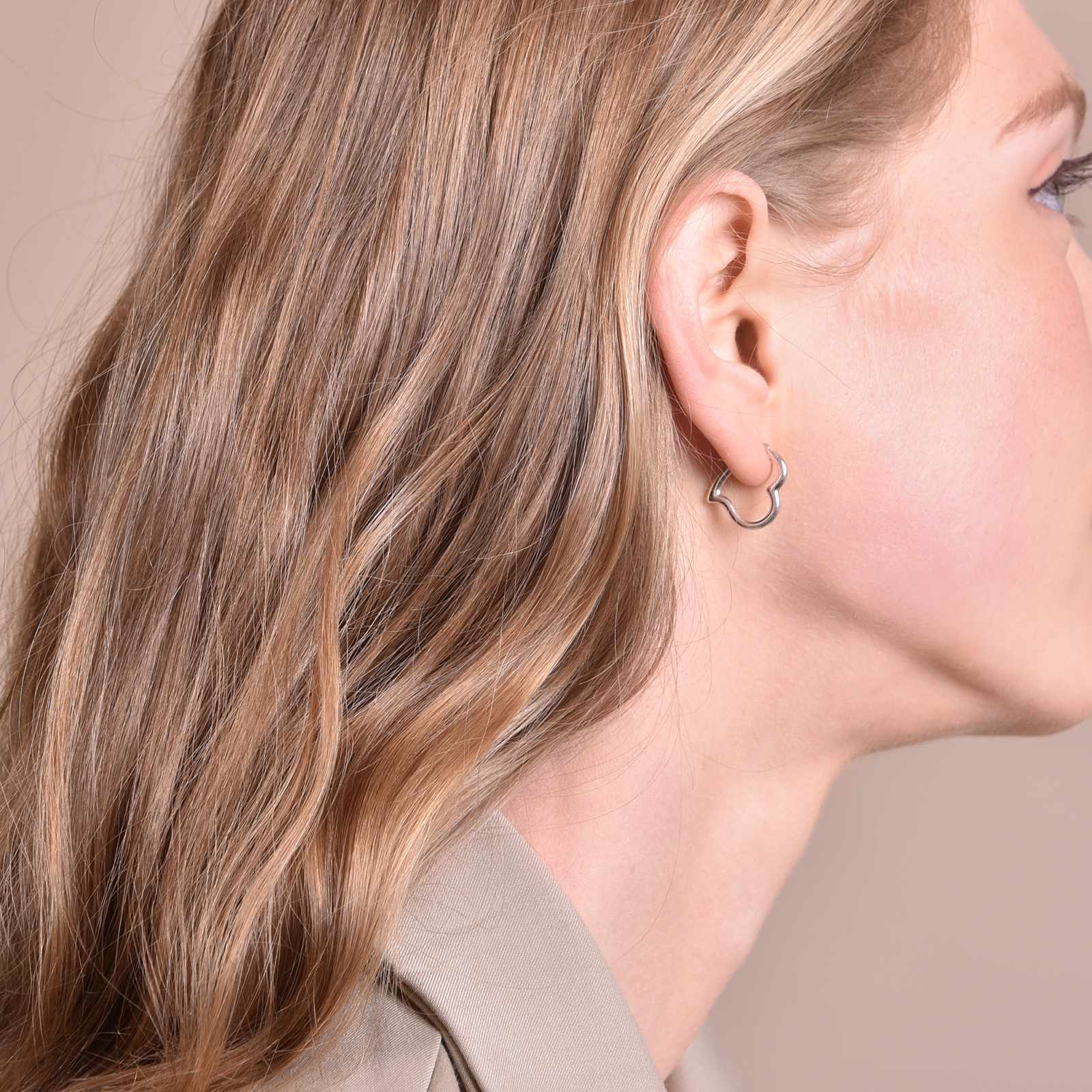 Chic, romantic and unique in a subtle way. Introducing Enora Deco Heart Earrings (Silver) - a French style love huggie for muses who love something different. Elevated from traditional love heart earrings, this design features love hearts that face towards the front. The earrings are made of solid sterling silver to ensure durability and hypoallergenic wear. There is also a solid feel of weight to the earrings. Perfect for modern, retro, dainty, chic, feminine, girly, earring layering, minimalist, smart casual, casual, everyday styles and more. Also suitable for teens and kids. Hypoallergenic, nickel, cadmium and lead free.