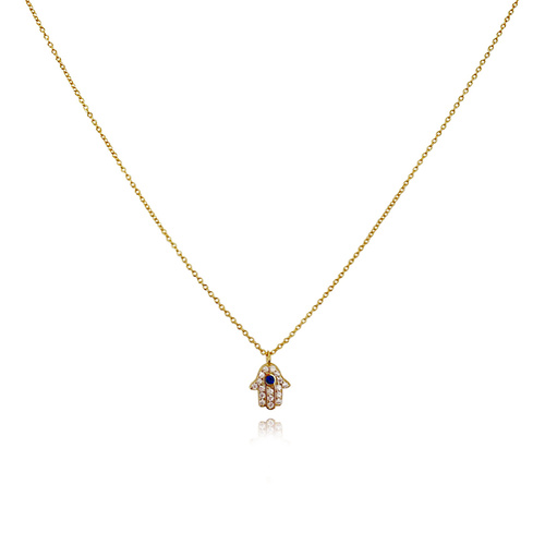 May this evil eye protect you as you go about your day. May happiness surround you and stay out of harm’s way. Introducing Esin Hand Evil Eye Pendant Necklace (Gold) - a delicate and timeless fine piece featuring a hand evil eye embellished with quality Austrian cubic blue and clear zirconias. This necklace is made in sterling silver with 18ct gold plating for enduring and hypoallergenic everyday wear. Perfect for layering and all personal styles, and especially for evil eye lovers. This necklace is 49.5cm long including a 10cm adjustable link for a more flexible personal fit. Hypoallergenic, nickel, lead, and cadmium free. Available in 18ct gold or silver.