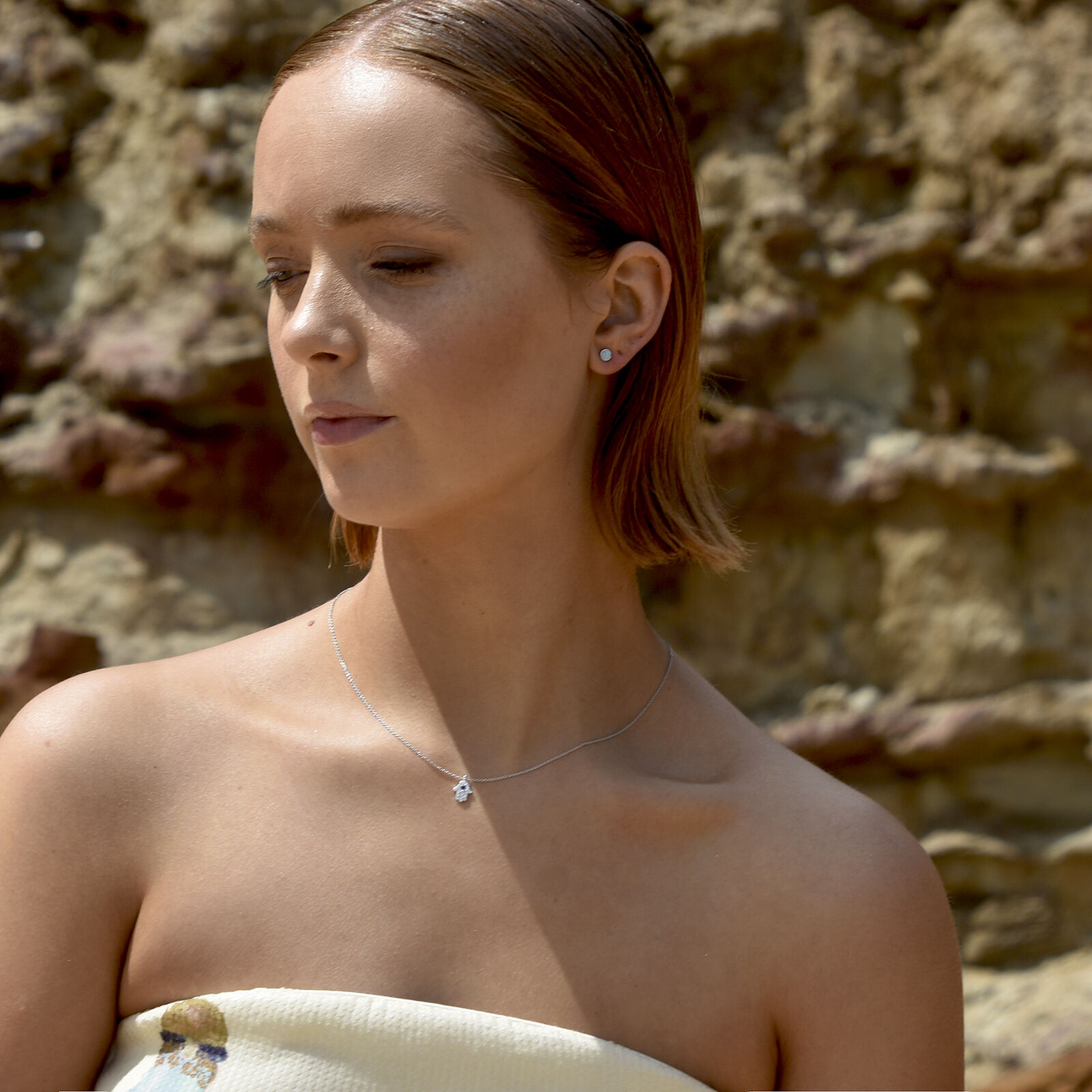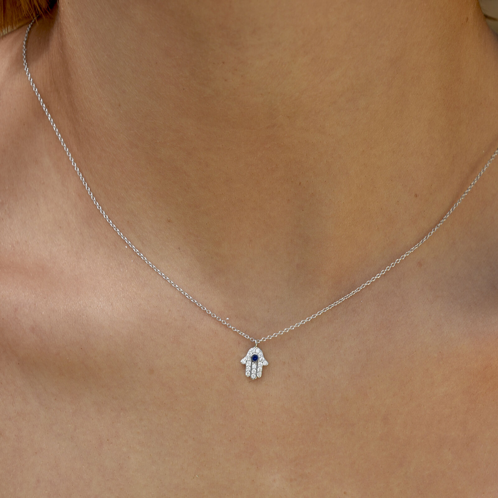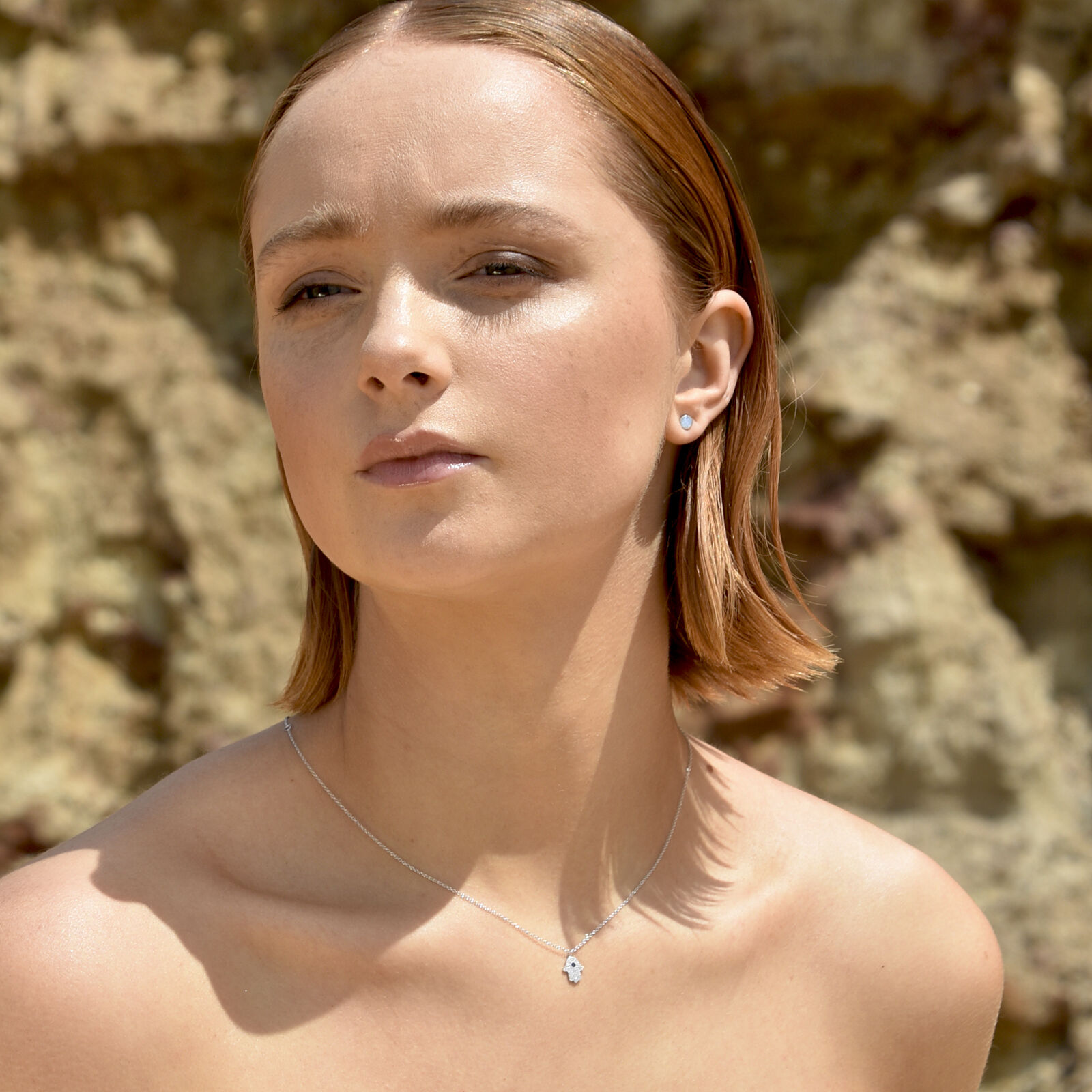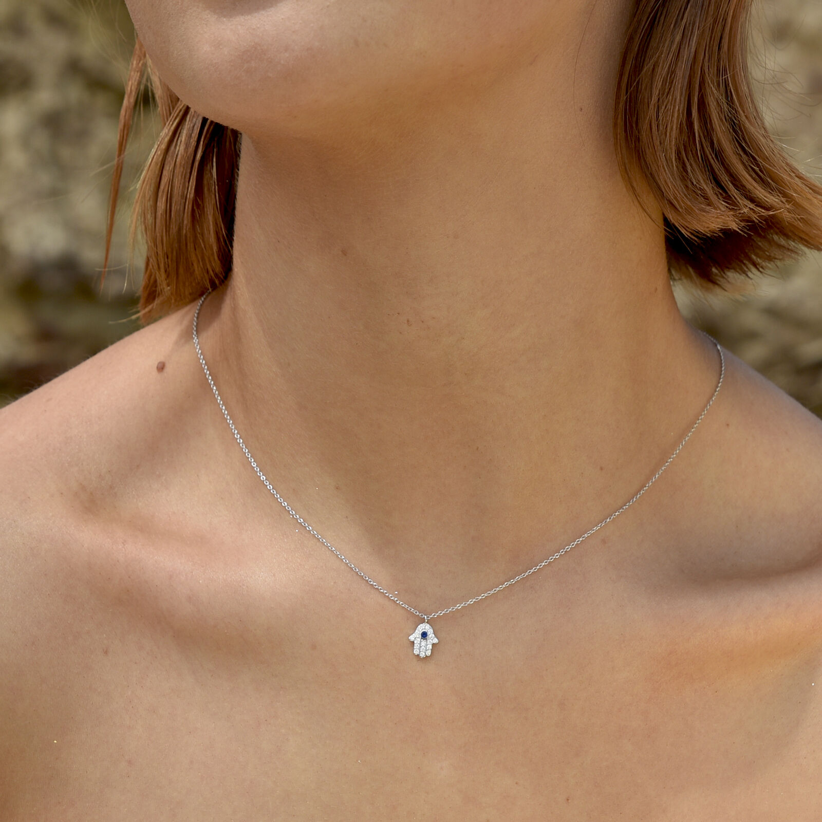 May this evil eye protect you as you go about your day. May happiness surround you and stay out of harm’s way. Introducing Esin Hand Evil Eye Pendant Necklace (Silver) - a delicate and timeless fine piece featuring a hand evil eye embellished with quality Austrian cubic blue and clear zirconias. This necklace is made in sterling silver for enduring and hypoallergenic everyday wear. Perfect for layering and all personal styles, and especially for evil eye lovers. This necklace is 49.5cm long including a 10cm adjustable link for a more flexible personal fit. Hypoallergenic, nickel, lead, and cadmium free. Available in 18ct gold or silver.