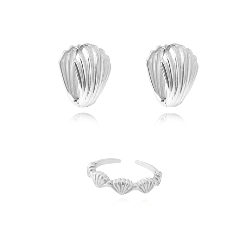 This Gift Set includes: Esmarie Twin Clam Huggie Earrings (Silver) + Tresor Artisan Scallop Open Ring (Silver)