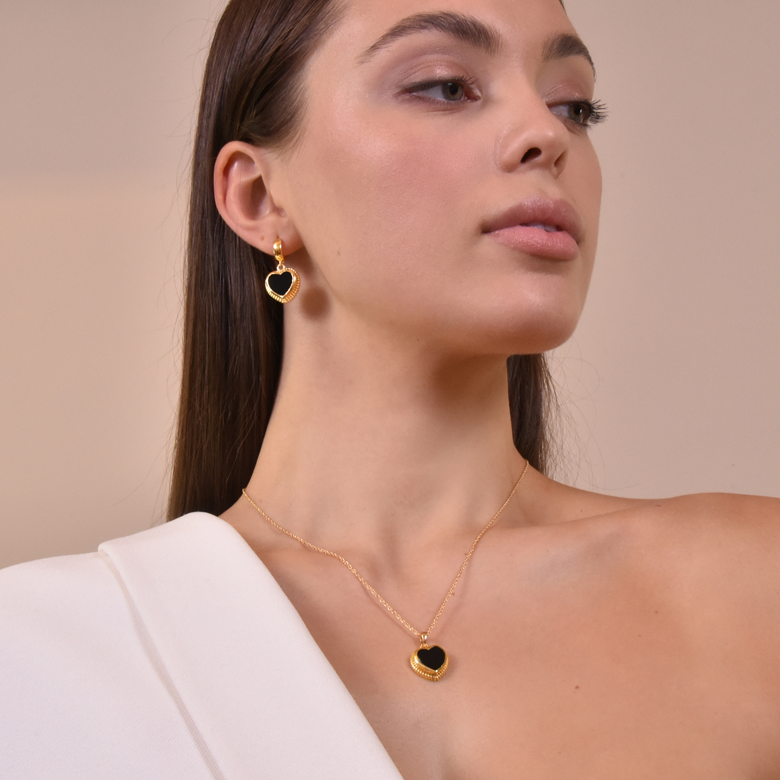 Chic heart striking a balance between bold and fine. Introducing Esmeray Black Onyx Heart Drop Earrings - an artisan design piece inspired by retro and modern femme style. This design features natural black onyx stones cut, polished and crafted in a love heart shape, encircled by a chic French style twisted frame. The metal is made of solid sterling silver with 2.5 microns of 18K gold plating (to Gold Vermeil Jewellery Standards). The earring hoops are smoothly polished to ensure a luxurious yellow gold shine that endures. Perfect for those who appreciate jewellery craftsmanship, quality and style. Hypoallergenic, nickel, cadmium and lead free.
