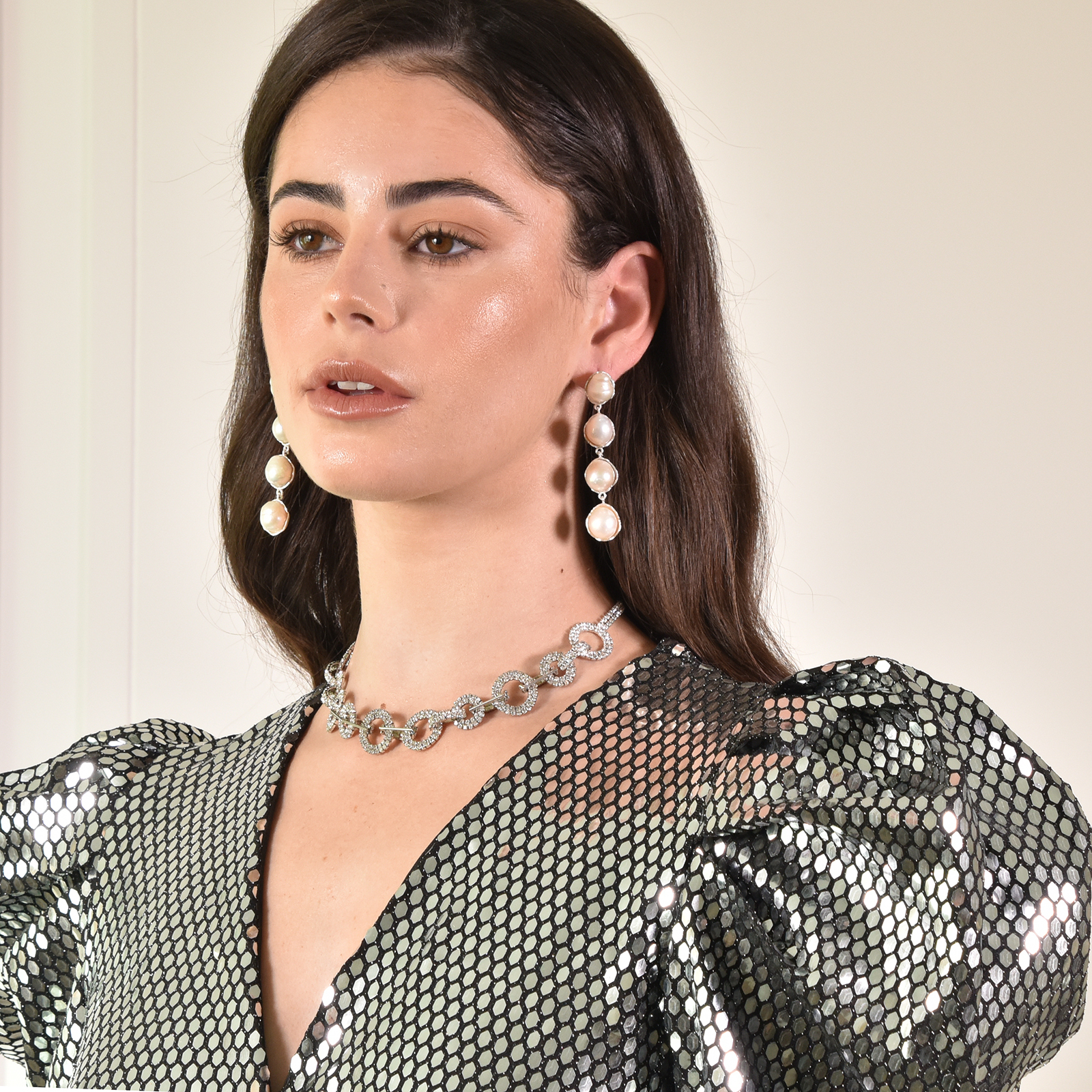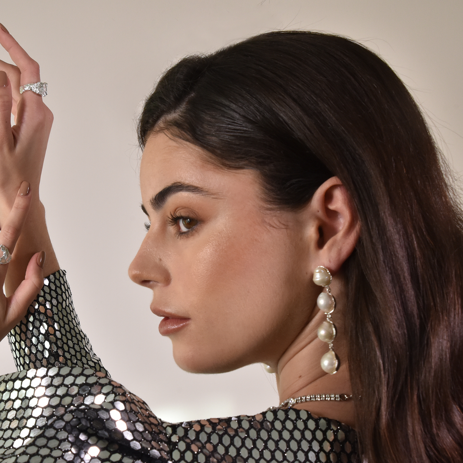 Timeless pearl luxury ethically made to last. Introducing Esmerelda Luxury Baroque Pearl Earrings (Silver), an artisan handcrafted pearl beauty for your elegant high fashion styling. Each earring features 4 handpicked natural baroque pearls nested in handmade silver pods. The earrings are made of environmentally friendly brass (nickel free) with 2.5 microns of 999 silver plating and 5 times manual hand polishing, giving the earrings a stunning silver shine that endures with time. The earring posts are made of solid sterling silver to ensure hypoallergenic wear. A unique and upper-class pearl piece perfect for formal, semi-formal, bridal, wedding, anniversary, dressy, coastal, feminine, glamour, smart casual styles and more. Hypoallergenic, nickel, cadmium and lead free.