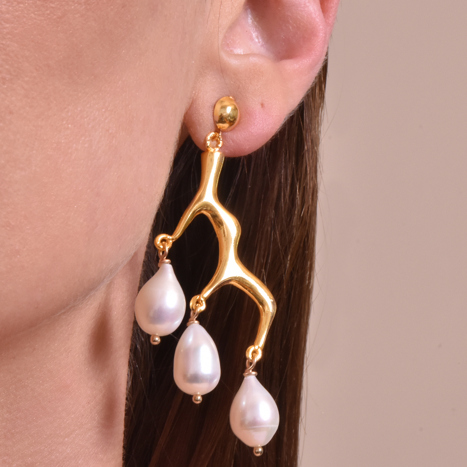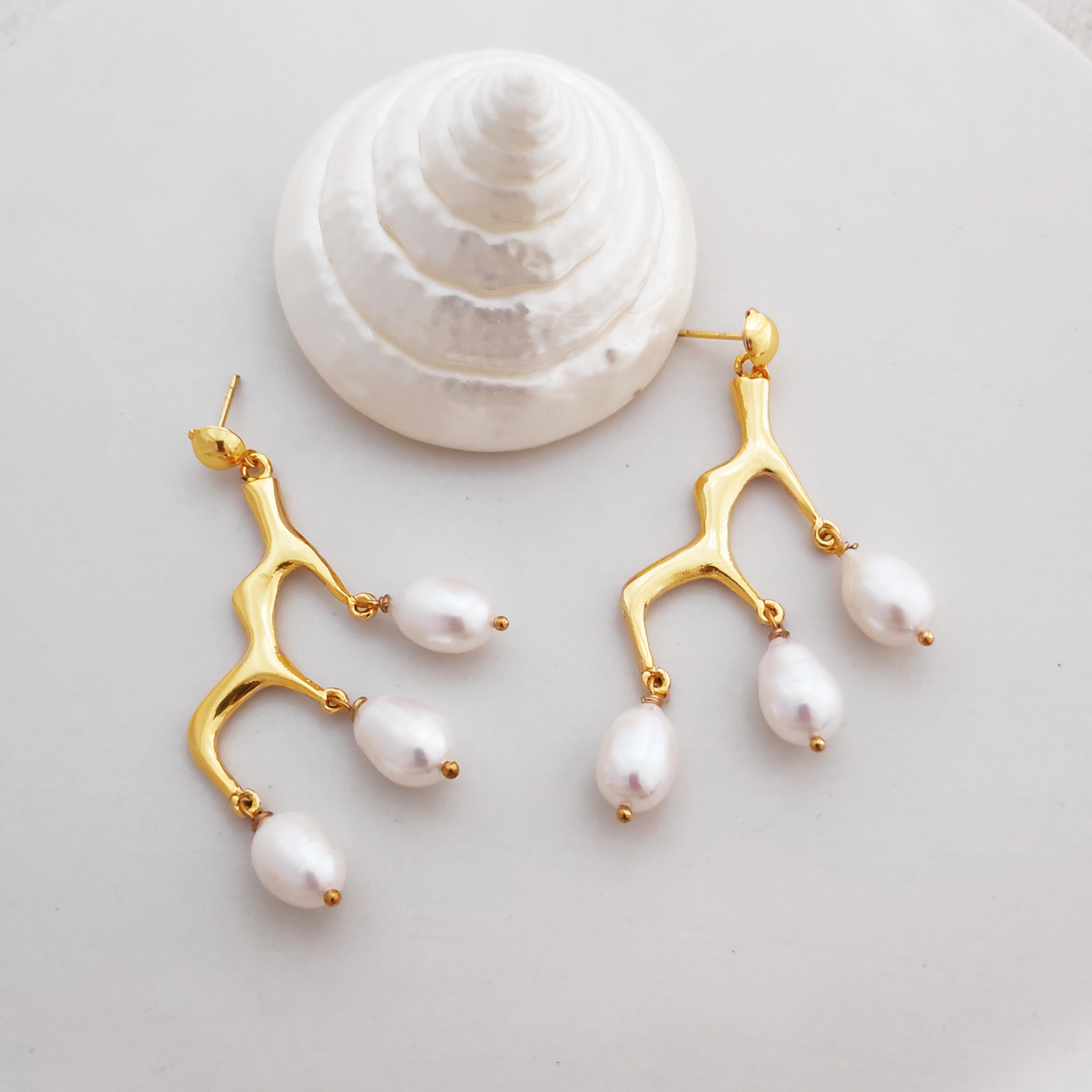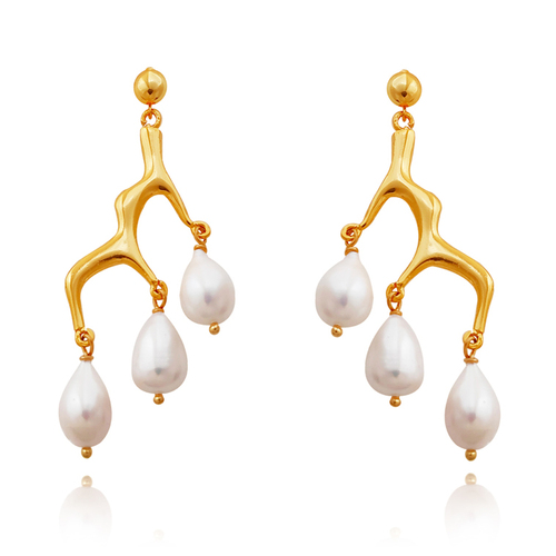Artisan pearl craft inspired by coastal culture and modern sculpture art. Introducing Esmese Artisan 24K Coral Pearl Drop Earrings — uniquely crafted pearl beauties for your creative high fashion styling. This design features coral shaped metal sculptures with 3 natural teardrop shaped freshwater pearls attached on each stem. The metal is made of environmentally friendly brass (nickel free) with thick 24K pure gold plating. The pearls are handpicked with stunning high lustre and smooth surface. To best bring out the rich and luxurious pure gold shine, each piece is hand polished 5 times. Perfect for formal, bridal, wedding, semi-formal, high fashion, red carpet, award, runway, any dressy occasions and more. Hypoallergenic, nickel, cadmium and lead free.