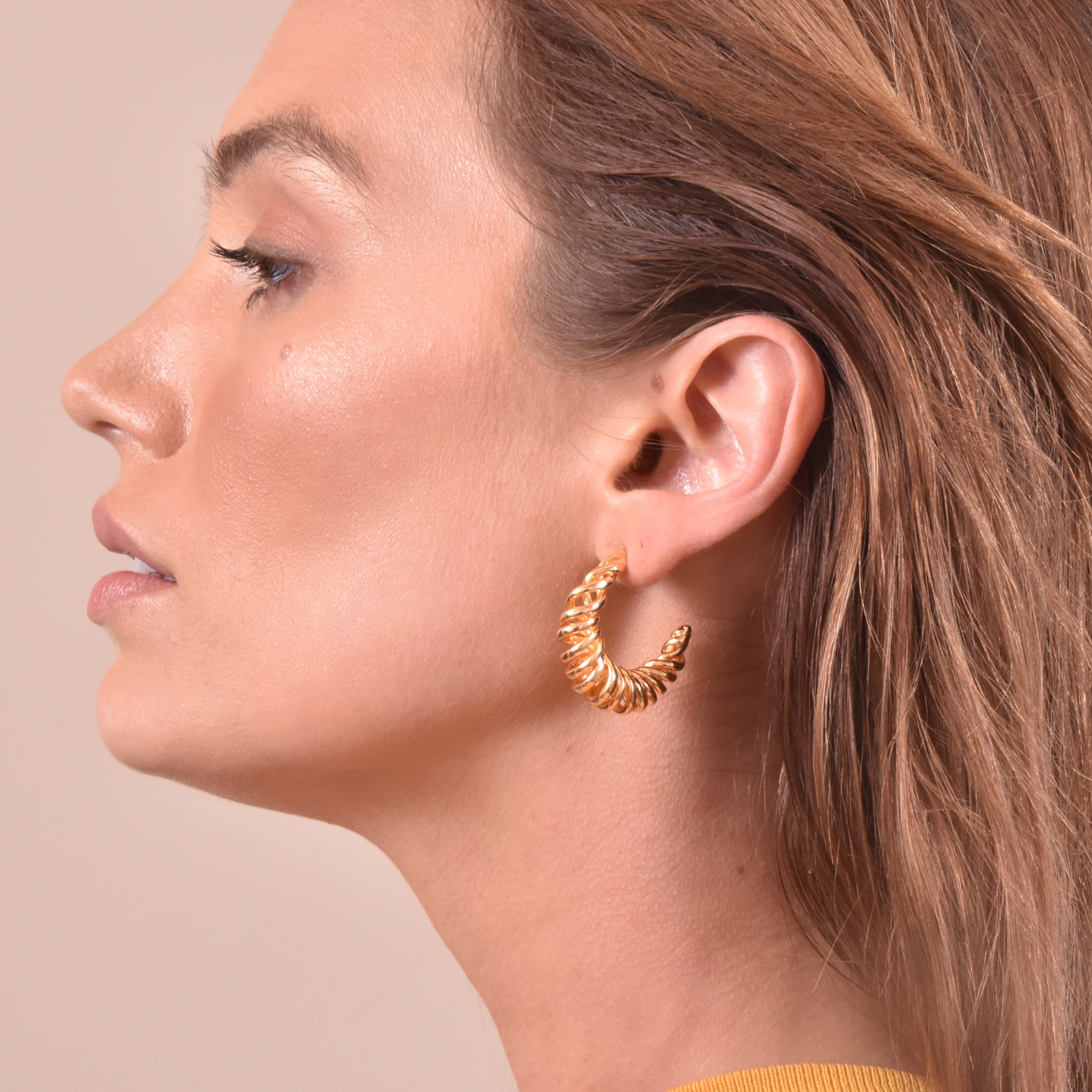 Artisan crafted light luxury with a contemporary twist. Introducing Estelle 24K Artisan Spiral Hoop Earrings — a vintage luxury inspired modern design featuring croissant shaped spiral hoops. This simple yet creative design is crafted in environmentally friendly brass (nickel free) with 2.5 microns of thick 24K gold plating, ensuring a luxurious rich gold shine for lifelong keep sakes. It is also of a comfortable weight for long hours’ wearing. An outspoken and versatile ear love for modern, simple, high fashion, vintage, chic, punk, artsy, femme, smart casual styles and more. Hypoallergenic, nickel, cadmium and lead free.