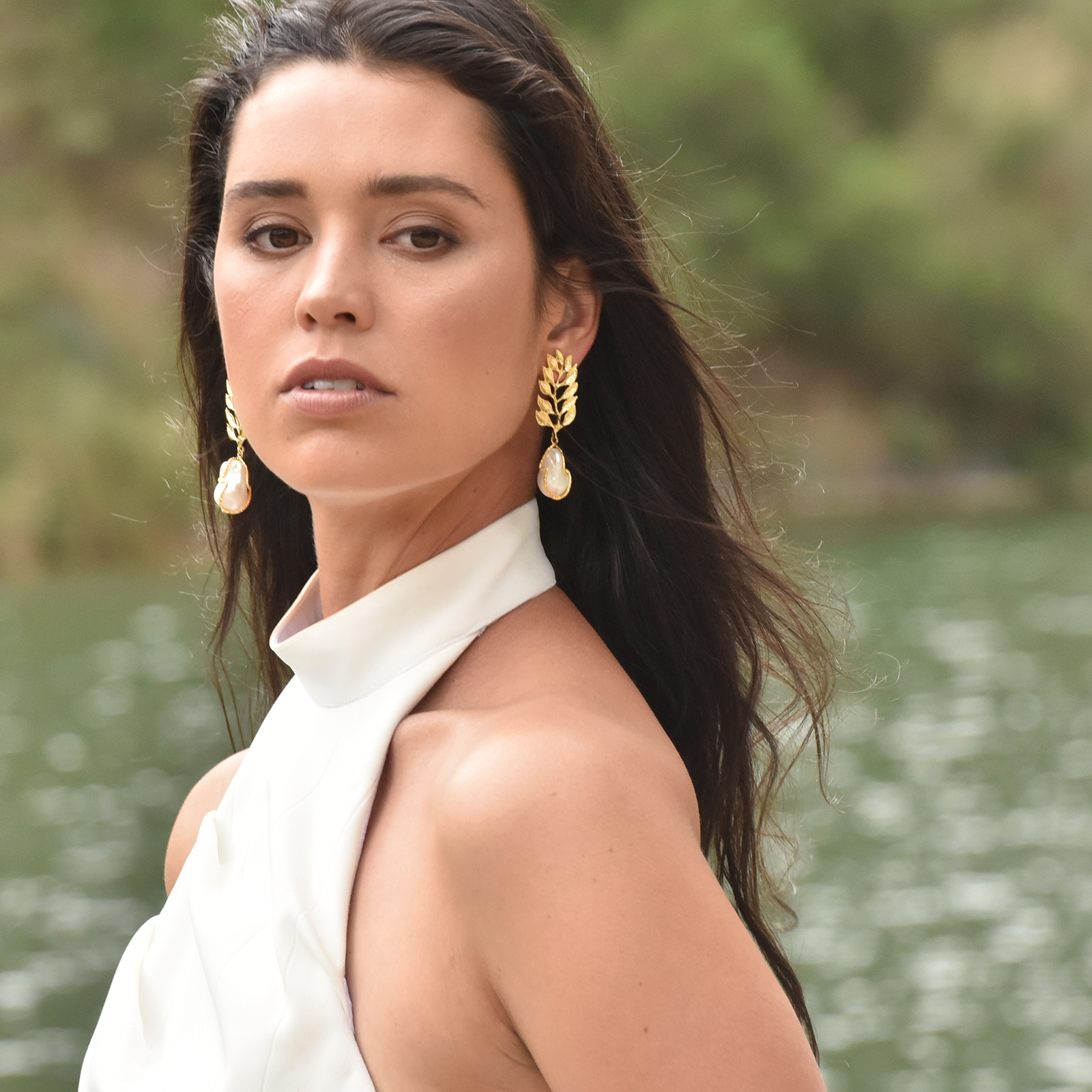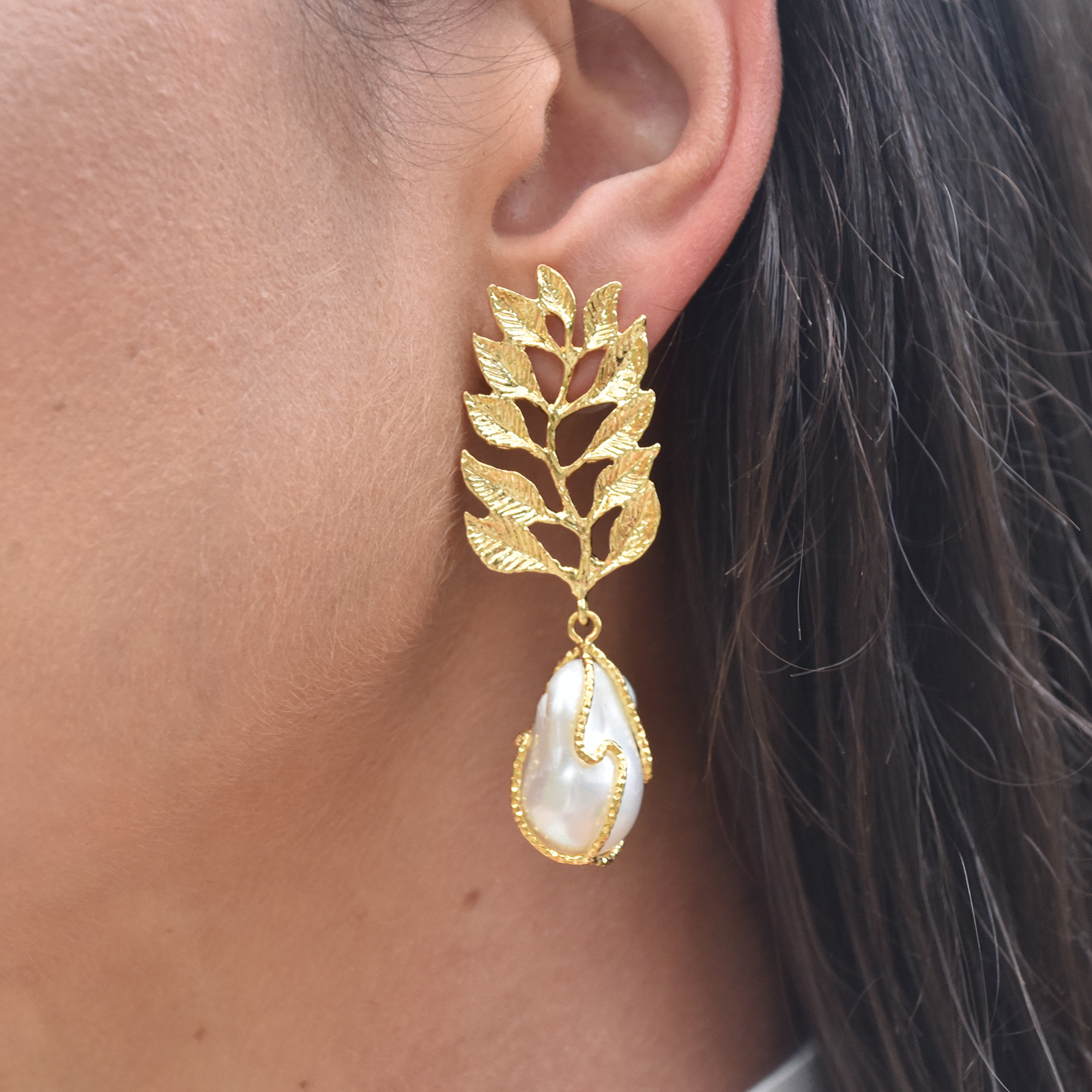 Luxury pearl drop craft exhibiting extravagant elegance. Introducing Étienne 24K Baroque Pearl Drop Earrings - an artisan crafted design for head-turning glamour. This design is inspired by the nature (roots and leaves), featuring detail-rich golden leaves attached to natural baroque pearl drops. The metal is crafted in environmentally friendly brass (nickel free) with 2.5 microns of pure 24k gold plating, forming a much thicker gold bond to the metal that is luxuriously stunning. To best bring out the pure gold shine, each metal piece is hand polished 5 times. The pearls used in this design are hand-picked natural flameball baroque pearls with an average size around 21mm in length and 16mm in width. The pearls are aesthetically wrapped with curved gold lines made as the same material of the gold leaves. Perfect for wedding, bridal, formal, semi-formal, dressy, glamorous, special events and more. Hypoallergenic, nickel, cadmium and lead free.