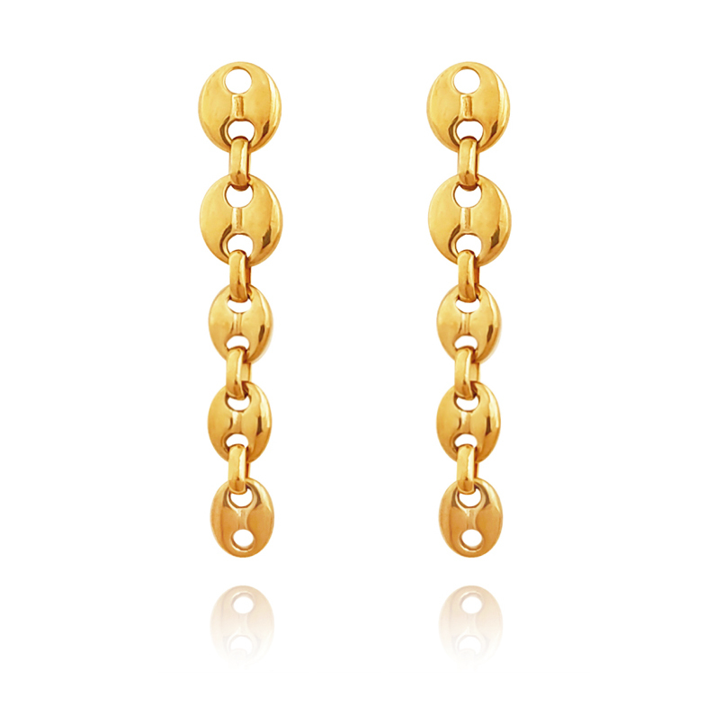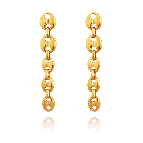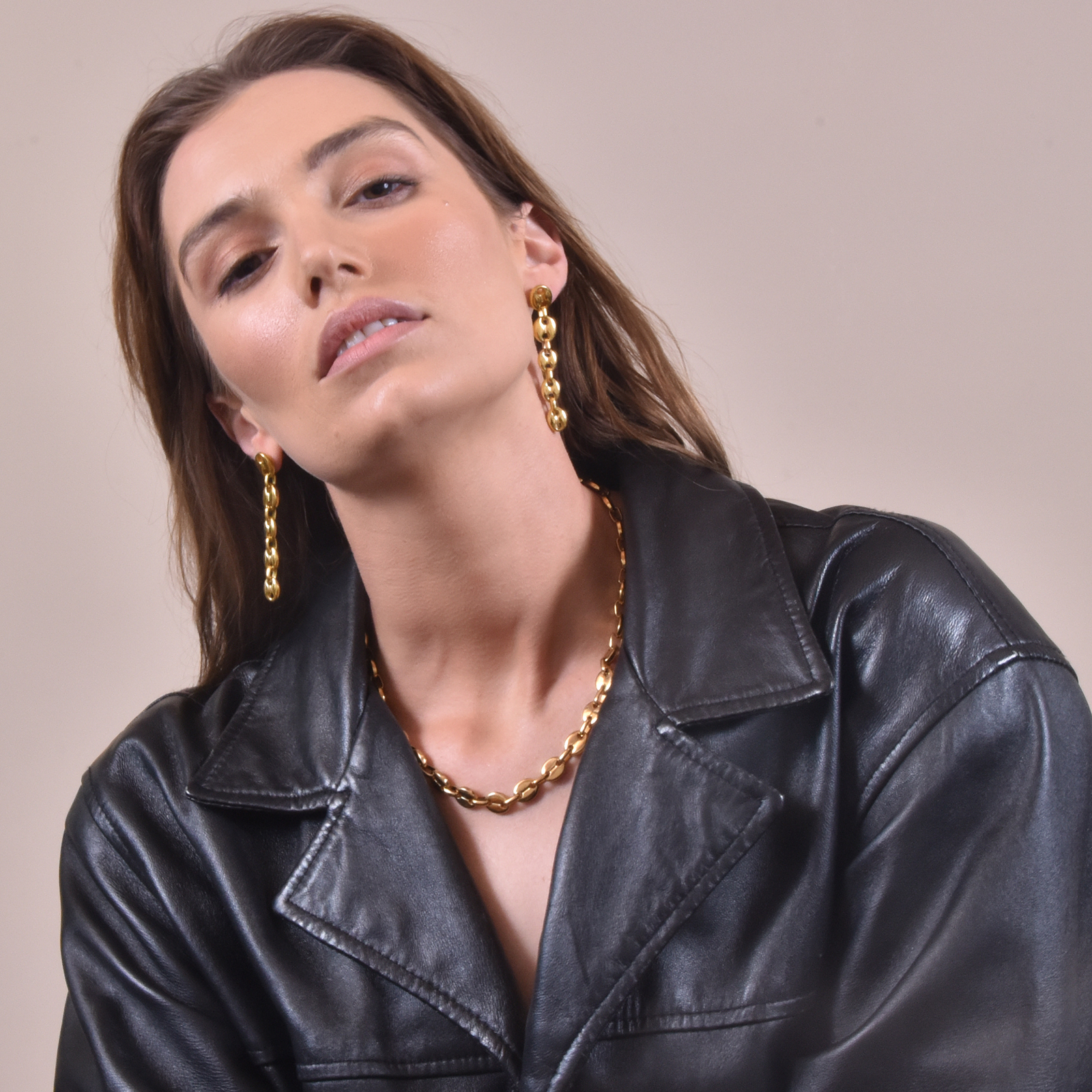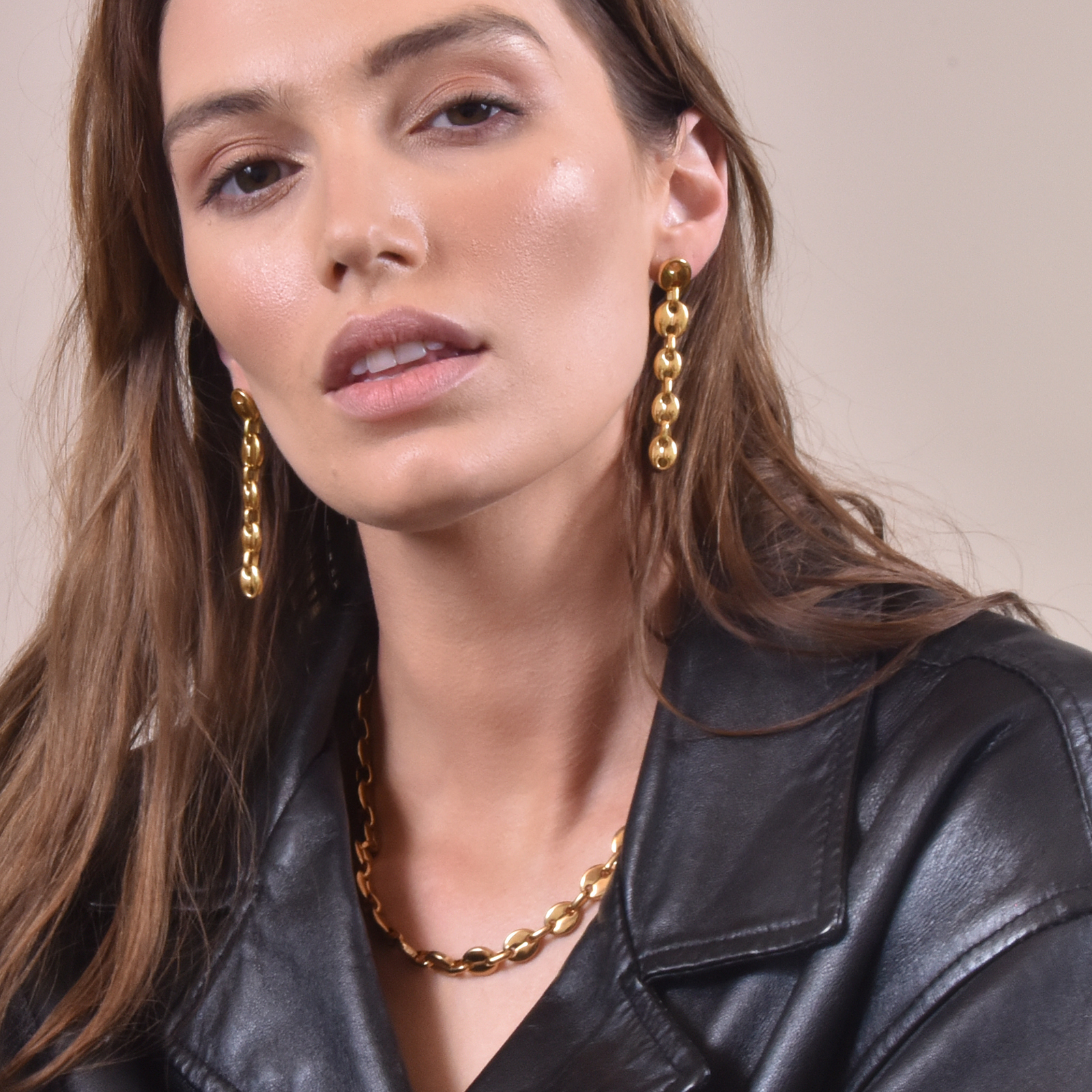 For the modern women who are uncompromisingly daring. Introduce Evren Gold Chain Earrings — an outspoken femme statement voicing your high fashion attitude. This design is crafted in titanium steel (nickel free) with 2.5 microns of 18K gold plating, ensuring a rich gold bond that is subtle, smooth and tarnish resistant. Pair them with other gold chain style jewellery and accessories to complete the look. Perfect for modern, chic, punk, contemporary, artsy, minimalist, high fashion styling and more. Hypoallergenic, nickel, cadmium and lead free.
