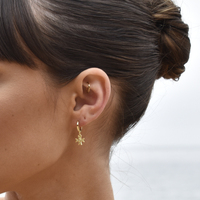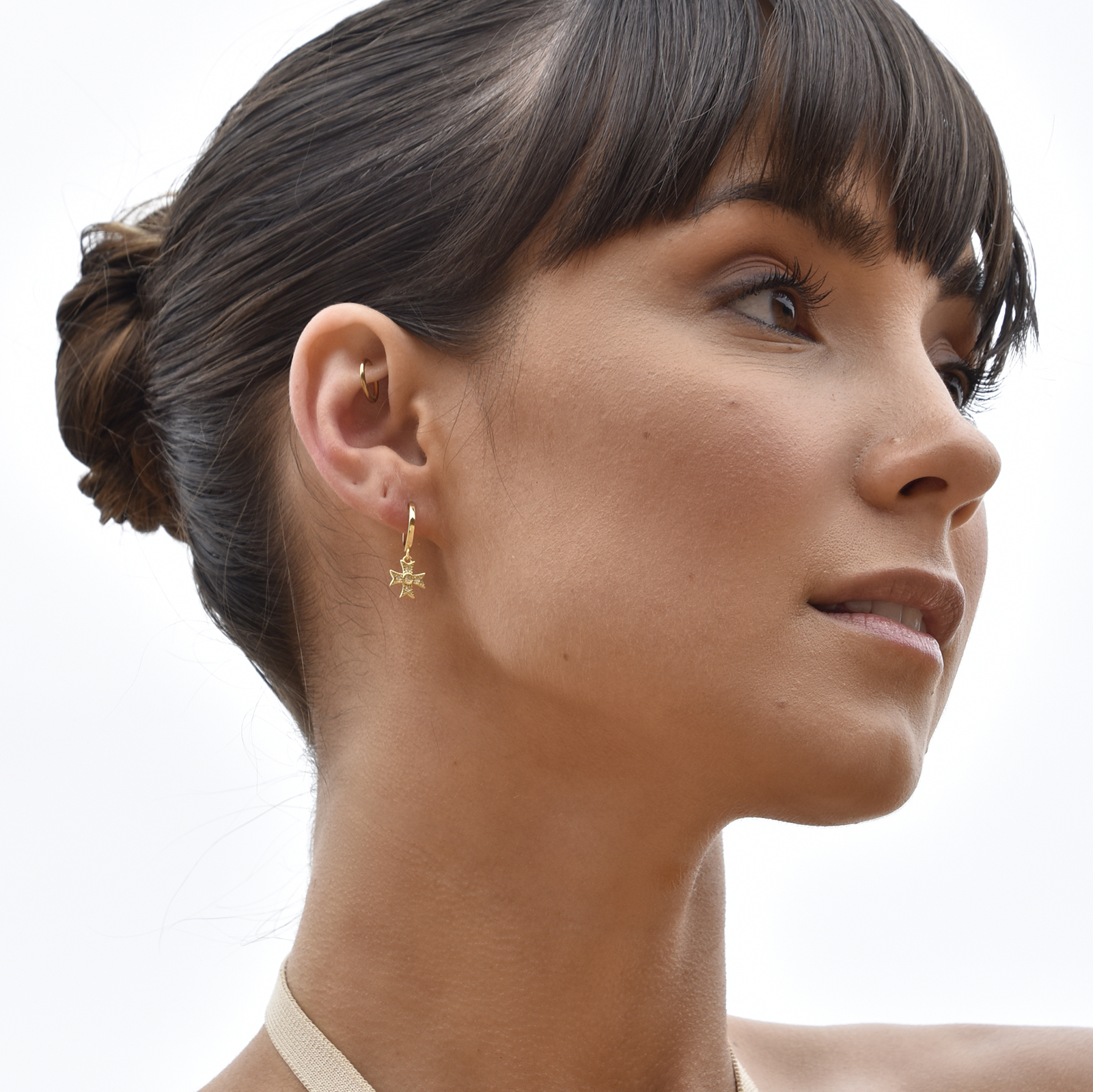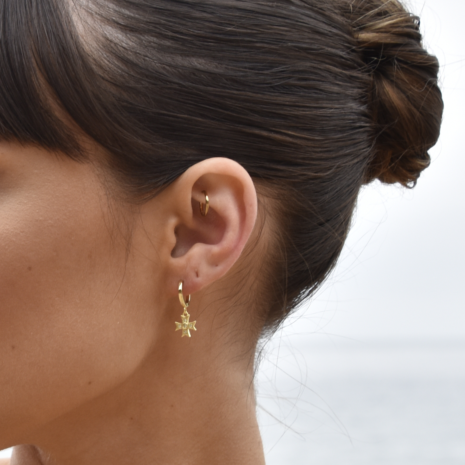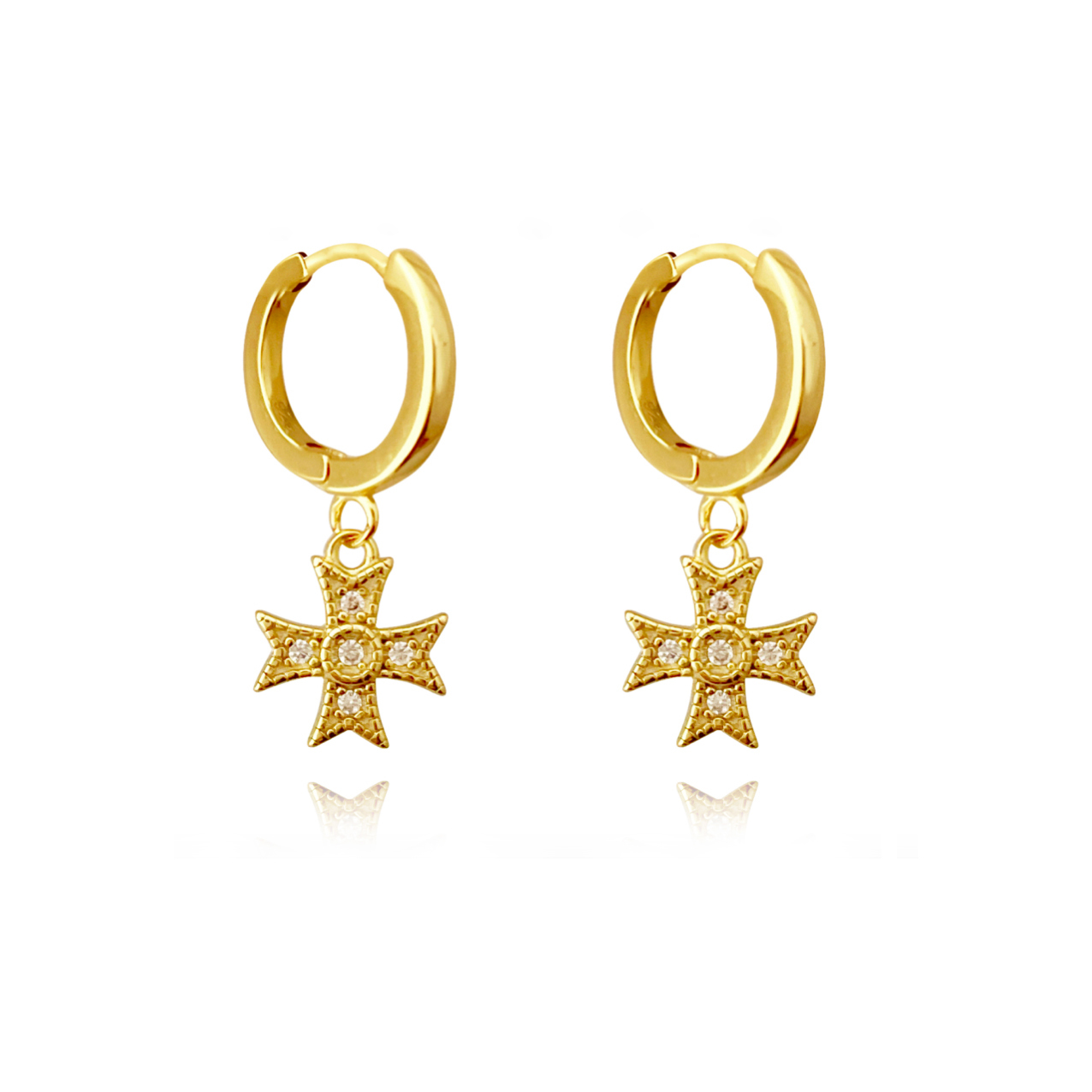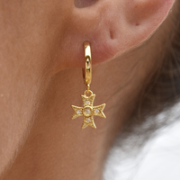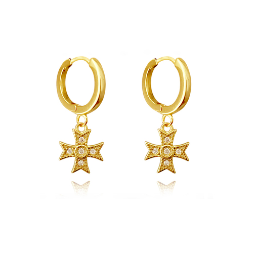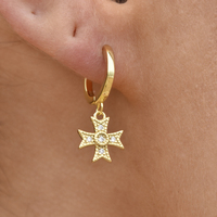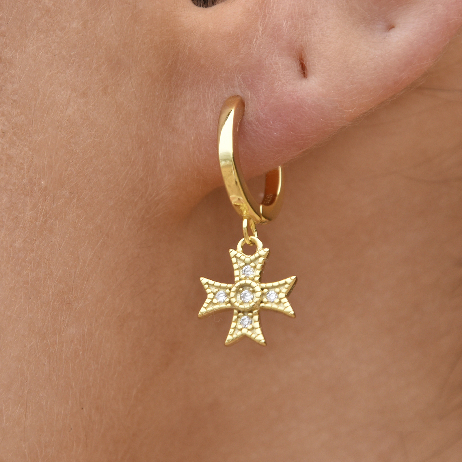 Cross drops with a sparkle of shimmer and enriched details. Introducing Exie Cross Drop Earrings (Gold Vermeil) - a dainty style ear love in a style of the Victoria cross. The cross drops are embellished with Austrian zirconias, giving a subtle sparkle in the sunlight. The earrings are made of solid sterling silver with 2.5 microns of 18K gold plating (to Gold Vermeil Jewellery Standard) for hypoallergenic and enduring wear. Suitable for modern, retro, earring layering, religious, smart casual, casual, everyday styles and more. Hypoallergenic, nickel, cadmium and lead free.