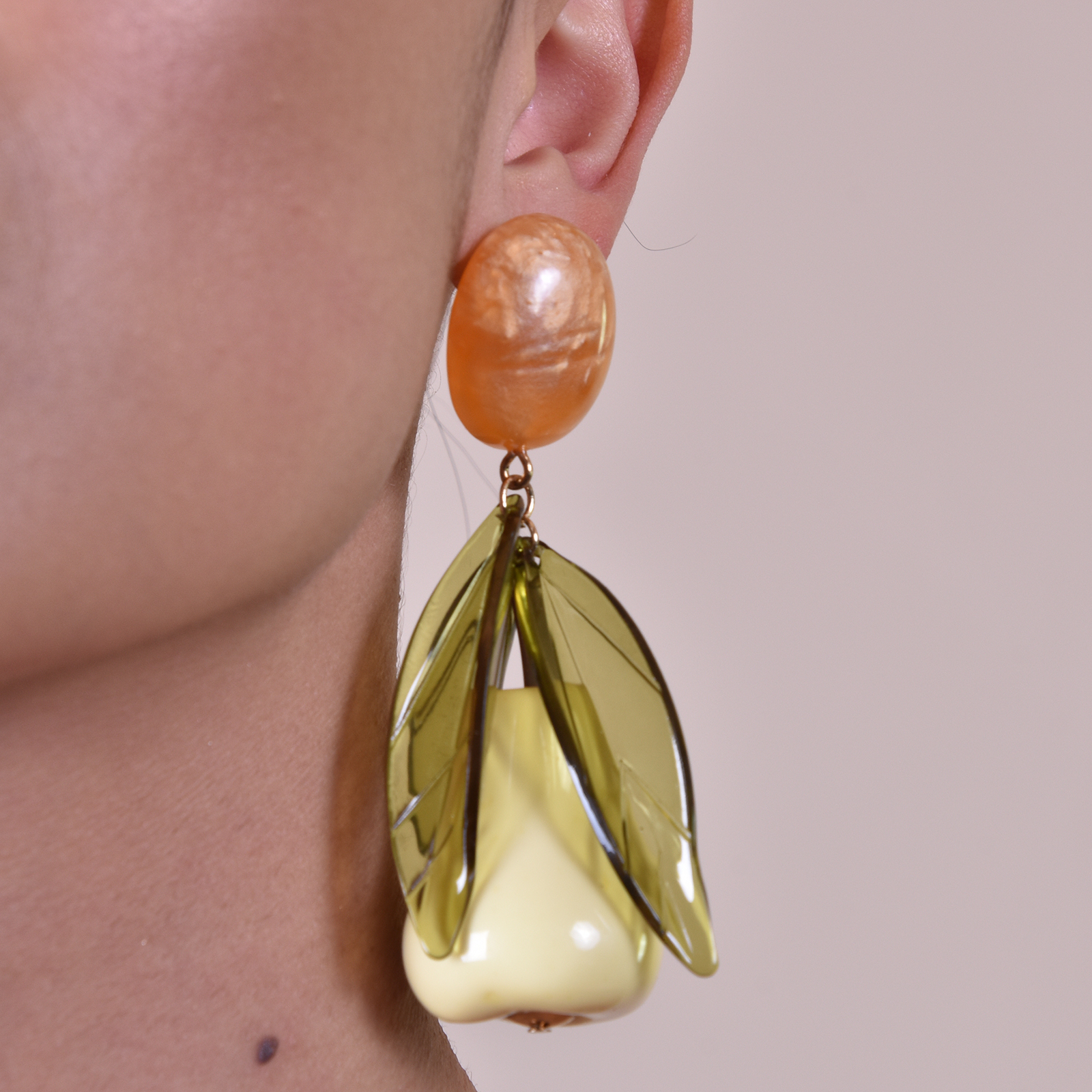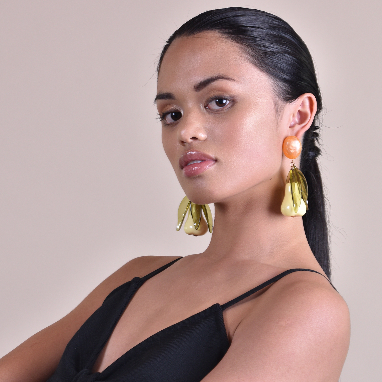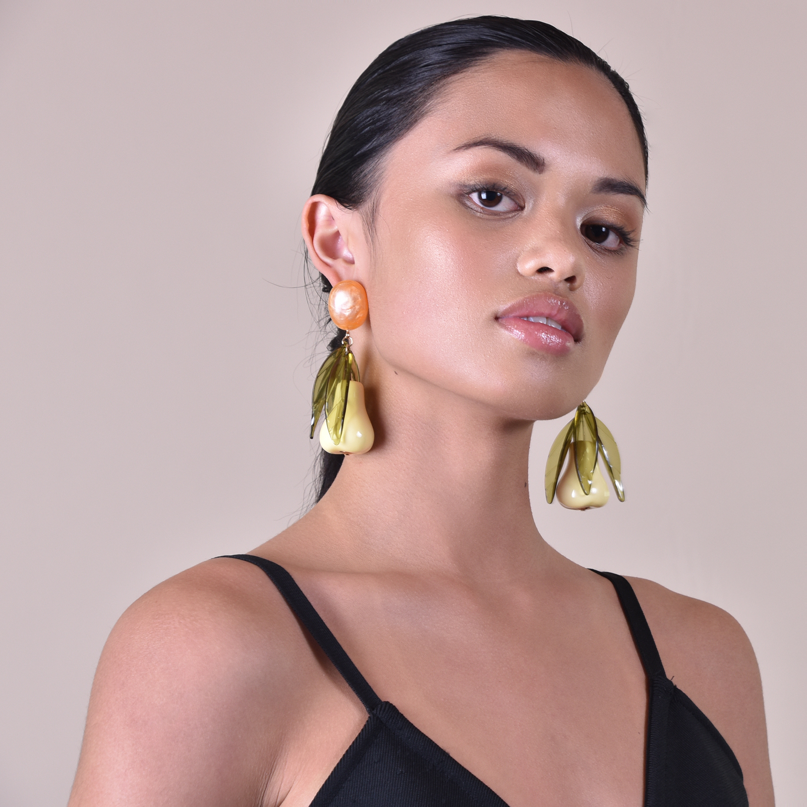 Extravagantly artsy and unique. Introducing Filicia Fruit Drop Earrings - a contemporary art inspired statement love for those who dare to wear. This design features an oversized pearl drop with both bright and muted colours. It makes an eye-catching and 'tasteful' statement for modern, earthy, fun-dressy, smart casual styles and more.