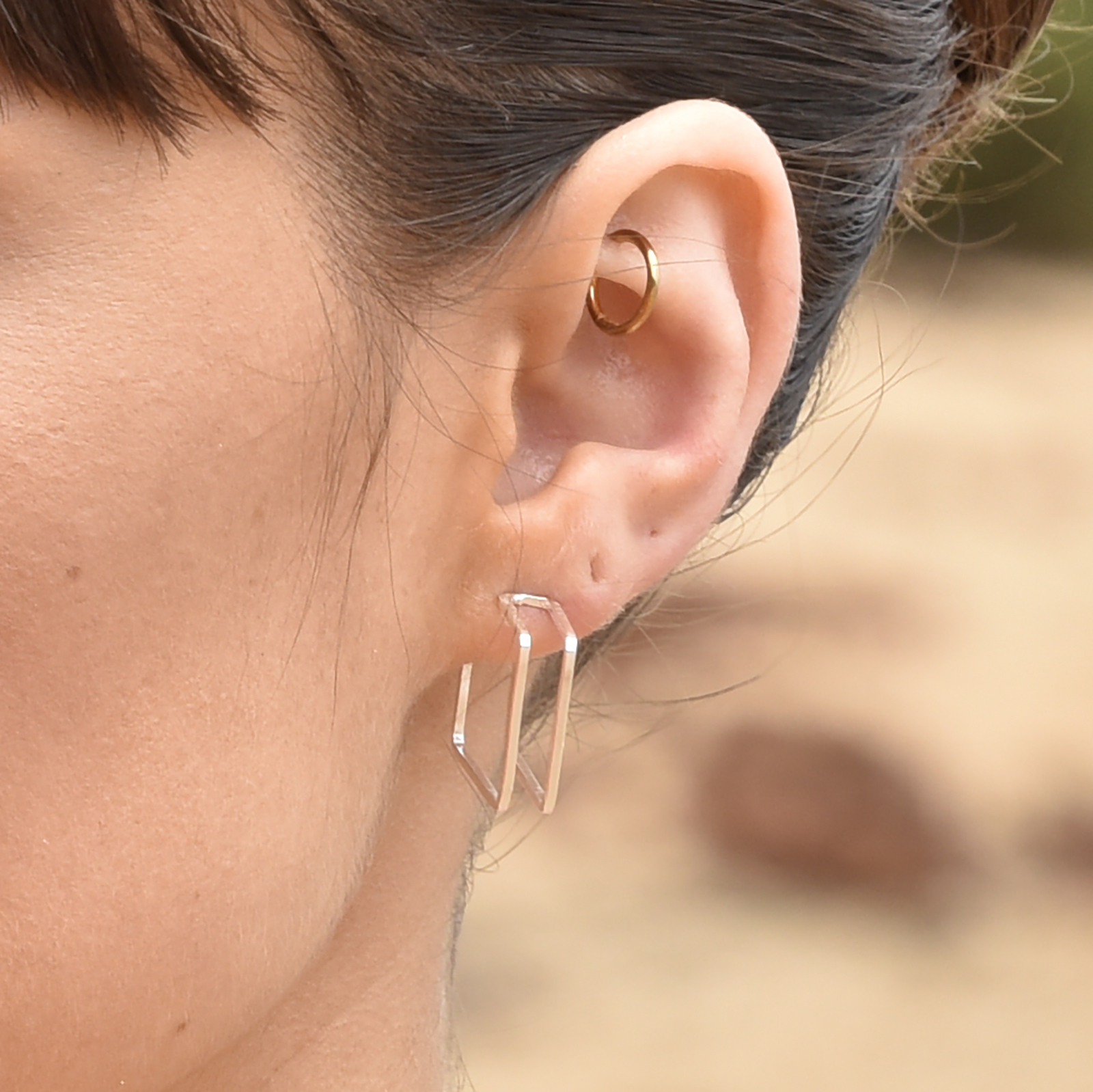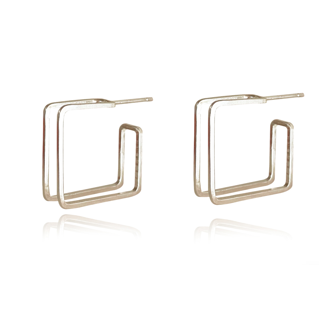 Simple, unique and eye-catching. Introducing Finley Sculpture Frame Earrings (Silver) - a modern sculpture inspired artisan ear art for lovers of uniqueness and style. This design features parallel square frame hoops smoothly polished. The earrings are crafted in solid sterling silver with brilliant white rhodium plating for a brighter silver shine and an extra anti-tarnish protection. They are of a comfortable weight for all day wearing. A piece that is subtle, playful yet impactful. Perfect for modern, artsy, minimalist, chic, earring layering, high fashion styling, smart causal, casual styles and more. Hypoallergenic, nickel, cadmium and lead free.