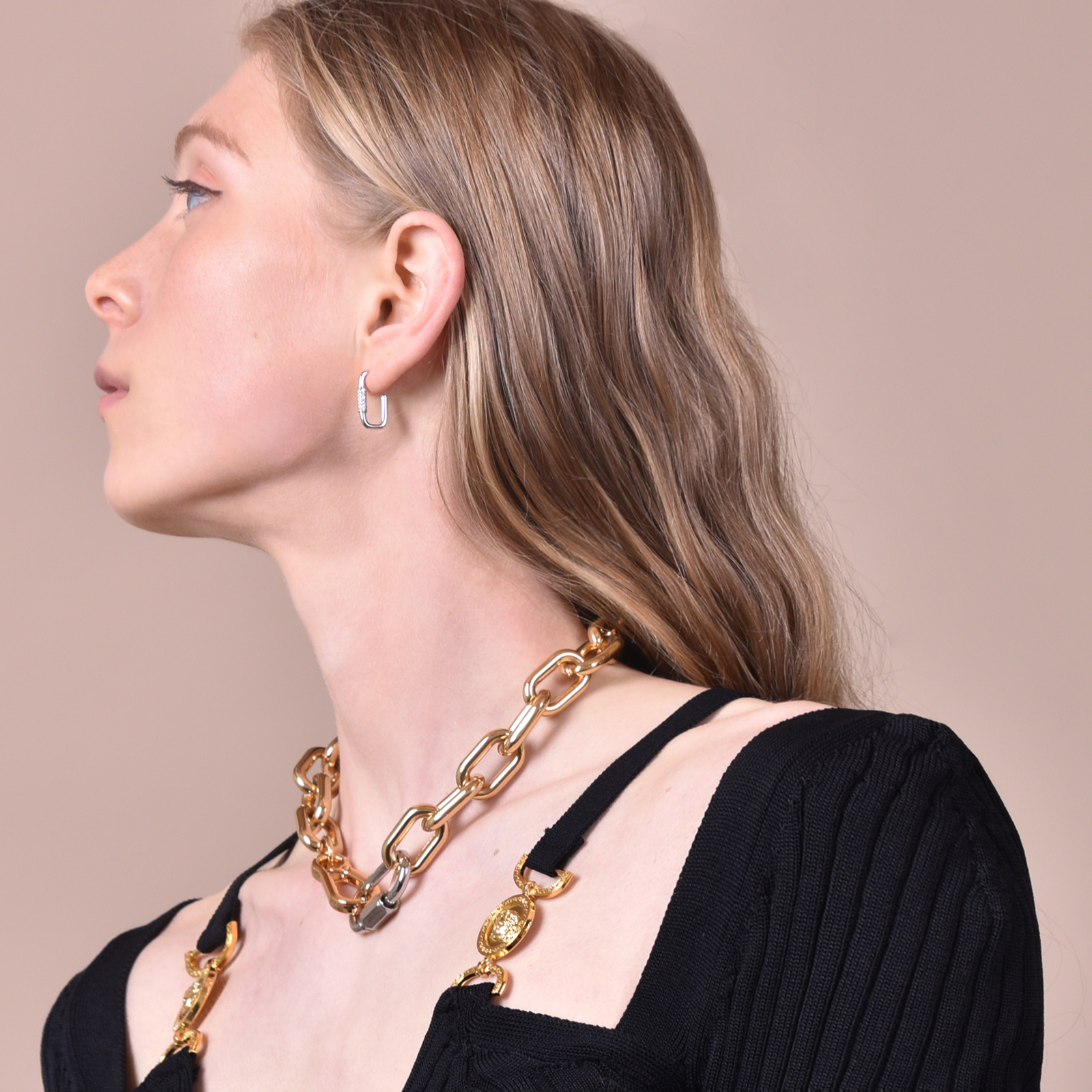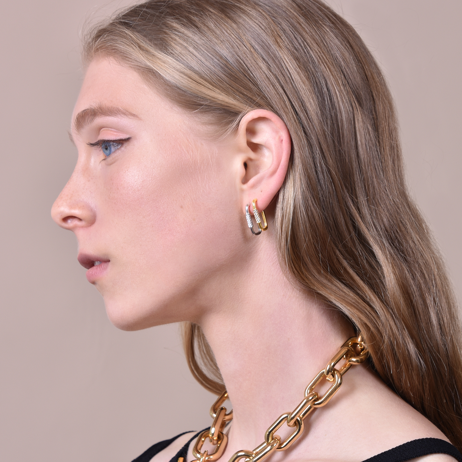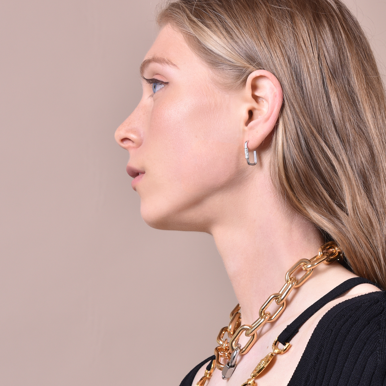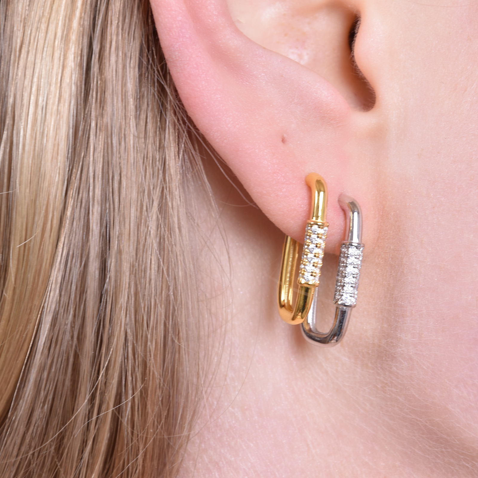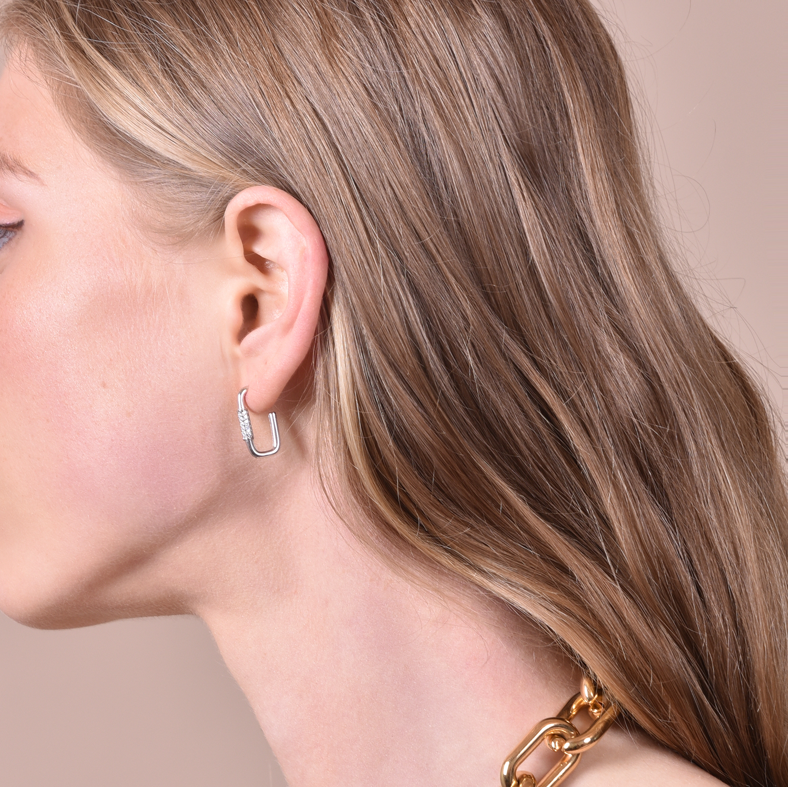 Modern, trendy, chic with an edge. Introducing Fletcher U Earrings (Silver) - a succinct and stylish ear love with a shimmer of diamantes. This design features U-shaped stud earrings with a section on the front encrusted with Austrian zirconias. The earrings are made of solid sterling silver with rhodium plating to ensure hypoallergenic wear and durability. The earrings are highly polished to premium jewellery standards. Perfect for modern, chic, punk, earring layering, smart casual, casual, everyday styles and more. Also suitable for unisex wear. Hypoallergenic, nickel, cadmium and lead free.