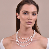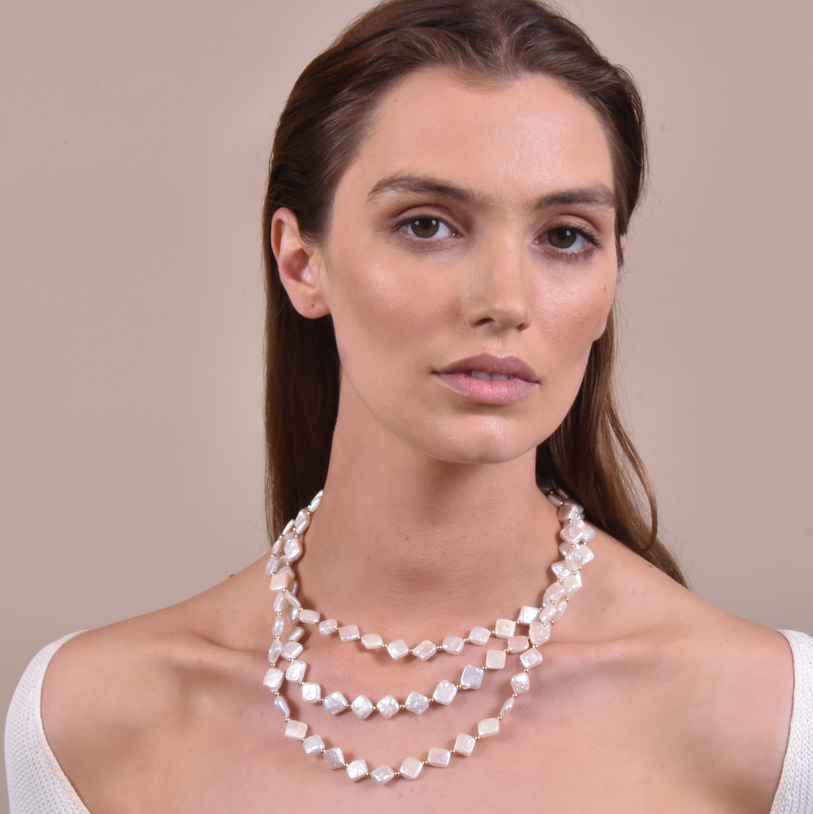 Luxury, sophisticated and one of a kind. Introducing Florence Luxury Diamond Pearl Layering Necklace - a luxurious artisan-crafted pearl art piece for lovers of luxury and uniqueness. This design features natural diamond-shaped freshwater pearls hand-threaded with gold beads separating each pearl. The neckpiece falls in an elegant fashion with 3 strings of pearl drapes, with each string connecting to the circle clasps at 2 ends. The gold beads and clasps are made in environmentally friendly brass with 18k gold plating, adding a subtle gold sparkle to the piece, and complementing the pearl lustre and shimmer. A timeless pearl statement for luxury, vintage, evening, high-end styling, modern, coastal, formal, semi-formal, dressy, smart casual, and more. Hypoallergenic, nickel, cadmium and lead free.