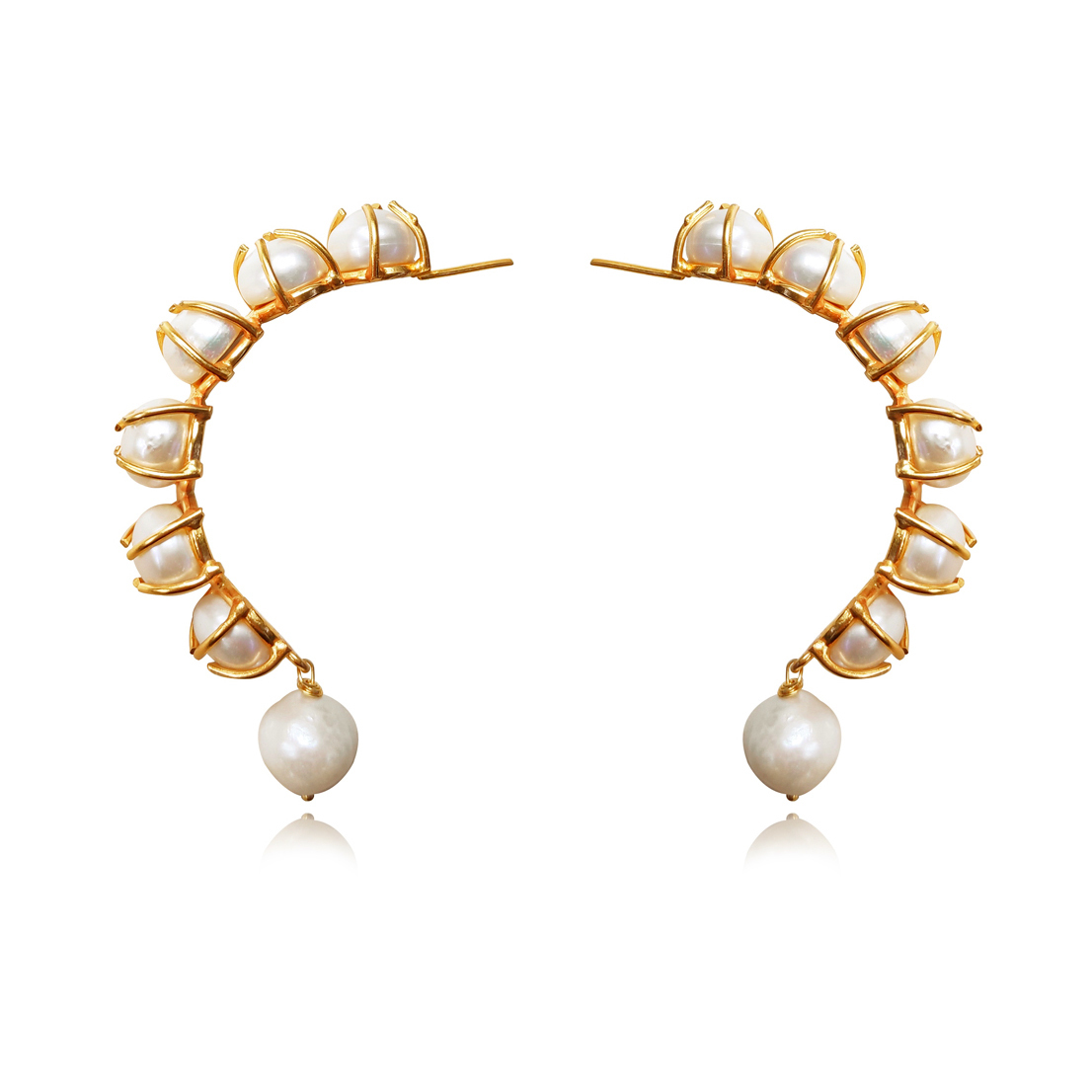 One of a kind pearl luxury handcrafted with passion, style and love. Introducing Francine 24K Luxury Pearl Sculpture Earrings - a sculpture inspired pearl ear art for lovers of the exquisite and the unique. This design features two ear-shaped semi circle curved frames with 6 pearls mounted via prone settings on each frame. At the end of each gold frame is attached a single dangled pearl. The earrings are made of premium quality environmentally friendly brass (nickel free) with 24k pure gold plating (2.5 microns heavy gold plated), giving the pieces a rich gold shine that is luxurious and enduring. These pearls are premium quality Mediterranean freshwater pearls, each pearl is full in shape and of stunning lustre. A head-turning luxury statement perfect for formal, semi-formal, dressy, wedding, bridal, evening, red carpet, celebrity styling, high fashion styling, coastal, smart casual styles and more. Hypoallergenic, nickel, cadmium and lead free.