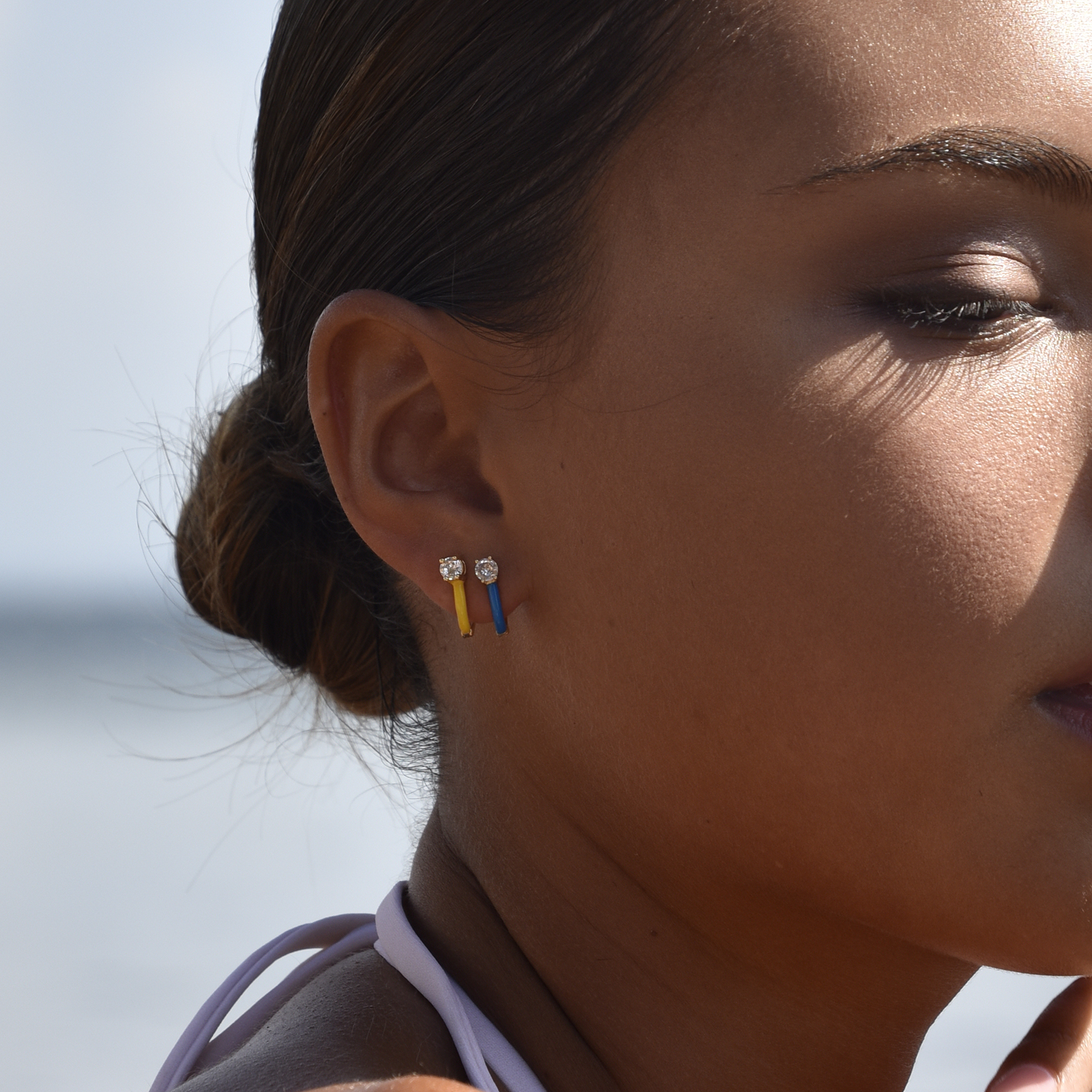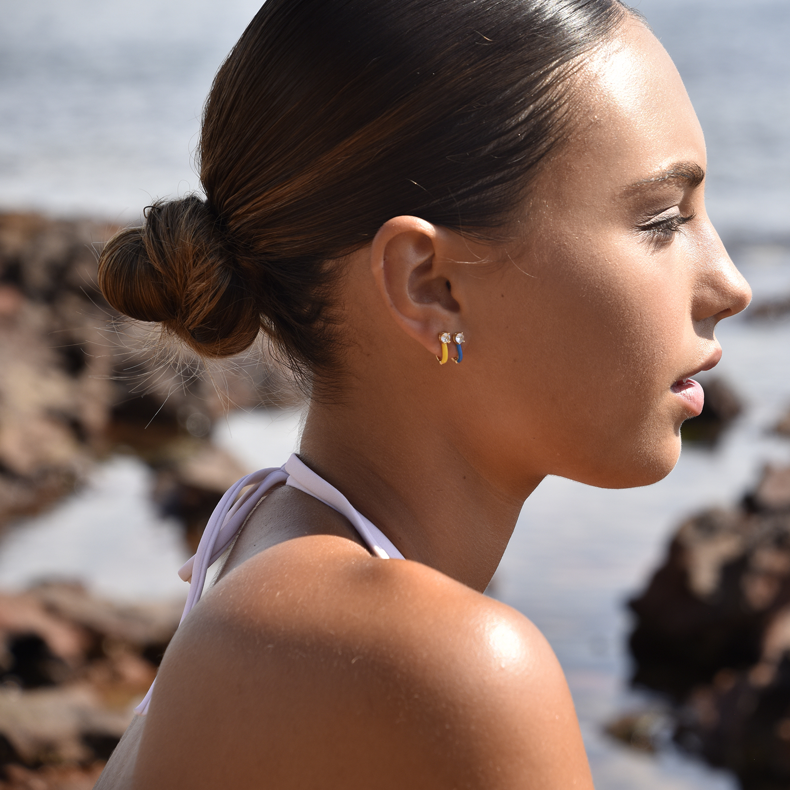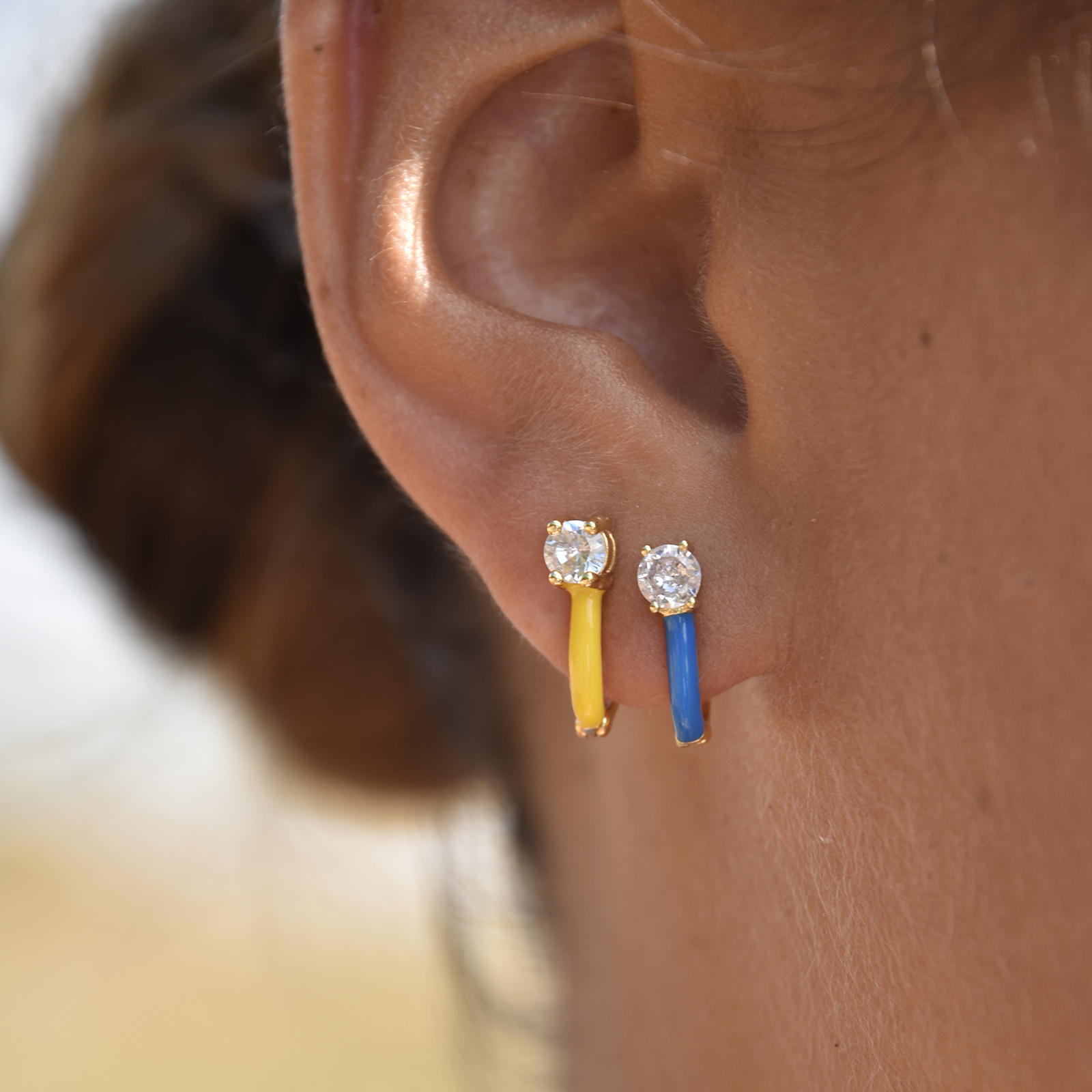 Life is a sea of vibrant colours, jump in. Introducing Gabriela Diamante Enamel U Huggie Earrings (Blue) - a trendy and chic casual ear love to brighten your mood and presence. This design features U-shaped huggie earrings with the front in a blue enamel coating, adorned with a clear diamante on the top. The earrings are made in environmentally friendly brass with 18K gold plating. Perfect for woman and girls of all ages and for all personal styles. Perfect for layering.