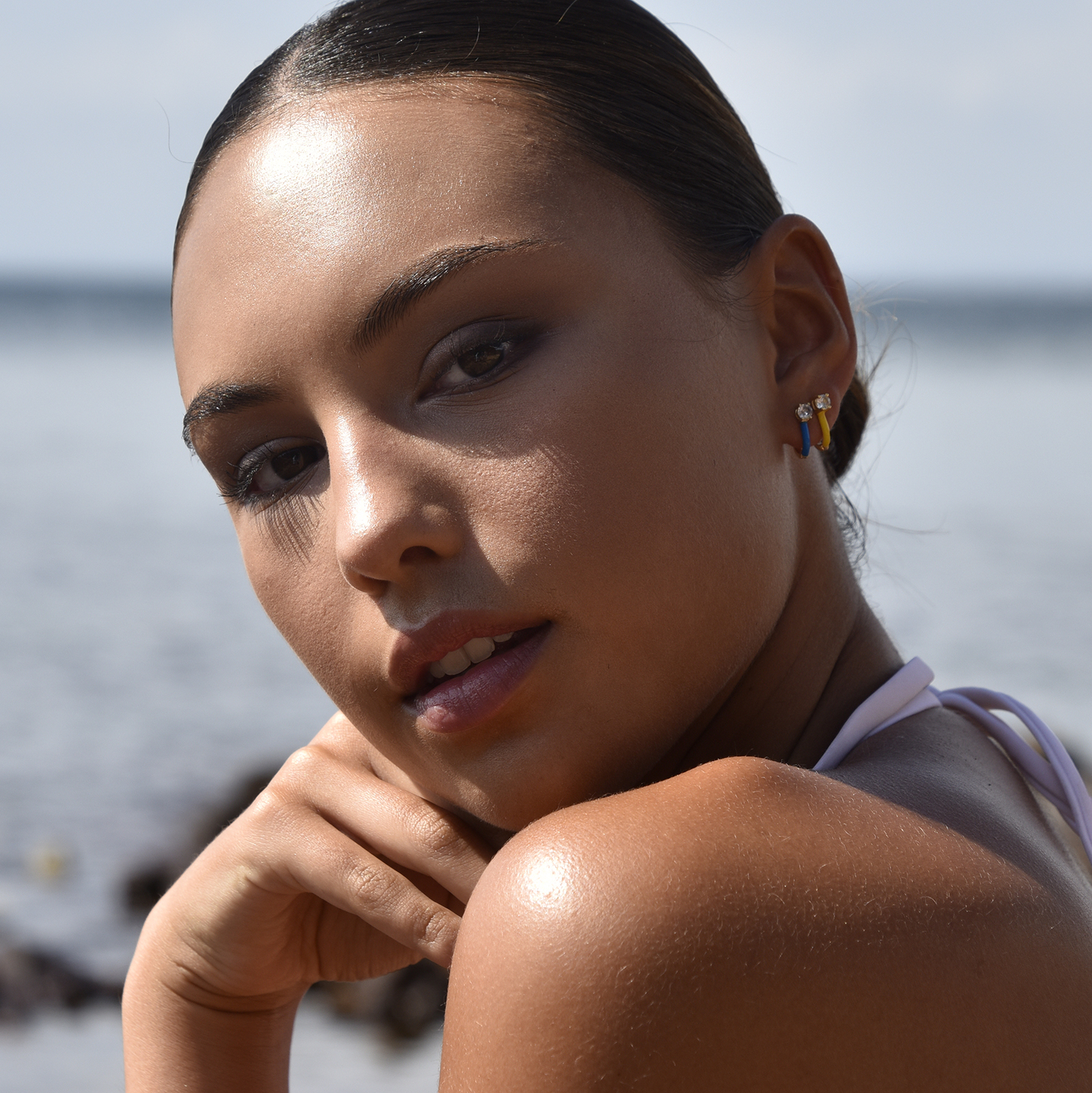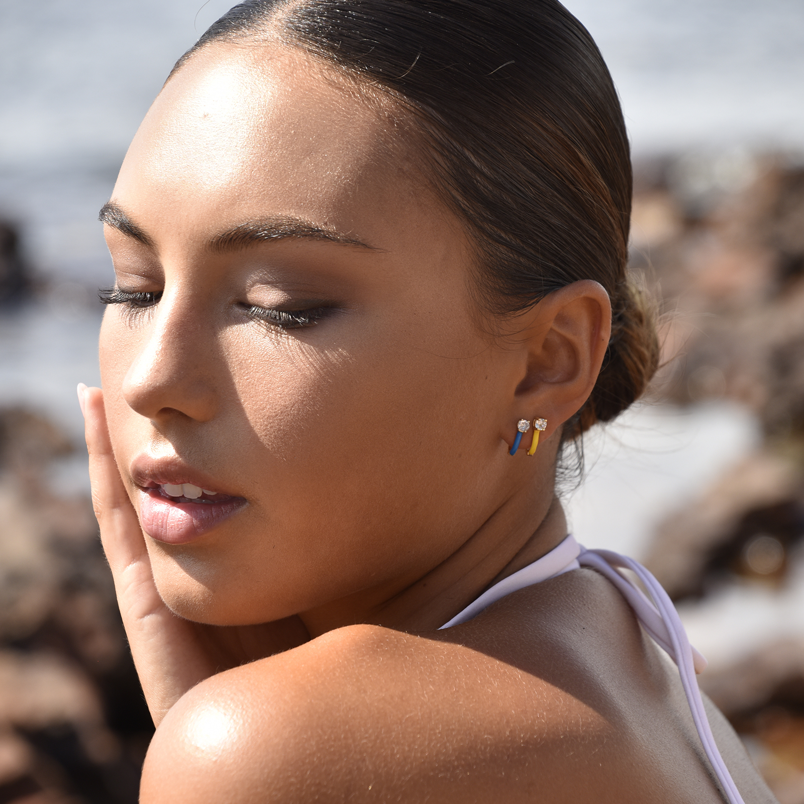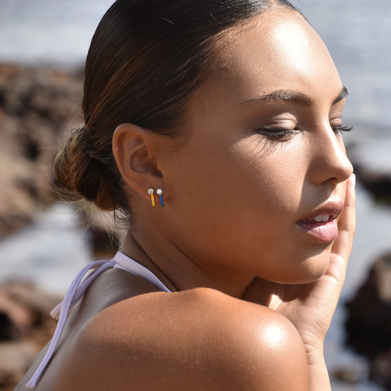 Life is a sea of vibrant colours, jump in. Introducing Gabriela Diamante Enamel U Huggie Earrings (Blue) - a trendy and chic casual ear love to brighten your mood and presence. This design features U-shaped huggie earrings with the front in a blue enamel coating, adorned with a clear diamante on the top. The earrings are made in environmentally friendly brass with 18K gold plating. Perfect for woman and girls of all ages and for all personal styles. Perfect for layering.