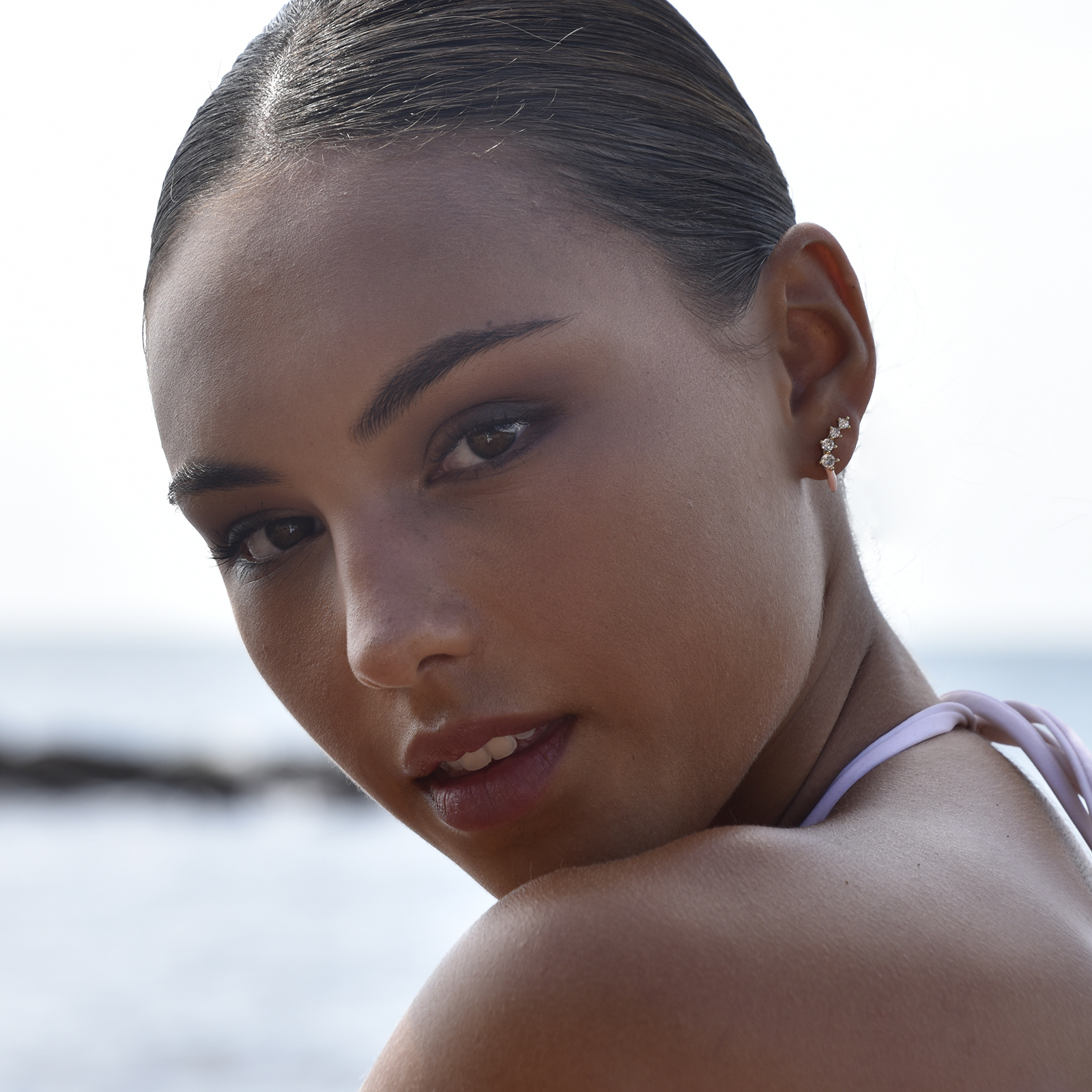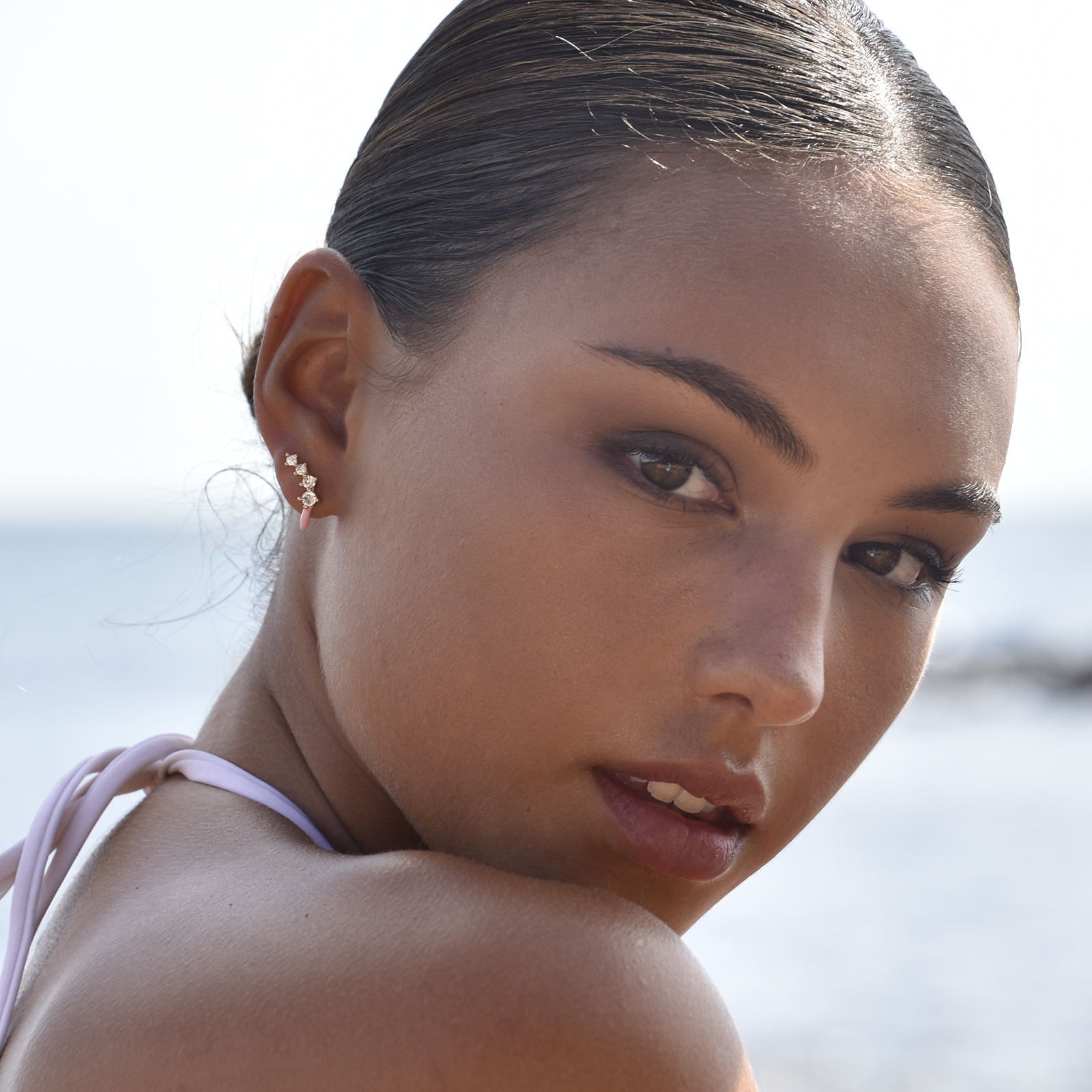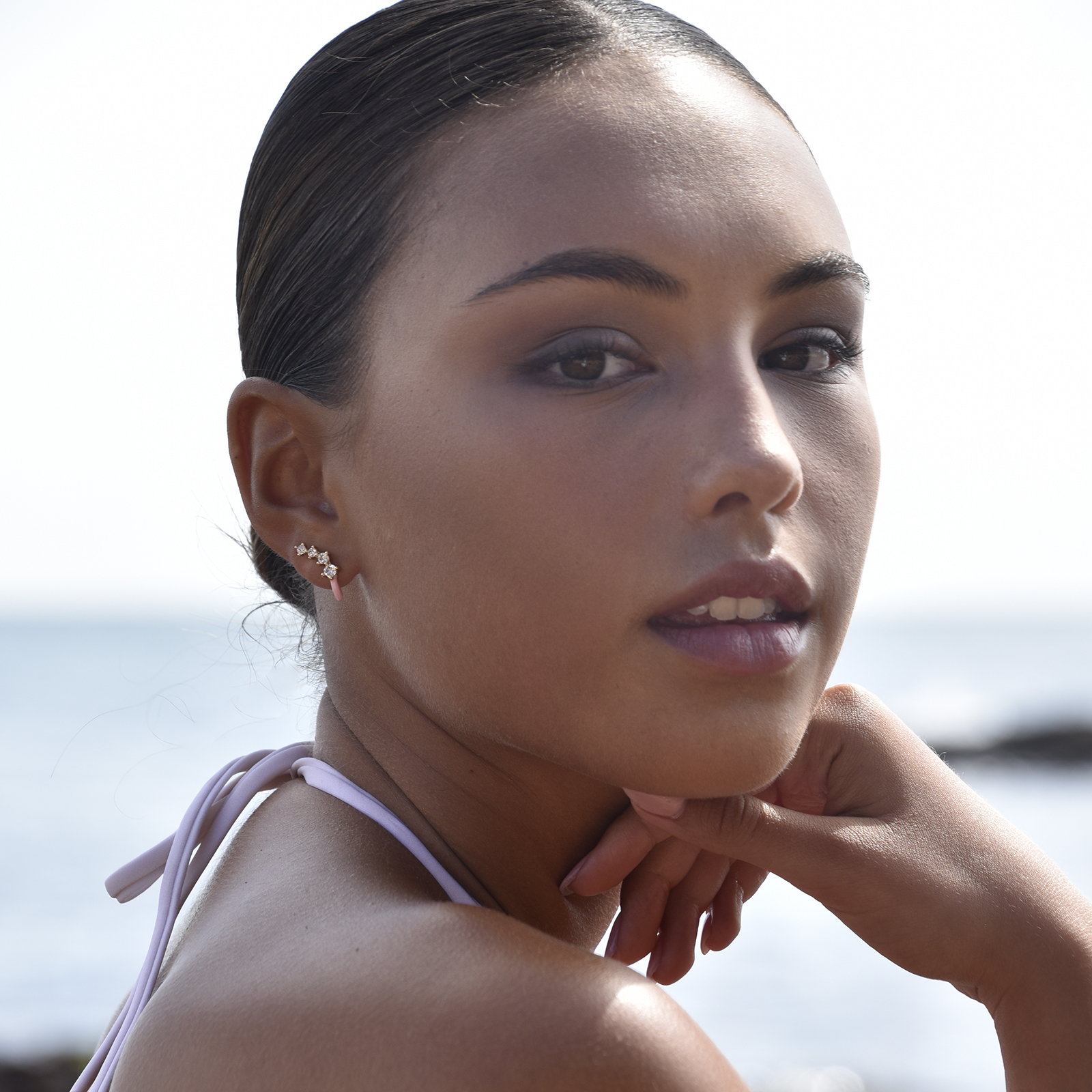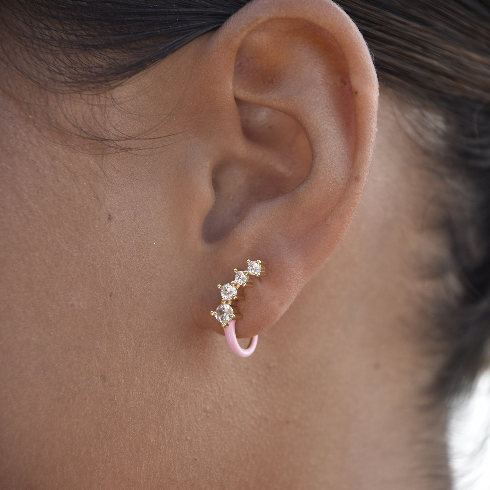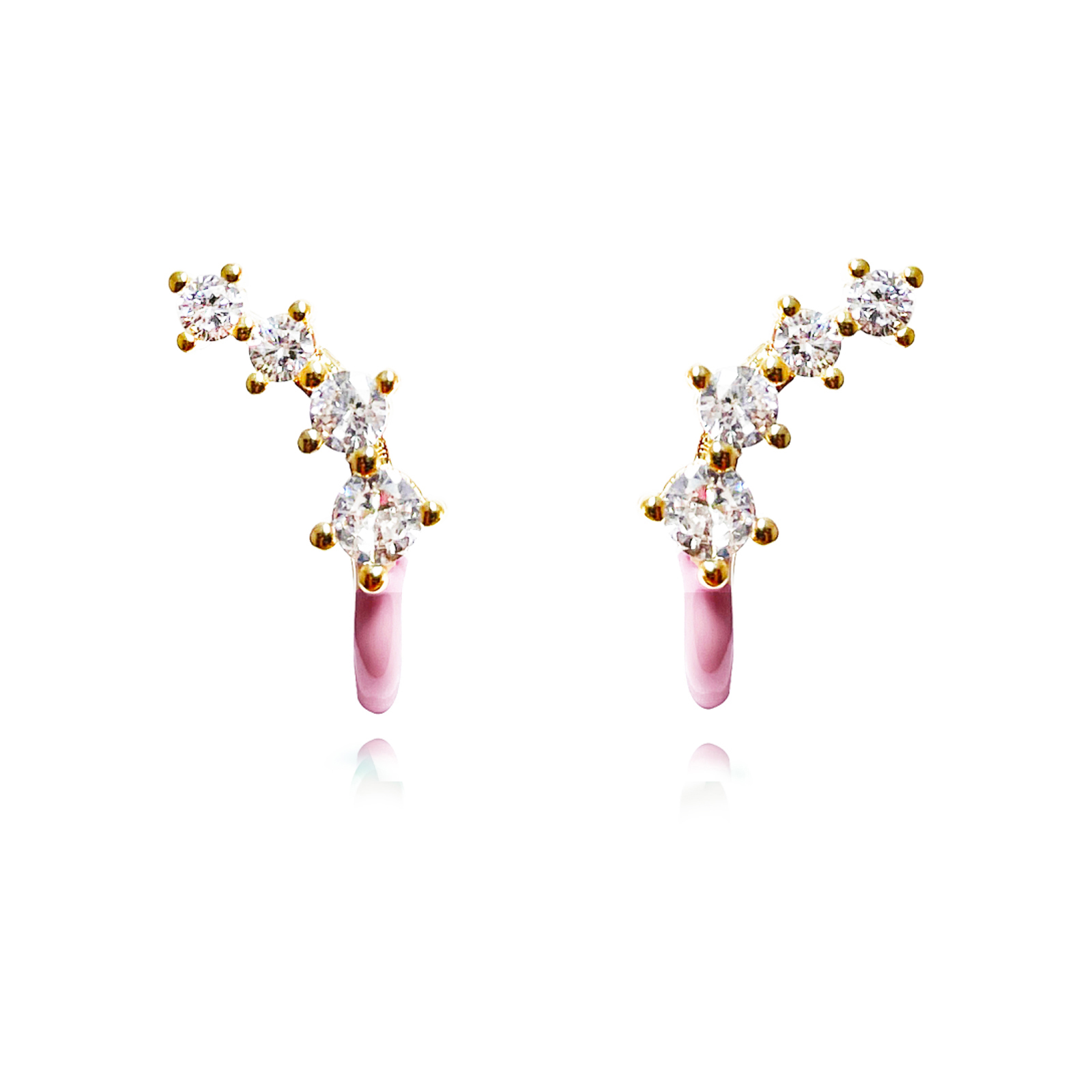 Dreamy pastels adorned with subtle wings of diamantes. Introducing Gabrielle Artsy Pastel Diamante Climber Earrings (Pink) - an artsy and unique ear piece for style hunters after something subtle yet different. This design features stud earrings with a curved row of Austrian zirconia diamantes connected with a U-hook underneath in pastel pink enamel coating. The climbing diamantes form a gentle shimmering curve on your ear while the U-hook hugs the earlobe. The earrings are made in environmentally friendly brass with 18K gold plating. Perfect for modern, creative, chic, minimalist, earring layering, smart casual, casual, everyday styles and more. Perfect for layering.
