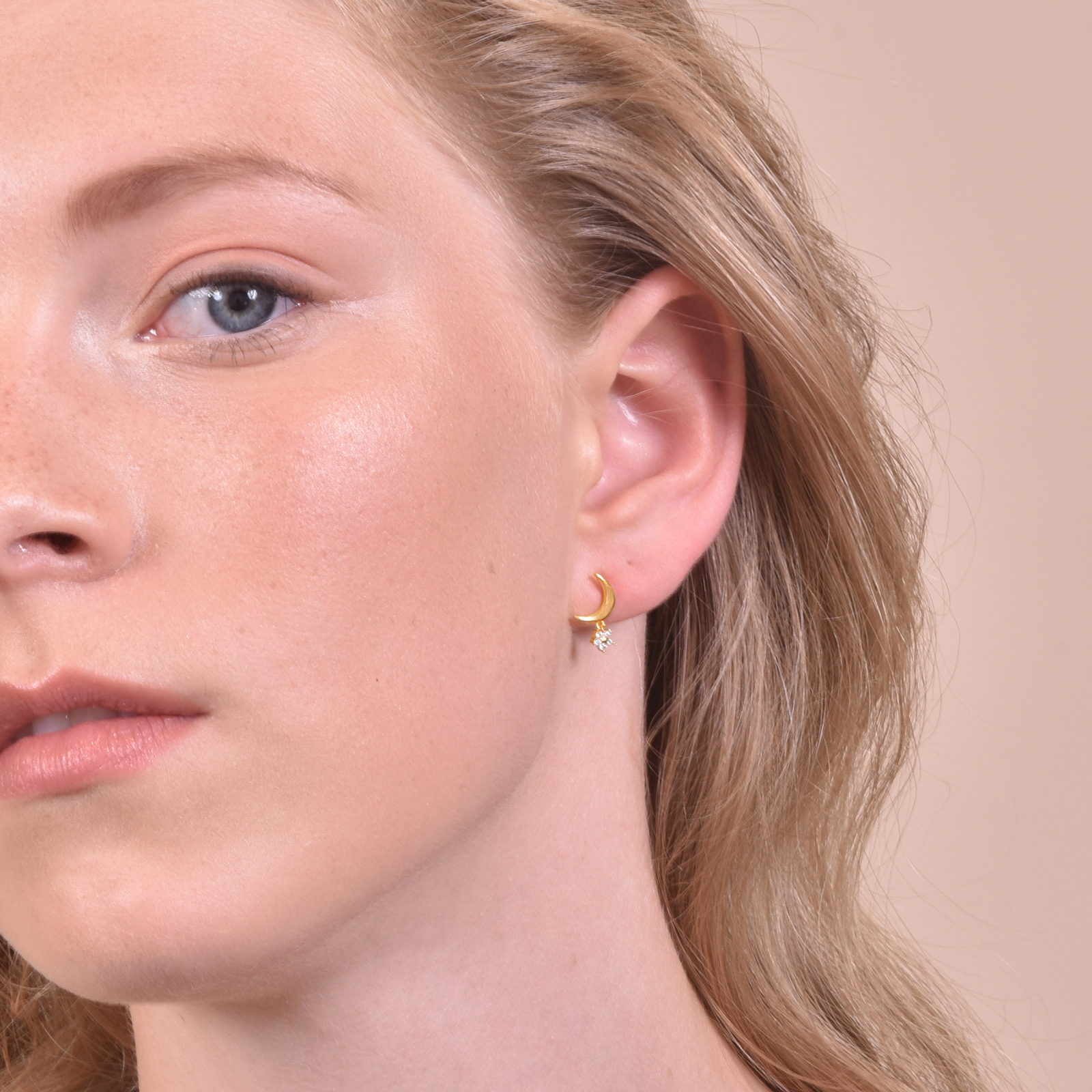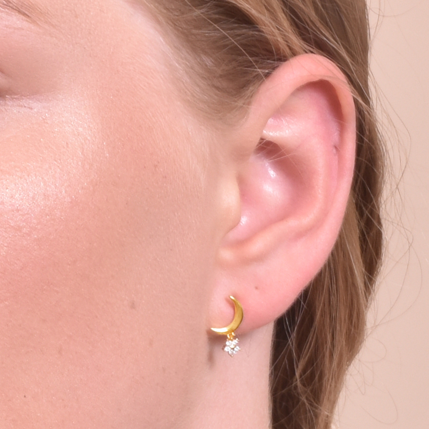 Delicacy in its soft and finest expression, introducing Gemma Gold Filled Dainty Moon Earrings — a feminine ‘ear classic’ for your everyday and timeless styling. This adorable design features moon crescent in a subtle curve with a gorgeous drop of fine Austria cubic zirconia, giving your ear a fine shimmer that is elegant and classy. This design is crafted in solid sterling silver with 18K rolled gold (gold filled) for a thick gold bonding that shines rich and is also tarnish resistant. Perfect for everyday, minimalist, elegant, feminine, chic, modern, vintage, casual, mismatching styles and more. Hypoallergenic, nickel, cadmium and lead free.