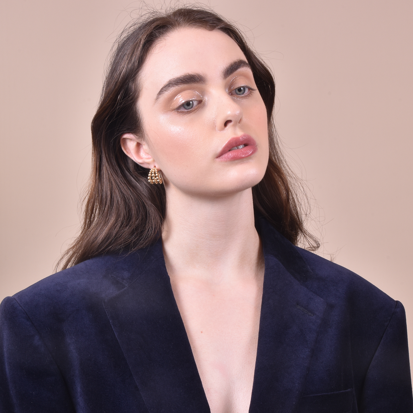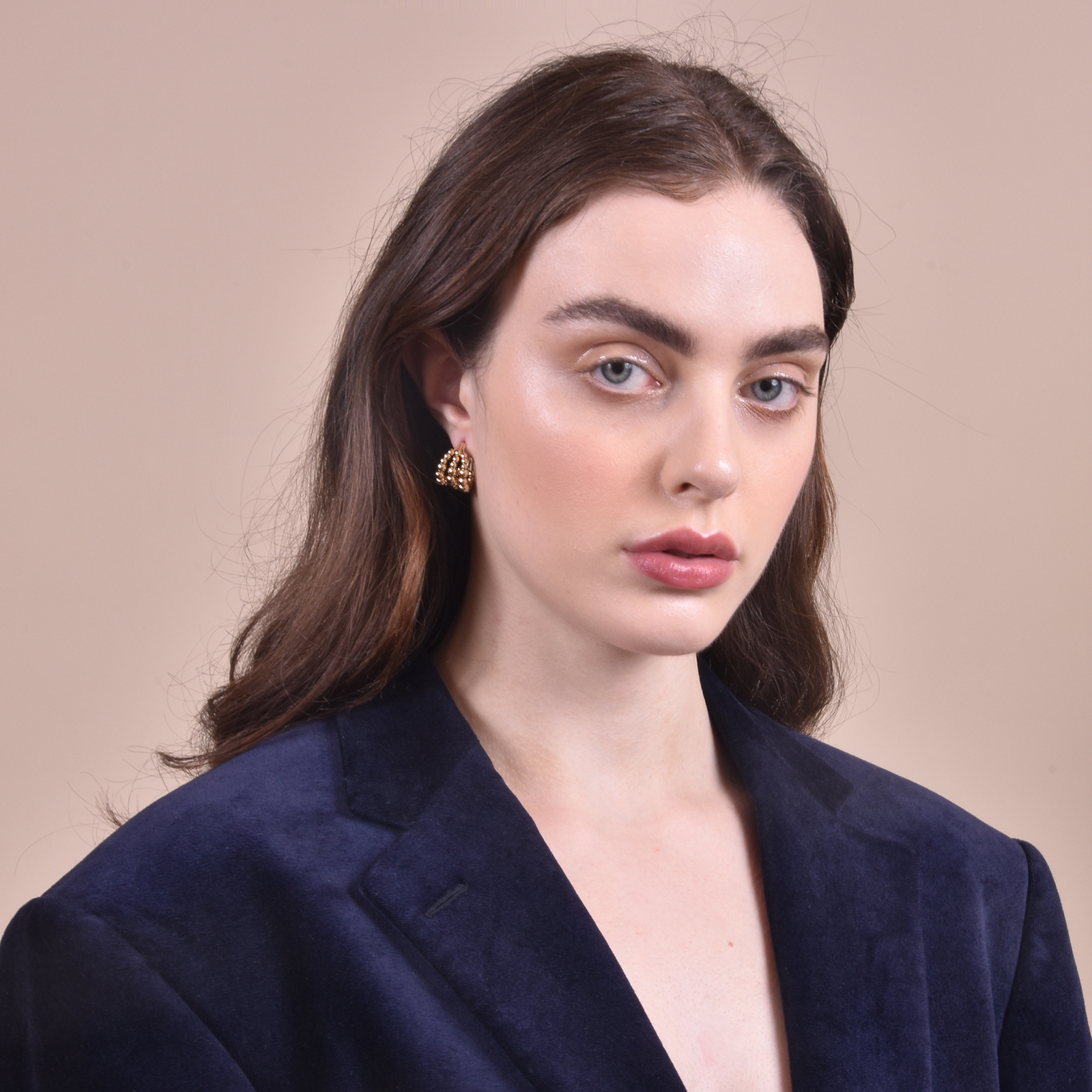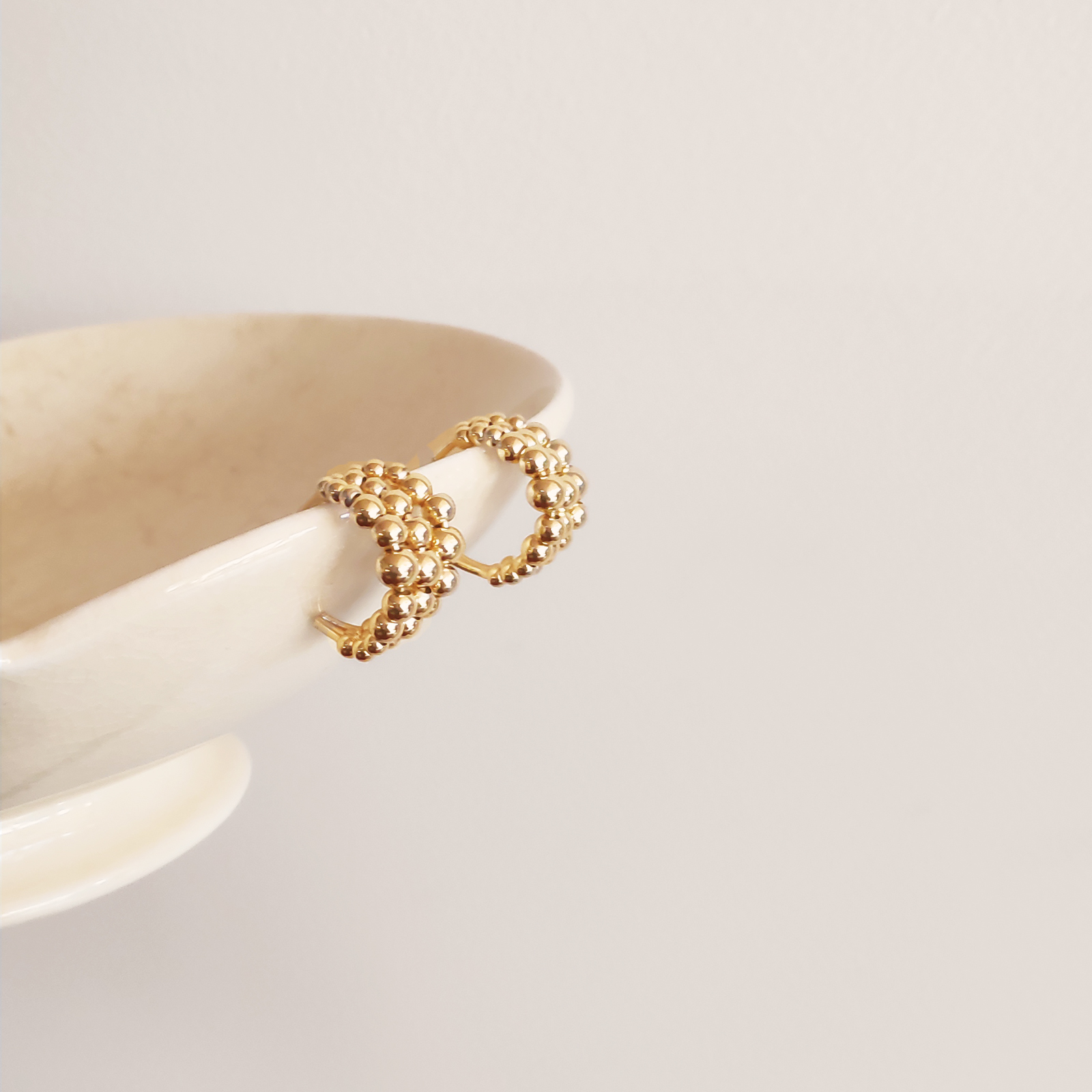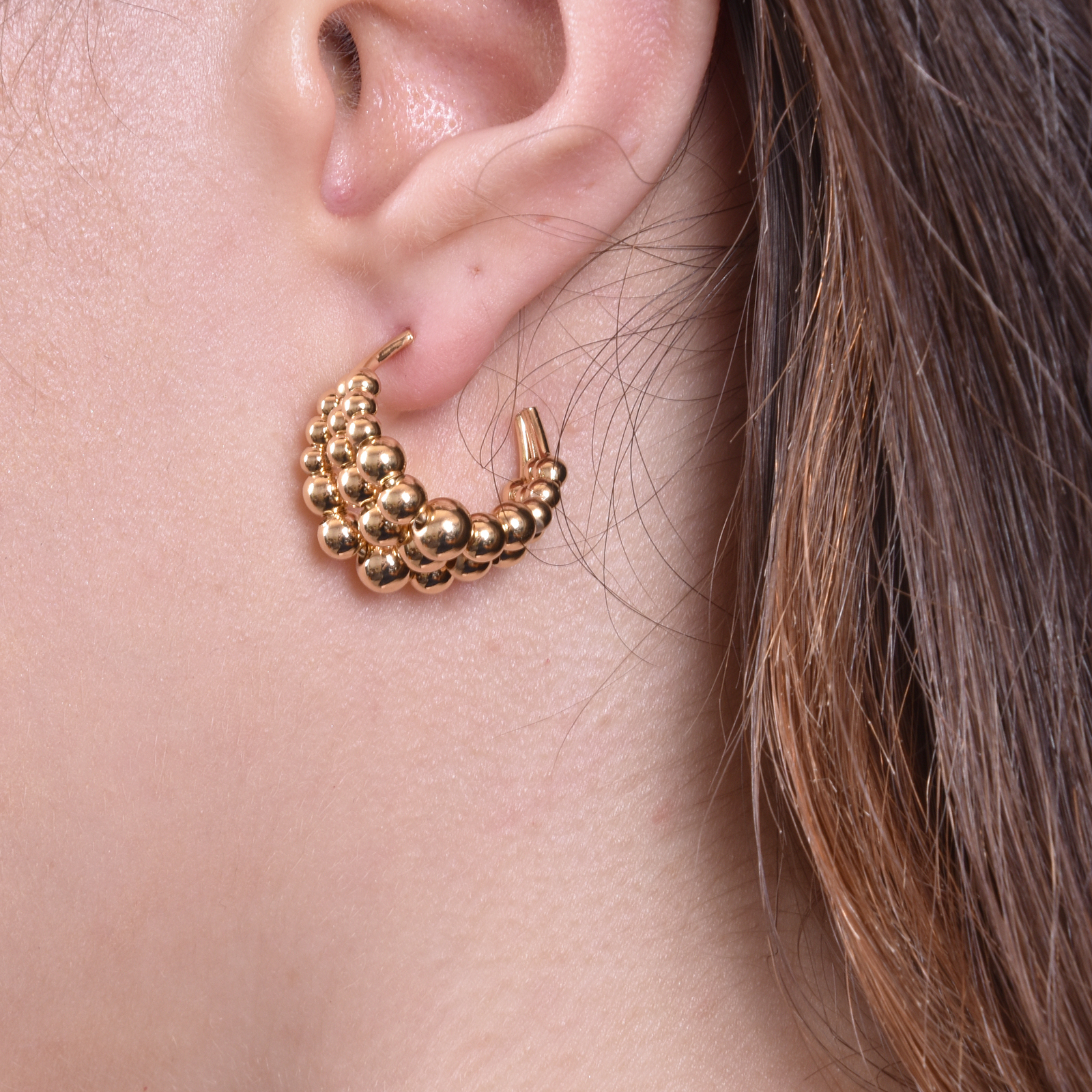 Curve of beads and movement of gold, introducing Gianna Curved Beads Earrings - a contemporary-minded modern design incorporating elements of shapes and angles. This modern design is crafted in environmentally friendly brass (nickel free) with 14K gold plating and sterling silver earring posts. Succinct, 'attitudy' and creative, this style is perfect for casual, punk, modern, minimalist, and everyday styles. Lead, nickel, and cadmium free.