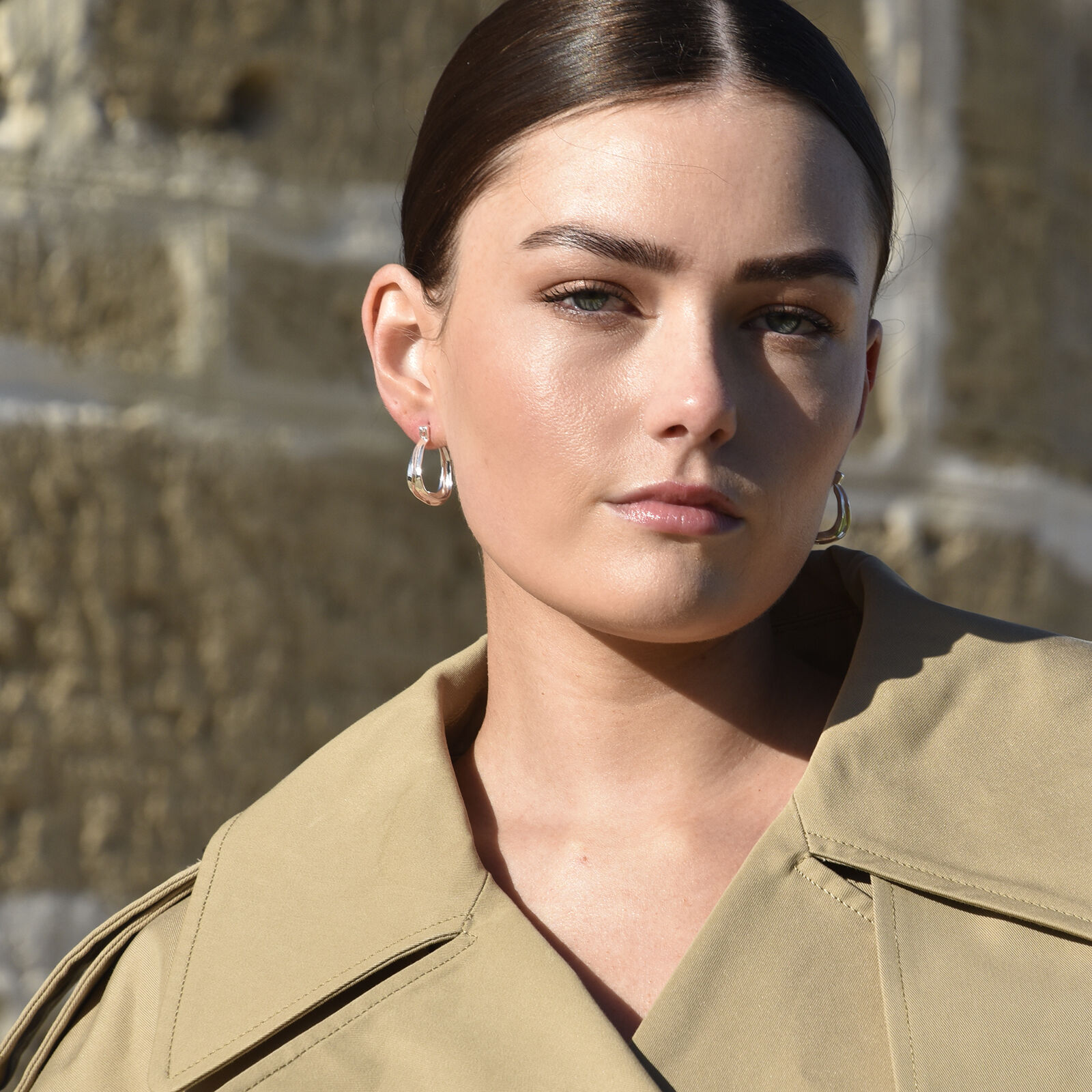 Introducing Giverny Artisan Fluid Huggie Earrings (Silver) - a modern and artsy style ear love blending stillness and movement. This design features sculptured huggie hoops embracing subtle folds and asymmetric beauty. The earrings are made in solid sterling silver with white rhodium plating for hypoallergenic, an extra anti-tarnish protection and enduring wear. Perfect for contemporary, creative, chic, layering, smart casual, casual and everyday styles. Hypoallergenic, nickel, lead, and cadmium free. Available in gold or silver.