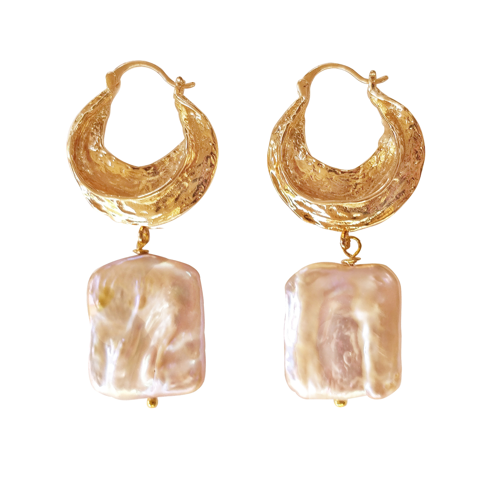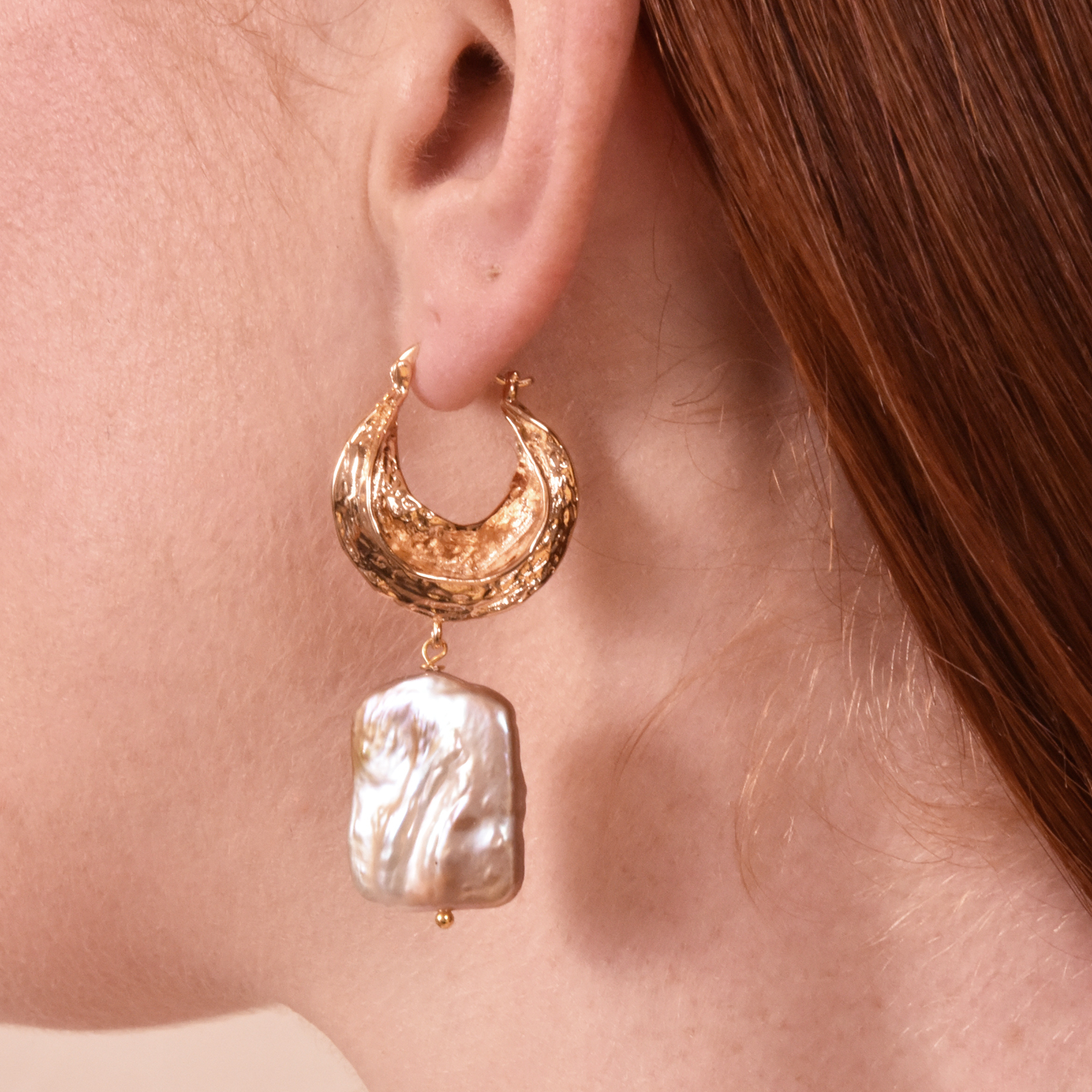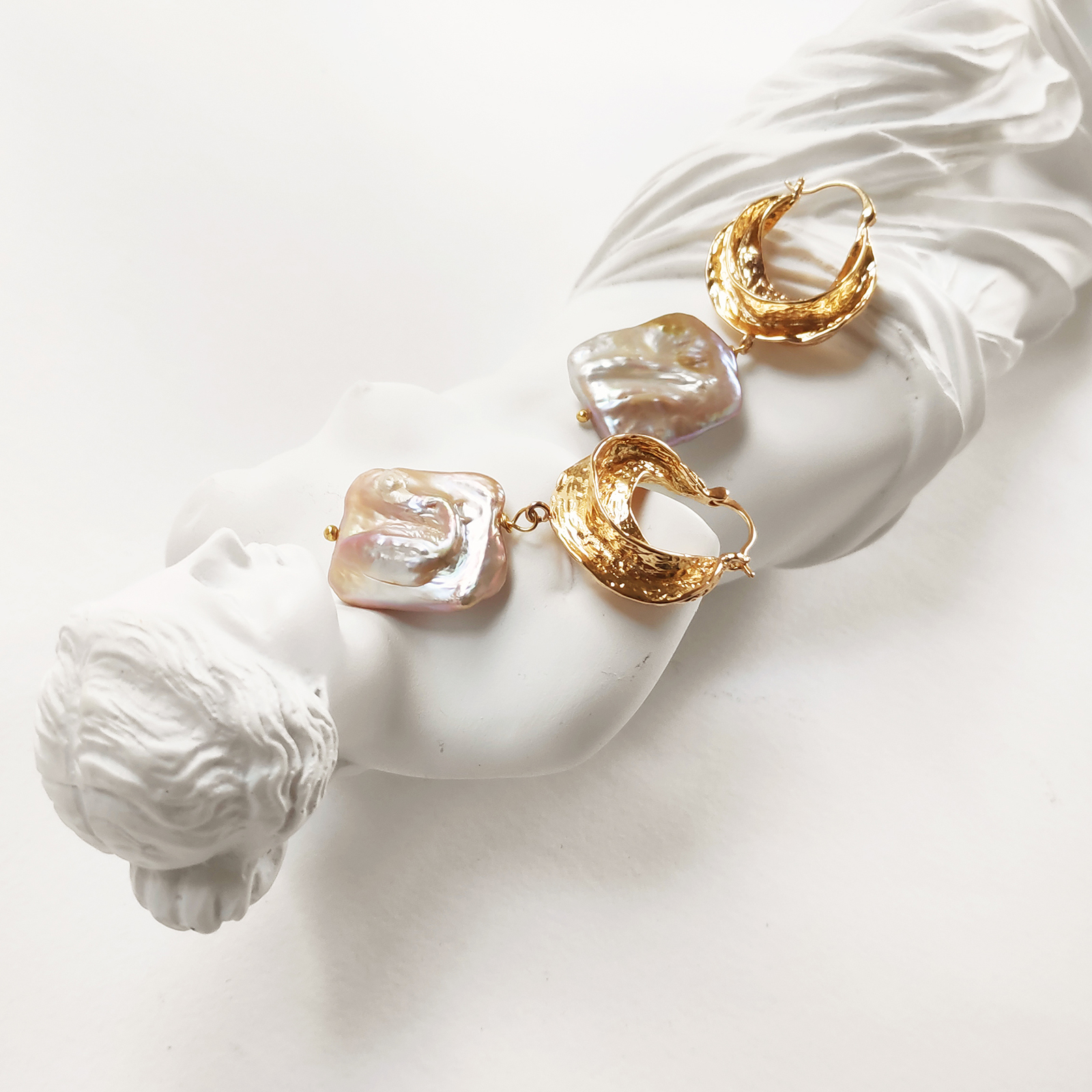 Sold OutA luxury combination of 18K gold plated textured huggie and sequin-toned big baroque pearls-- Glory Luxury Baroque Pearl Drop Earrings are another exquisitely handcrafted artsy piece that marks your fashion territory. The earring hoops are craved in environmentally friendly brass (nickel free) with authentic and artsy textures. The plating used on the hoops is 18K gold plating which is tarnish resistant. Detail-rich and timelessly classy, perfect for coastal, dressy, modern, fashion events, wedding, bridal, formal and semi-formal occasions.
