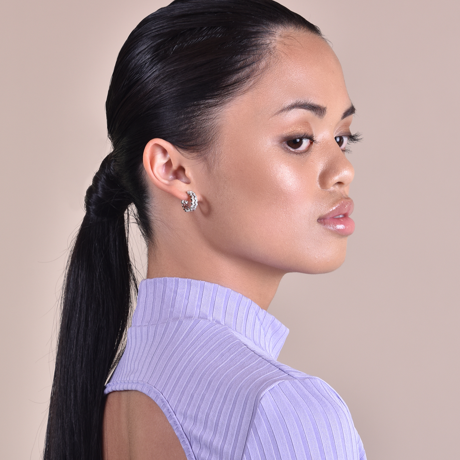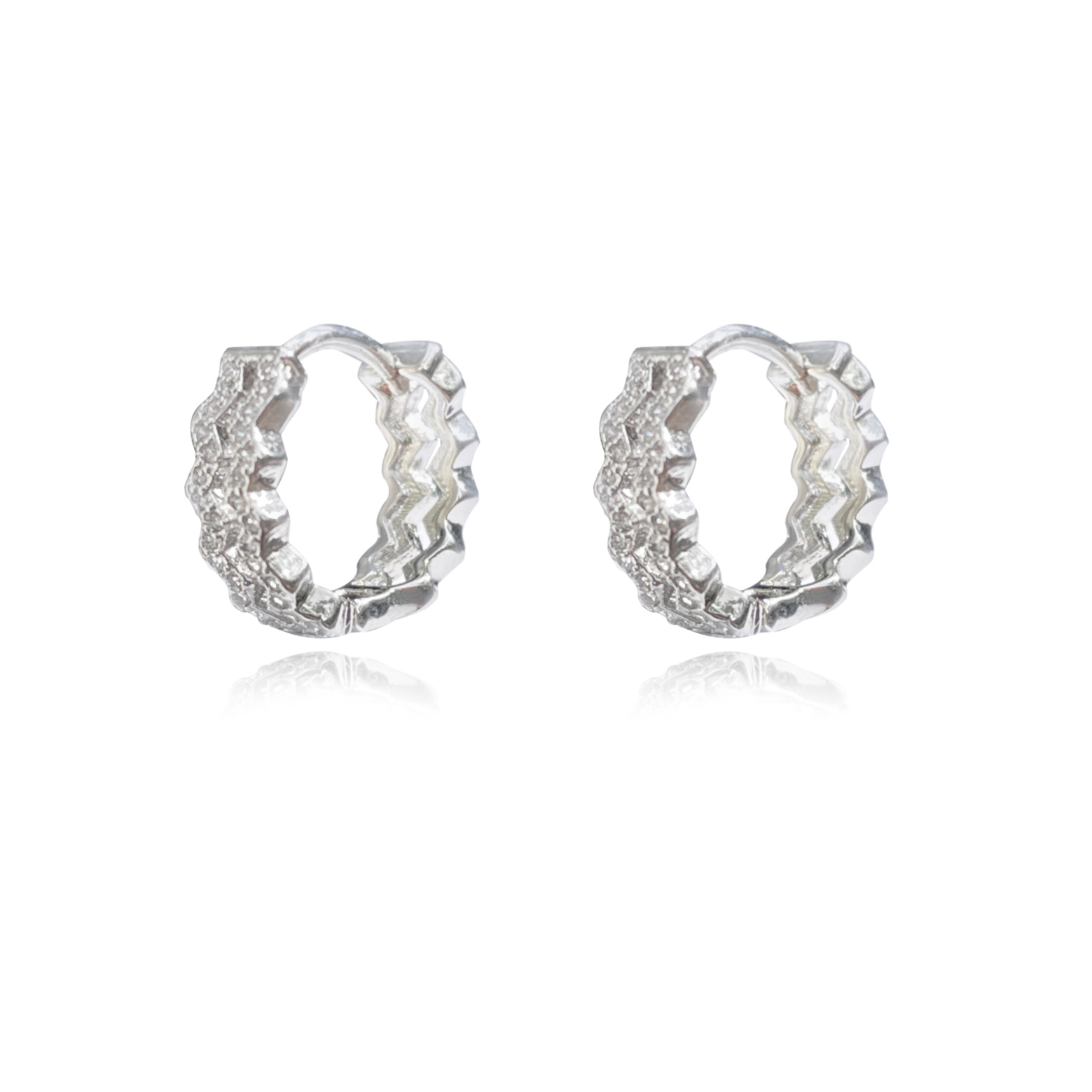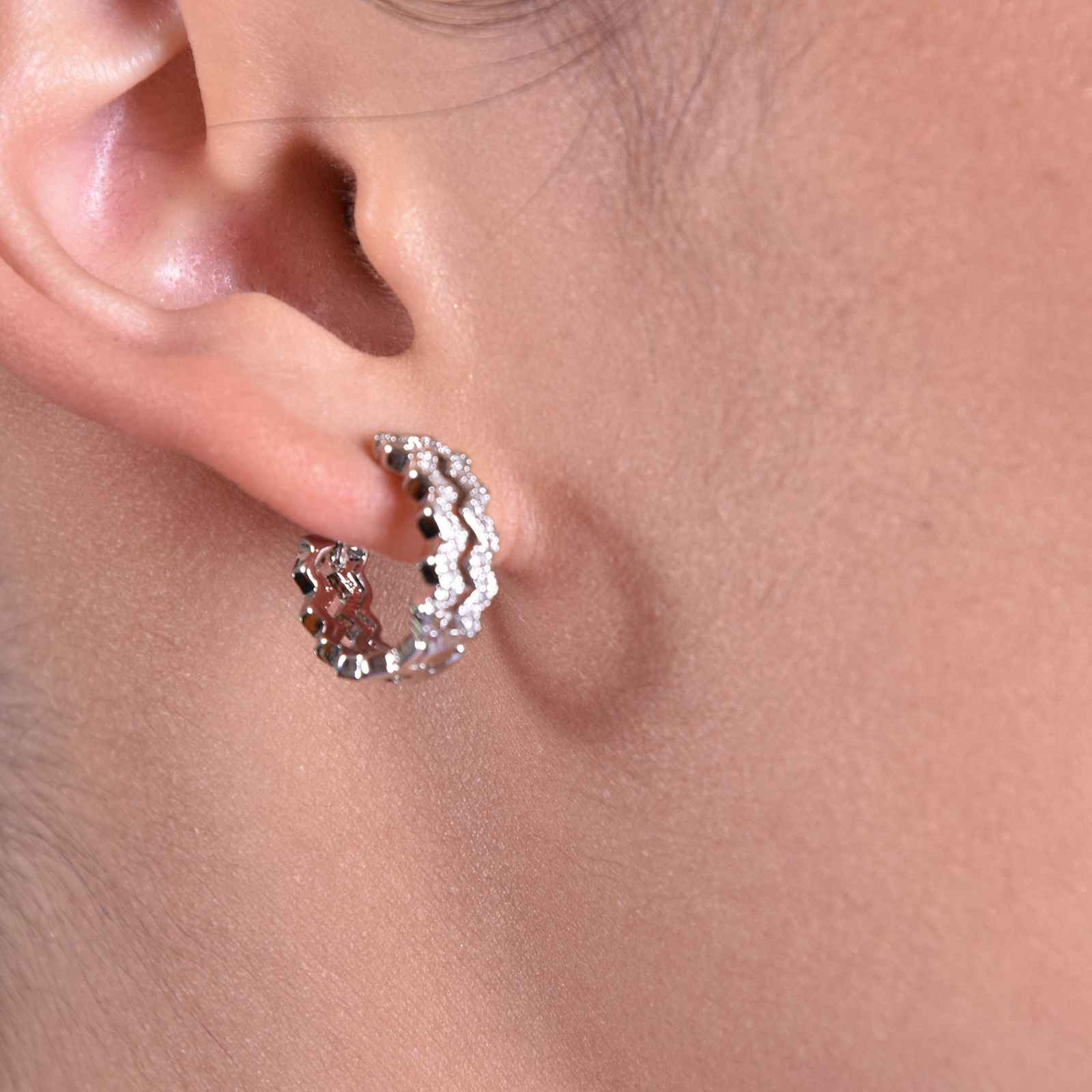Classy, chic, and creative. Introducing Greta Artsy Wavy Silver Hoop Earrings - a modern style silver hoop for those who love something different. This design features double wavy hoops embellished on the front side with cubic zirconias. The earrings are made of solid sterling silver for hypoallergenic wear. Perfect for modern, chic, artsy, minimalist, earring layering, girly, casual, everyday styles and more. Hypoallergenic, nickel, cadmium and lead free.