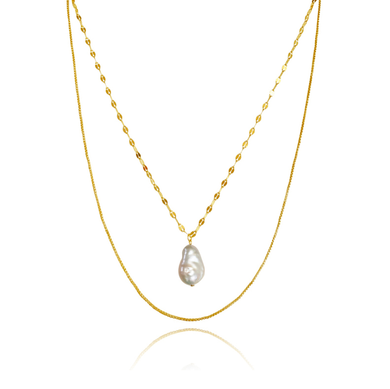 Chic and double the charm. Introducing Gwyn Layered Pearl Pendant Necklace - an elegant and feminine twin layering neckpiece adorned with a natural baroque pearl pendant. The short layer features a gold box chain and the longer layer features a standard fine gold chain, together forming a contrast length with a pearl shimmer. The necklace is made of solid sterling silver with 18k gold plating for hypoallergenic and enduring wear. Perfect for pearl lovers of all ages. Hypoallergenic, nickel, cadmium and lead free.