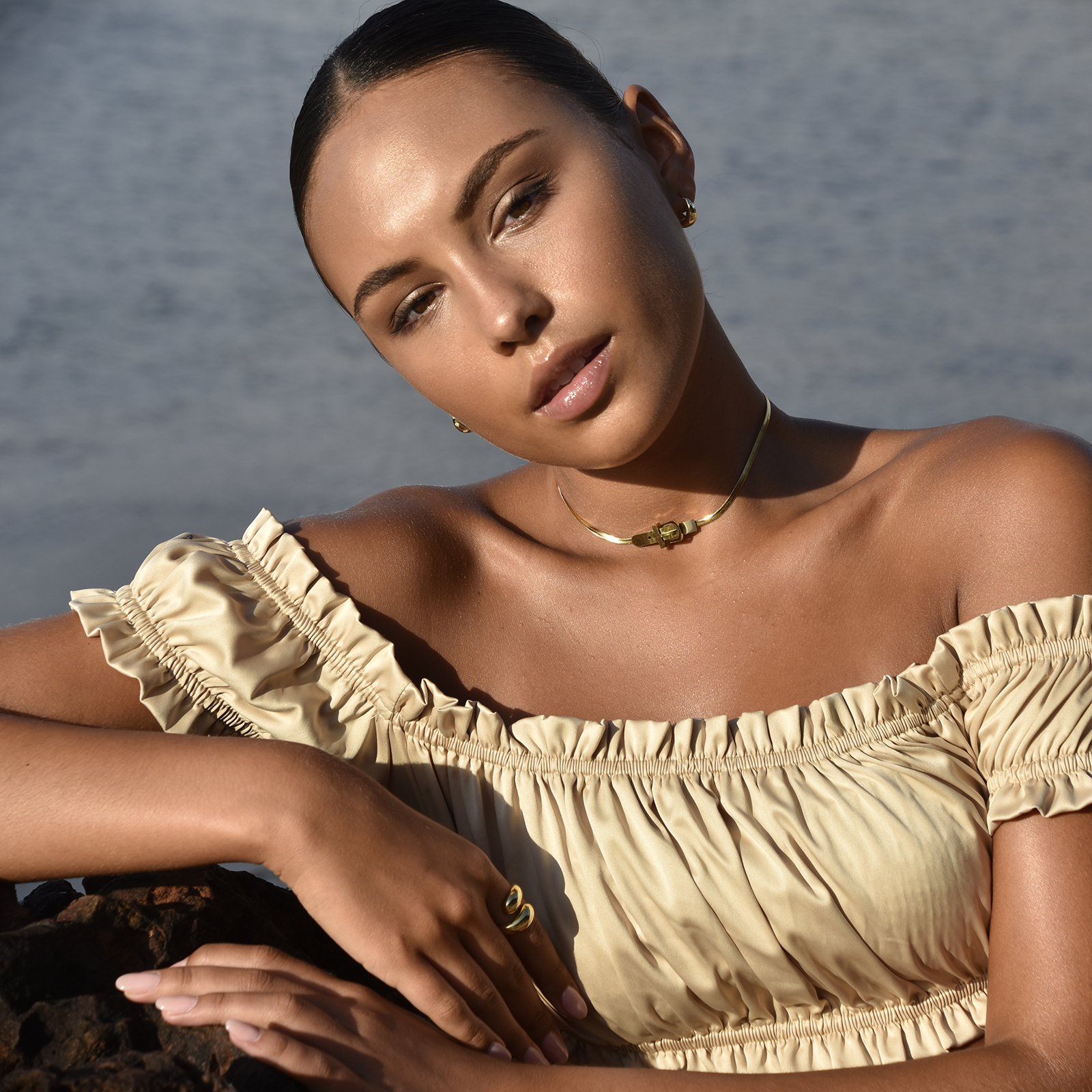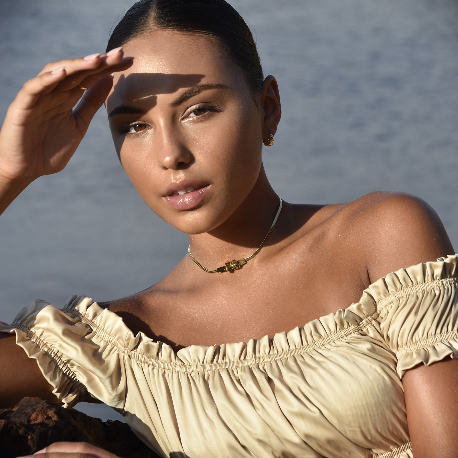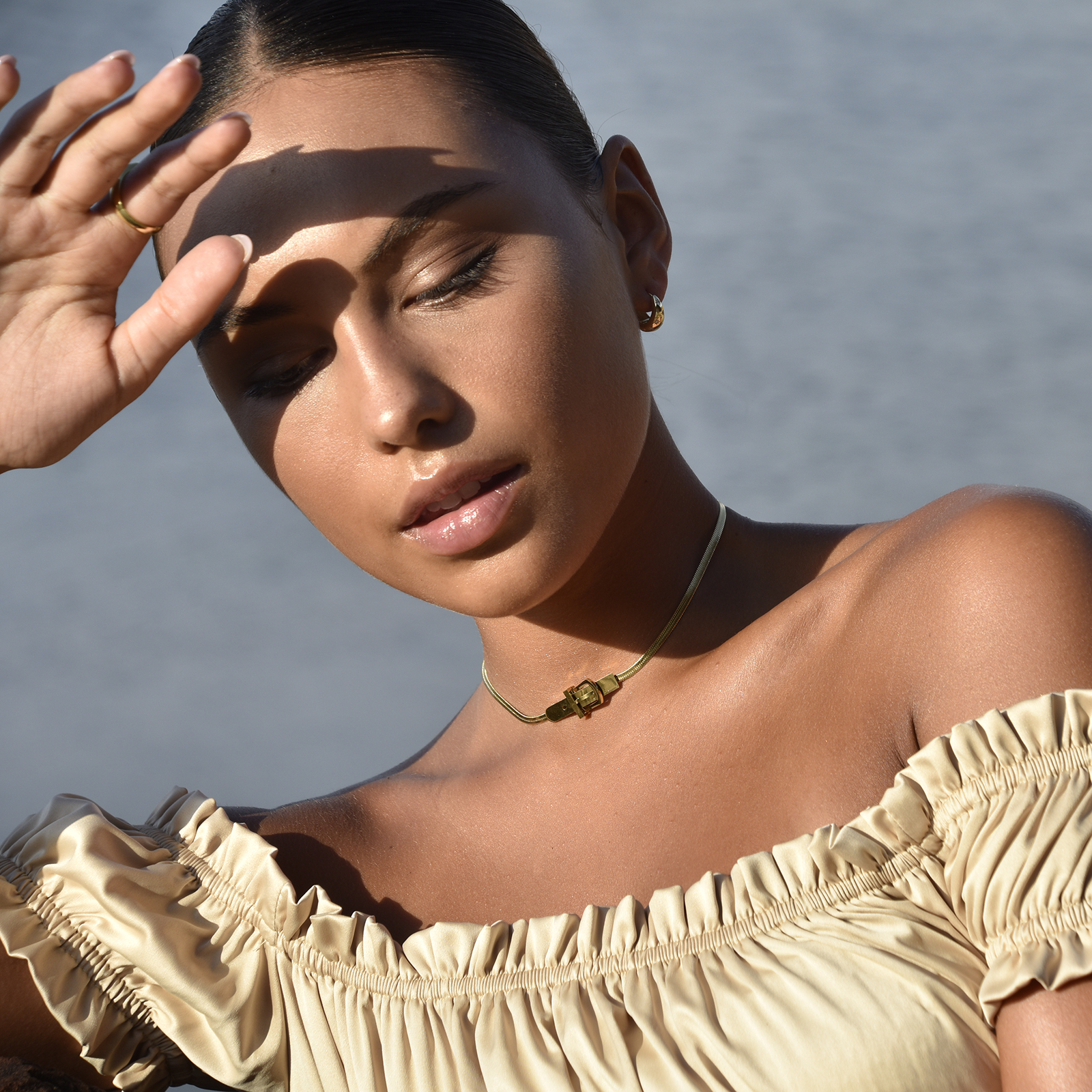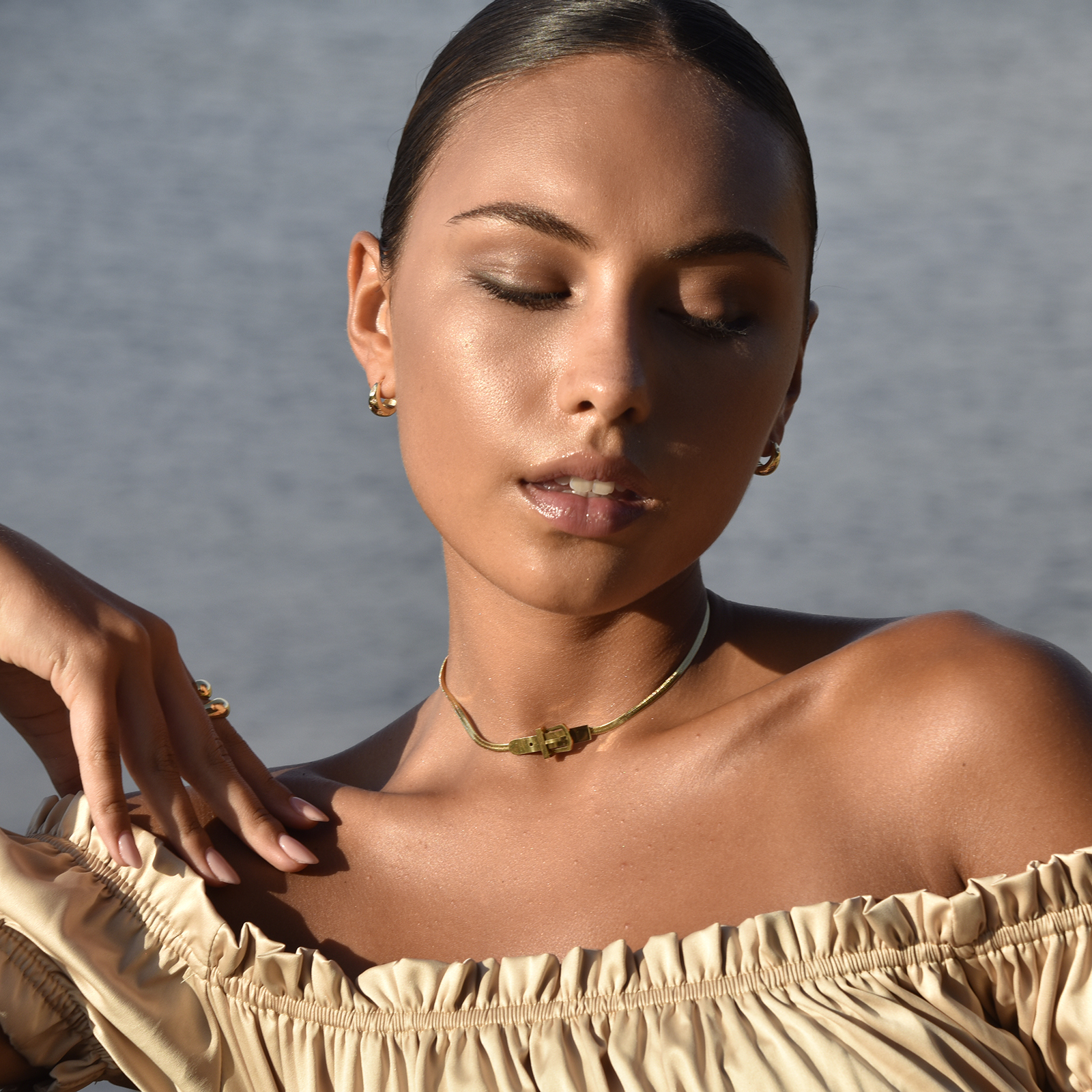 Modern, chic with a cool attitude. Introducing Hallie Buckled Snake Chain Necklace (Gold) - a contemporary snake chain neckpiece with a pop of coolness. This design features a standard gold snake chain with a buckle feature in the middle. The necklace is made in environmentally friendly stainless steel with 18K gold plating. It is 37cm in length (including a 5cm adjustable link) and 8g in weight. Perfect for modern, chic, punk, minimalist, necklace layering, smart casual, casual style and more. Available in gold or silver.