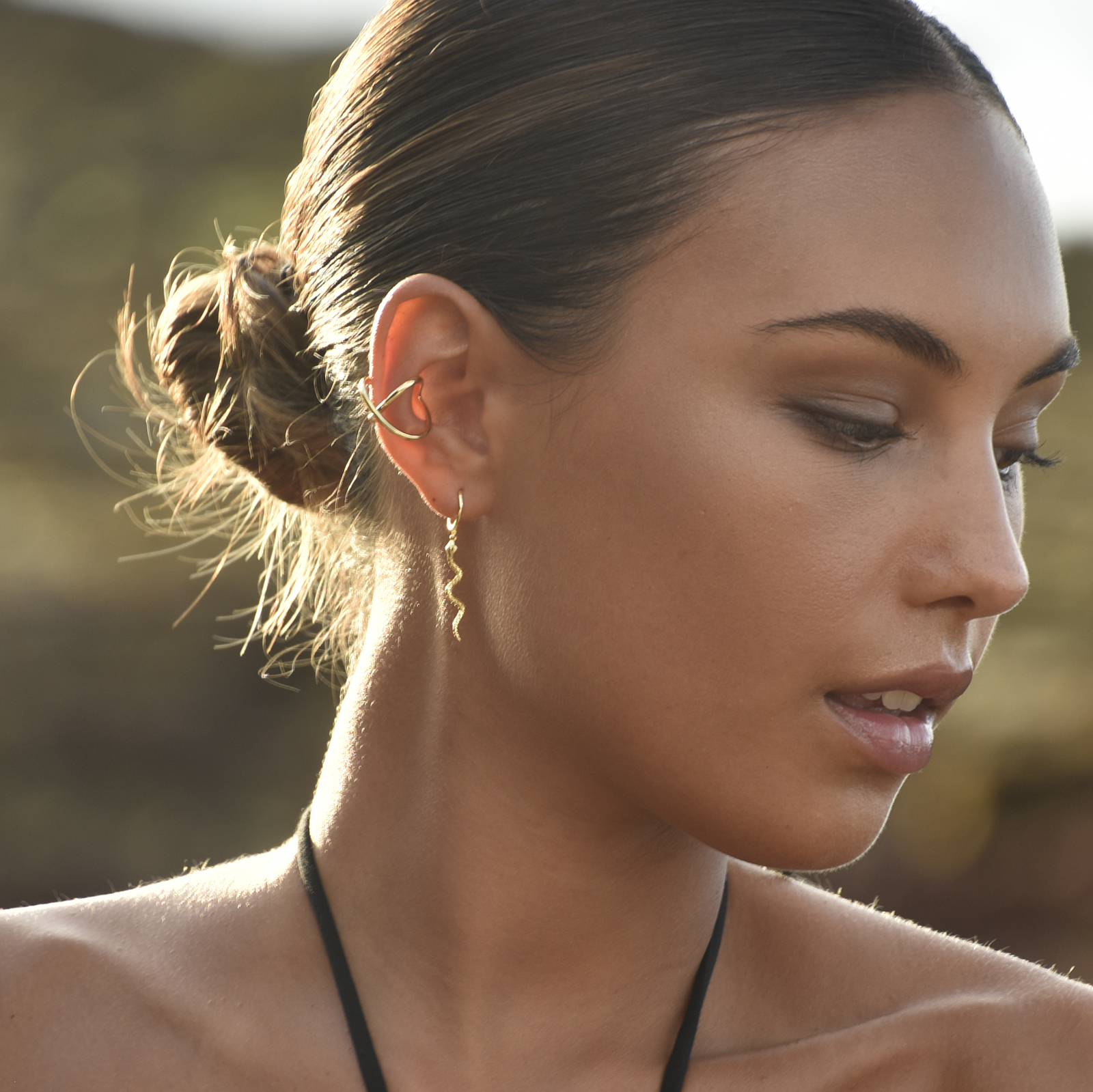 Artsy vibe with a modern edge. Introducing Harlow Sculptural Intertwined Cuff Earring (Single Piece Gold) - an art deco style cuff ear love inspired by contemporary sculpture. This design features a unique intertwined design that joins at both ends - ready to be clipped along your helix area. This cuff earring is made in solid sterling silver with 18K gold plating for a noble gold shine and hypoallergenic wear. The opening of the ear cuff can be easily adjusted manually for your ideal fit. Perfect for modern, artsy, creative, chic, punk, smart casual, casual and for non-pierced ears. Available in gold or silver. Hypoallergenic, nickel, lead, and cadmium free. Suitable for unisex wear.