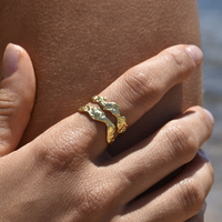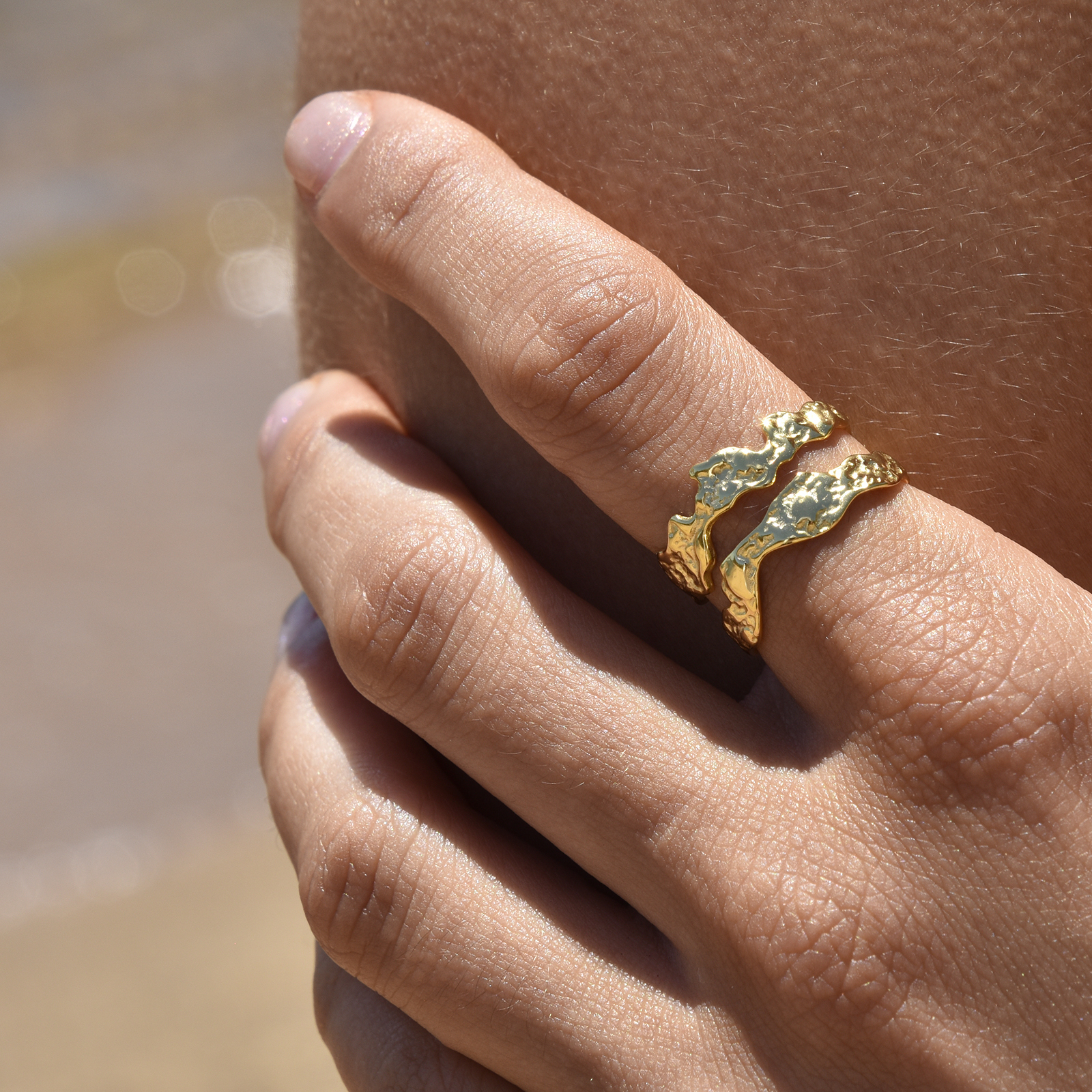Artsy, textural, with a dual line hug. Introducing Hendrix Sculpture Twin Line Open Ring (Gold) - a Nordic style finger beauty inspired by coastal textures. This design features a textured twin line ring band that is joined at each end. This ring is made of solid sterling silver with 2.5 microns of 18K gold plating (to Gold Vermeil Jewellery Standard and is 4 times thicker than gold plating used in average fashion jewellery). It can also be easily adjusted manually for your ideal fit. Perfect for modern, artsy, creative, coastal, ring layering, bohemian, chic, punk, smart casual, casual, everyday style and more. Hypoallergenic, nickel, cadmium and lead free.