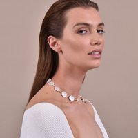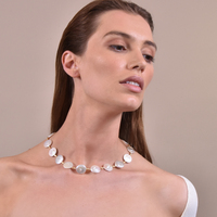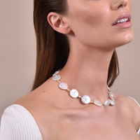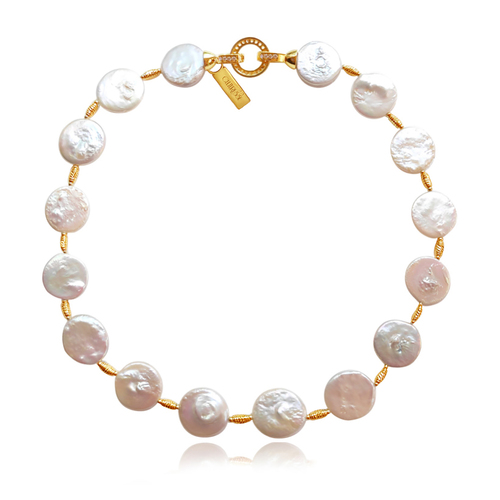 Timeless pearl elegance with a royal touch. Introducing Henrietta 18K Freshwater Pearl Necklace / Choker - an artisan natural pearl beauty for your upper class styling. This piece features natural coin-shaped freshwater pearls each with unique textures and stunning lustre. Each pearl is handpicked to ensure the consistency of size. Each pearl is connected to the next via gold pieces in a coil style, made of environmentally friendly brass (nickel free) with 18K gold plating. The clasp features a dural design with a round loop in the middle, attached to 2 hook style loops embellished with white zircons. A classic and quality pearl beauty that endures with time and trends. Hypoallergenic, nickel, cadmium and lead free.