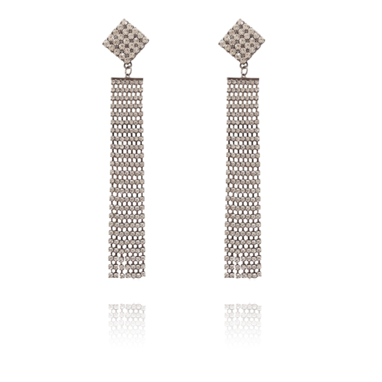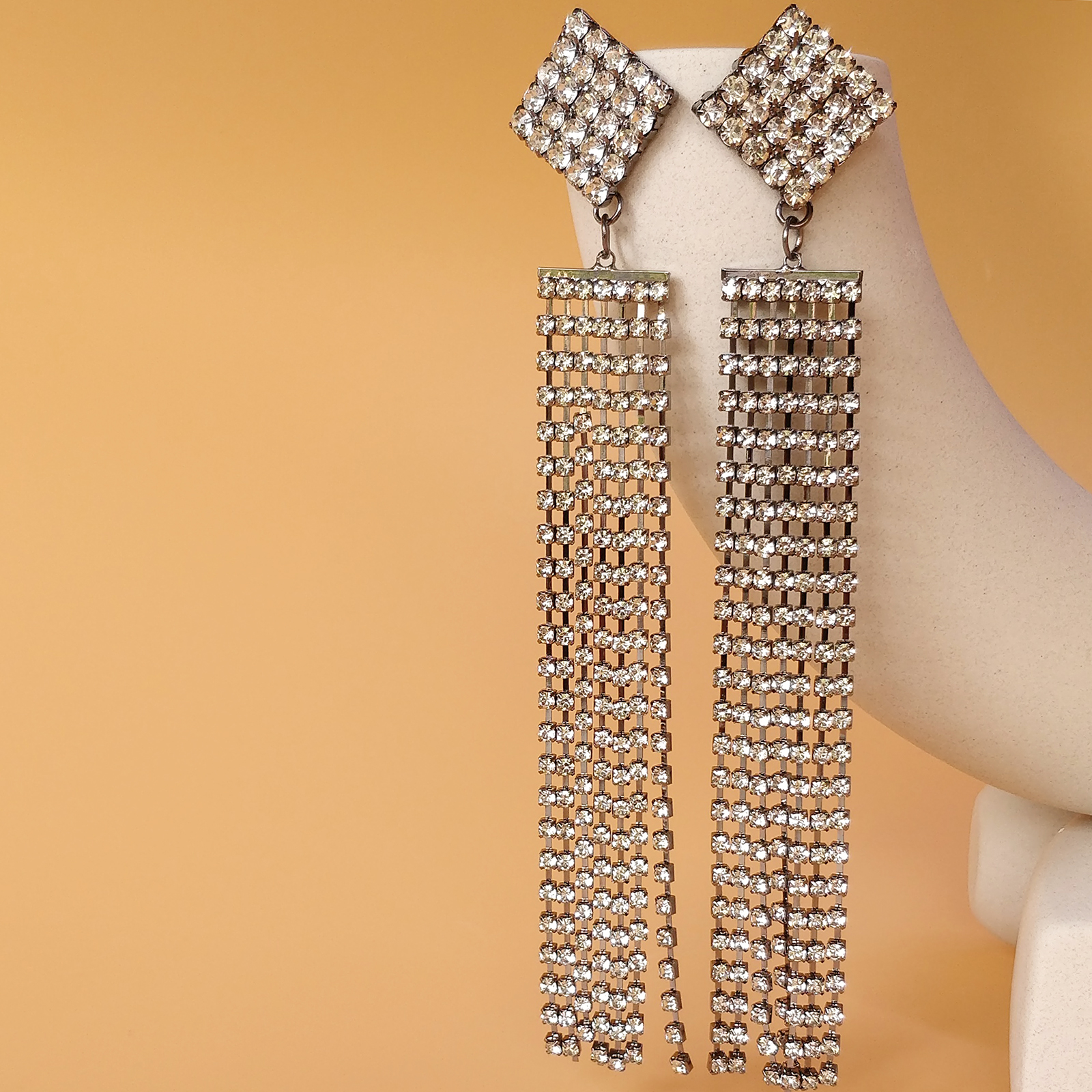 Time for a higher attitude. introducing Higher Attitude Statement Earrings - eye-catching runway style statement earrings with an attitude. This design incorporates geometric elements as well as glamours crystal-encrusted diamante tassels that create different movements as you move. Perfect for fashion events, bold styles, dressy styles and extravagant styling. Available for both pierced and non-pierced ears.