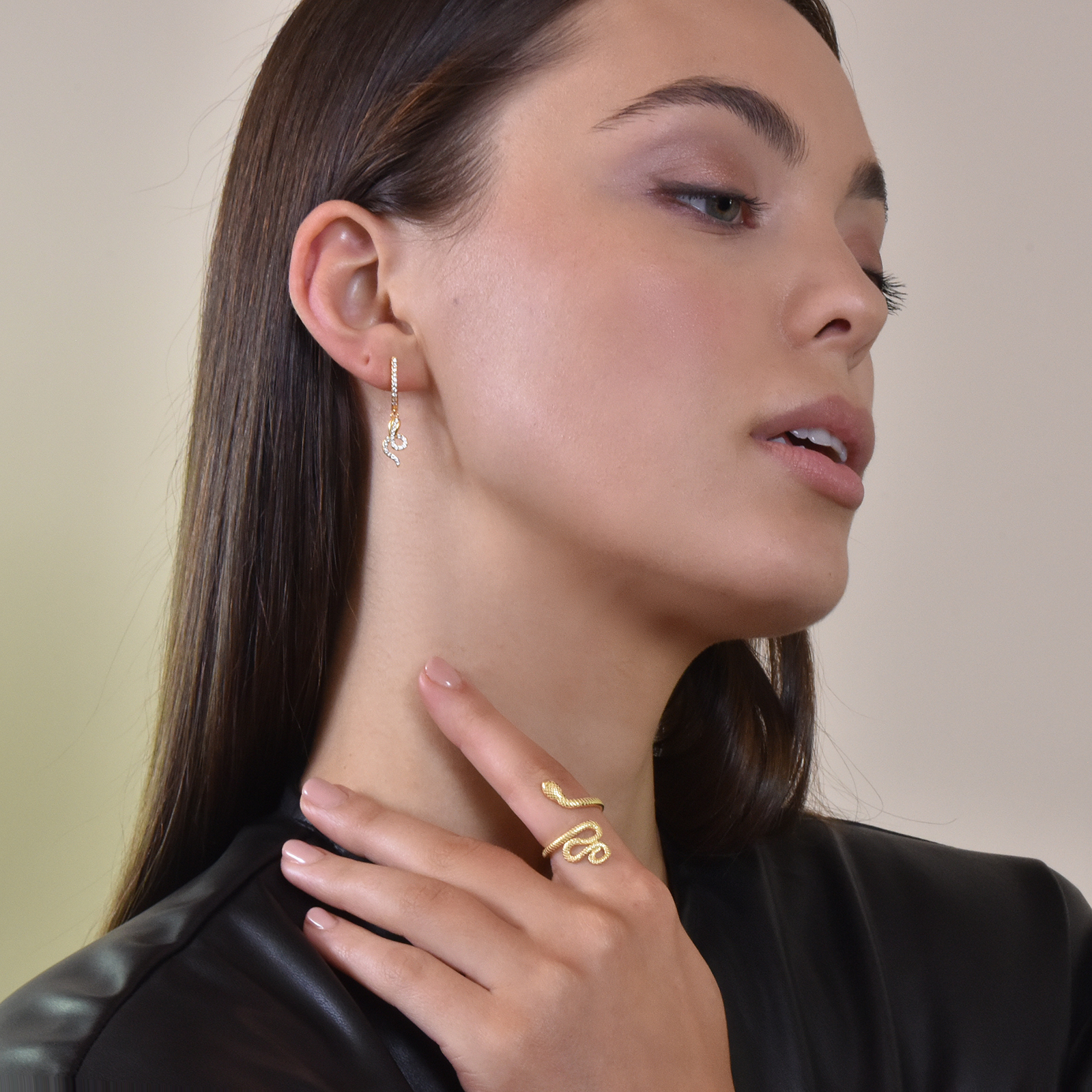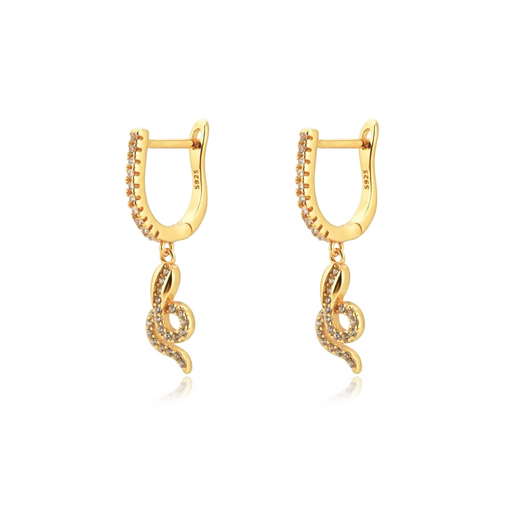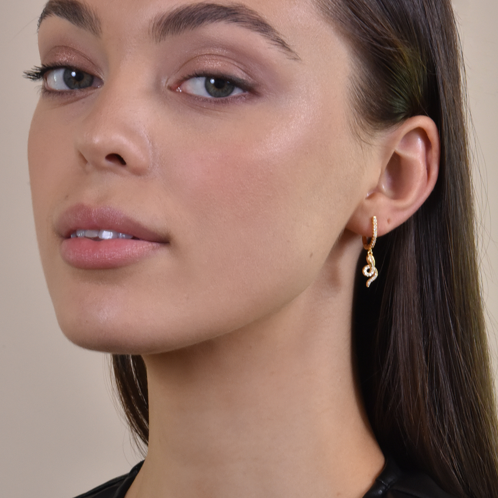 Trendy serpent earrings with a fine make and attitude. Introducing Huxley Fine Diamante Serpent Drop Earrings - a stylish, enduring and detail-rich ear love for your elevated chic styling. This design is inspired by ‘The Garden of Eden’ featuring curled serpent drops attached to U-shaped huggies. The outer side of the U huggies and the entire serpent drops are embellished with high quality Austrian zirconias. The earrings are made of solid sterling silver with 2.5 microns of 18k gold plating (to Gold Vermeil Jewellery Standards). Each piece is of a very comfortable weight for all day wearing. Perfect for modern, fine, chic, minimalist, earring layering, girly, punk, casual, everyday styles and more. Hypoallergenic, nickel, cadmium and lead free.